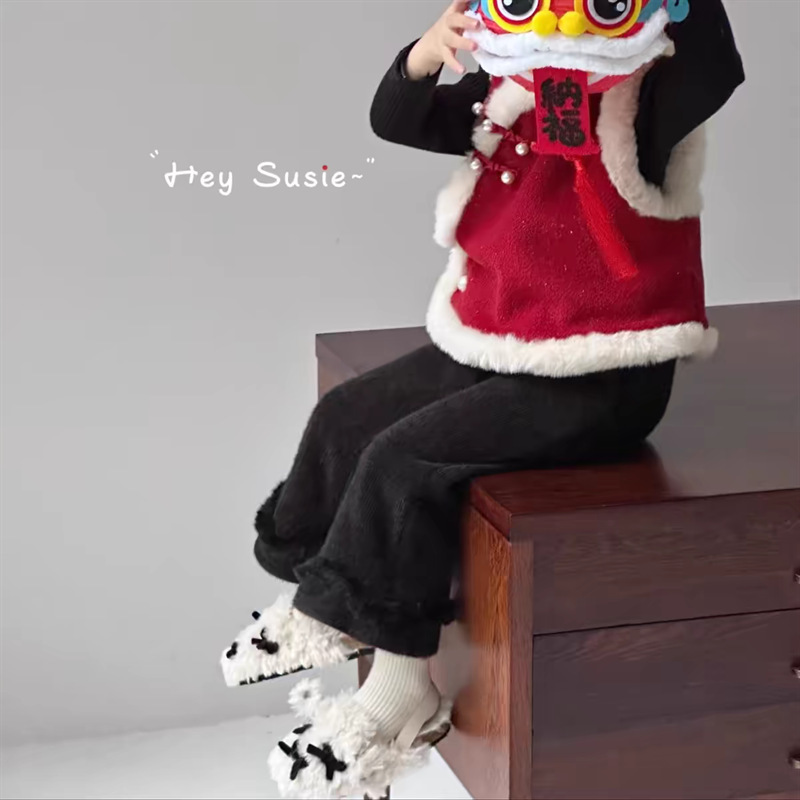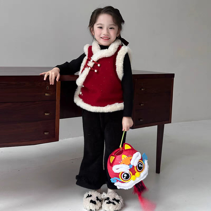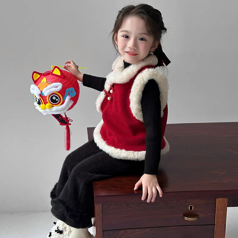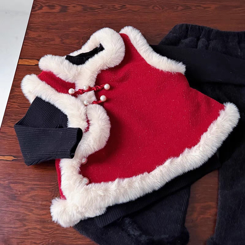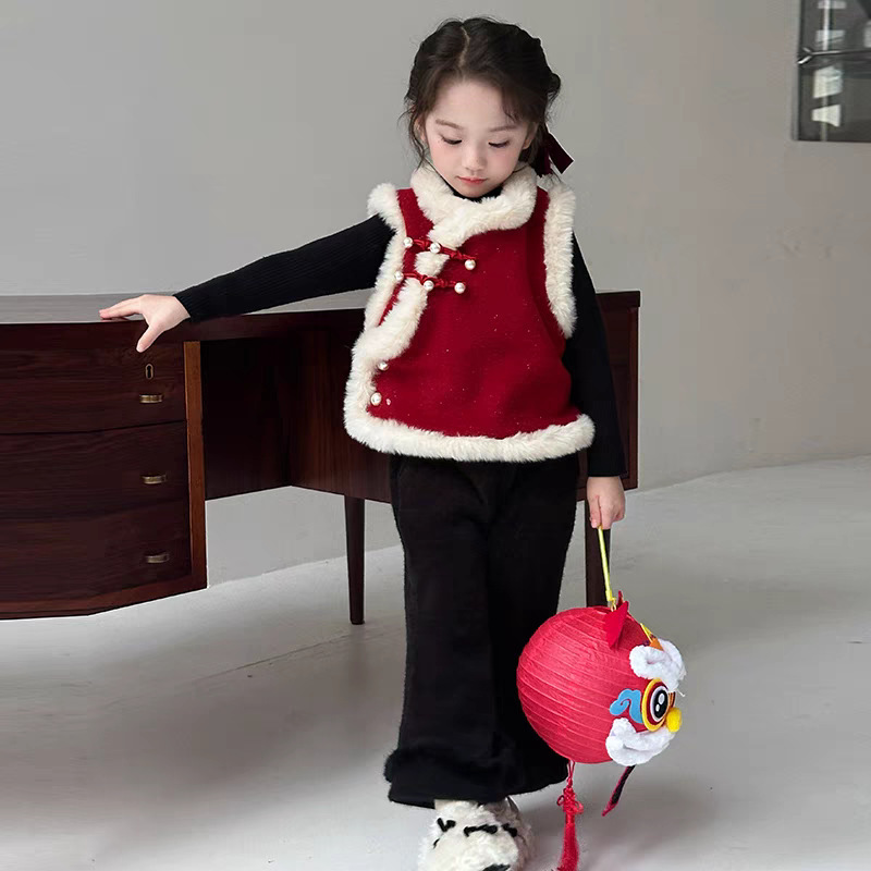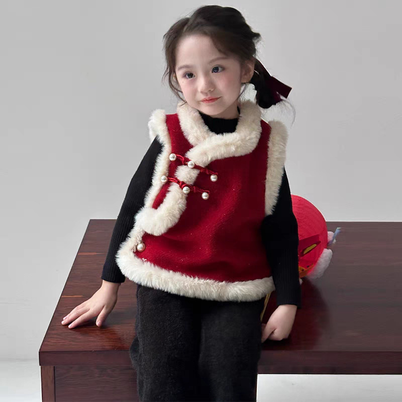 달콤한 소녀풍 단추 장식과 벨벳 안감이 있는 새로운 중국 스타일의 빨간 조끼, 털소매로 새해를 맞이하는 축제적인 신상 의류