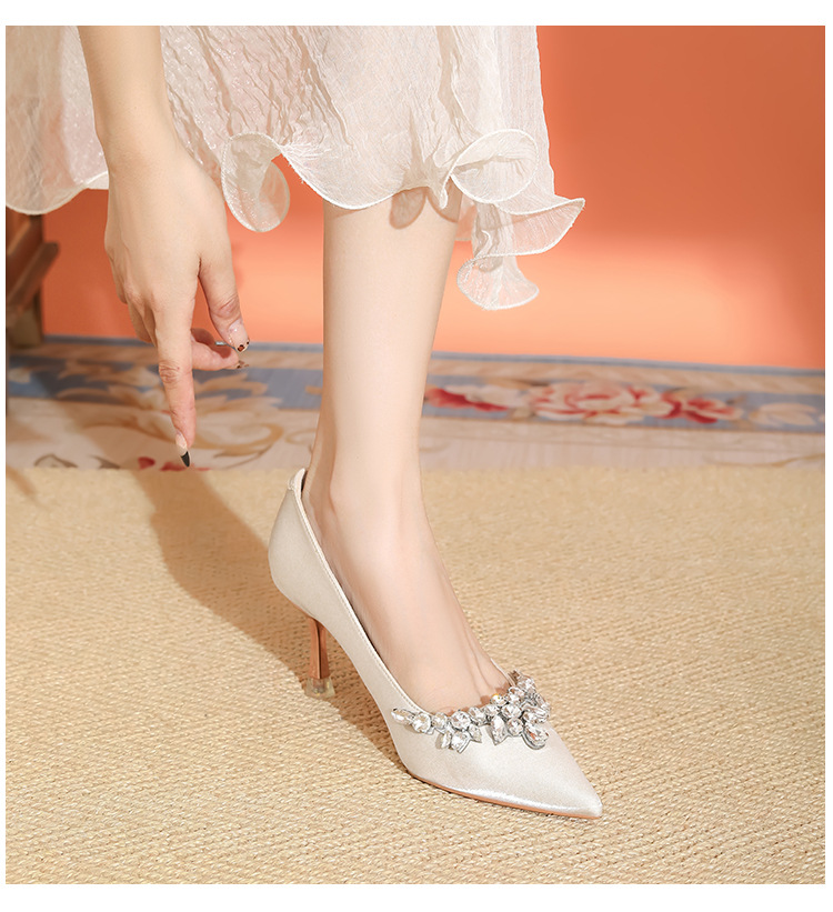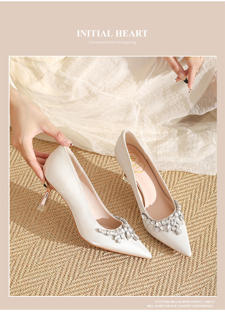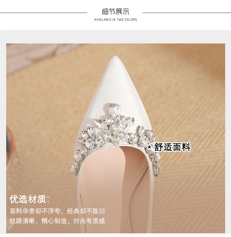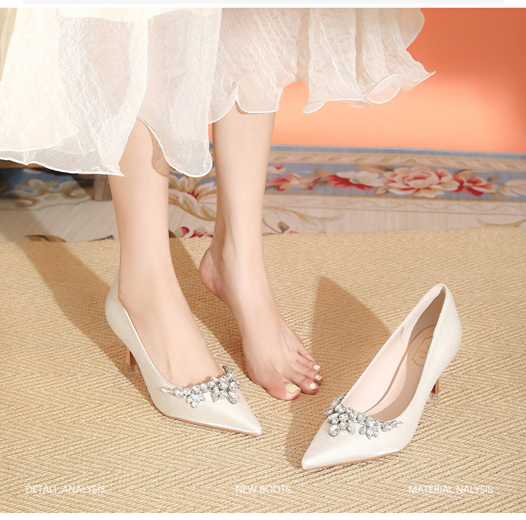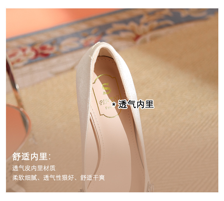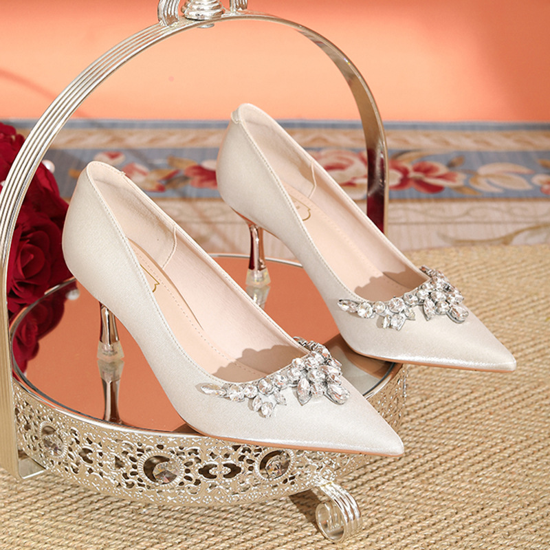 프랑스 스타일 라인스톤 살구색 새틴 하이힐 여성 시뉴헤 웨딩 원피스 신부 신발 투웨어 얕은 스틸레토 힐 피곤하지 않은 발 신발스토어 가기