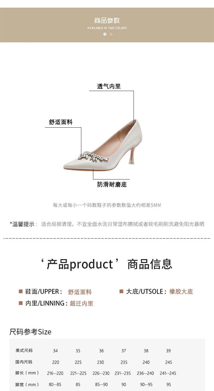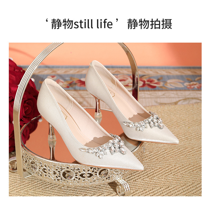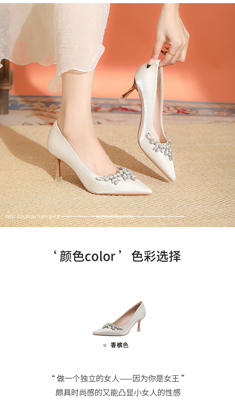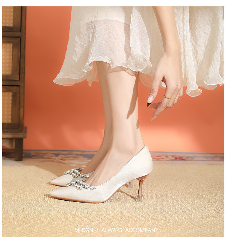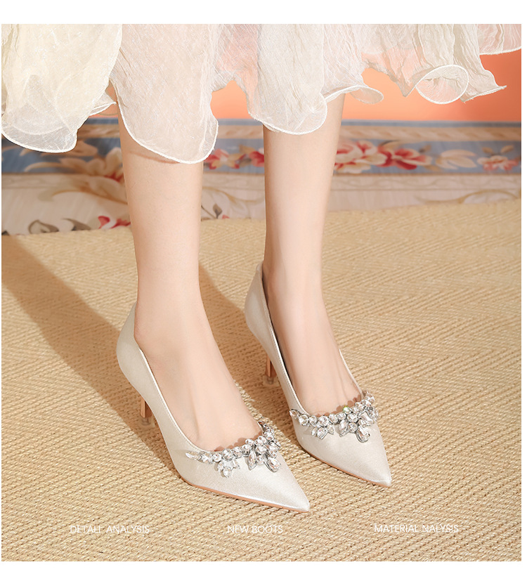 프랑스 스타일 라인스톤 살구색 새틴 하이힐 여성 시뉴헤 웨딩 원피스 신부 신발 투웨어 얕은 스틸레토 힐 피곤하지 않은 발 신발스토어 가기