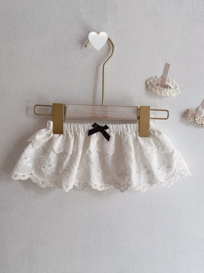 한국식 아동복 2025 봄 새 스타일 레이스 보우 방귀 커튼 아기 레이스 스커트 앞치마 소녀의 쌓인 면화
