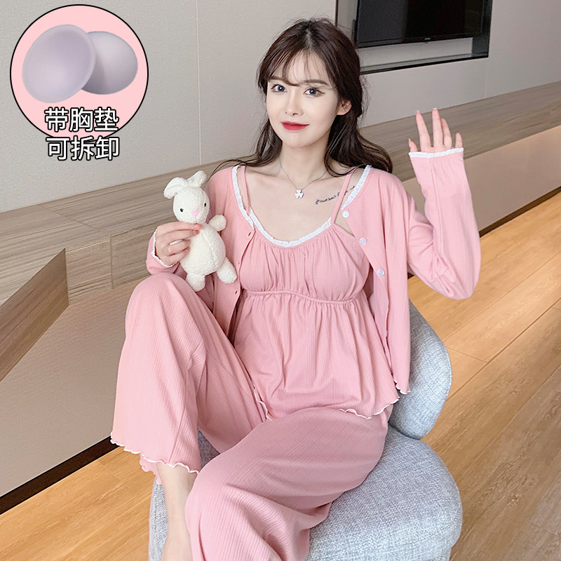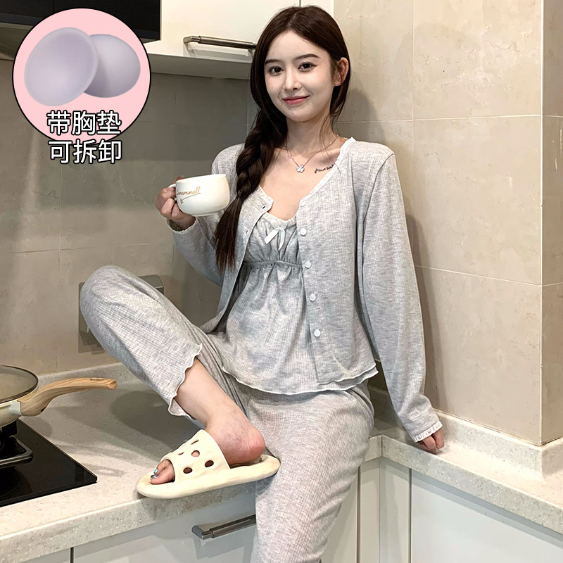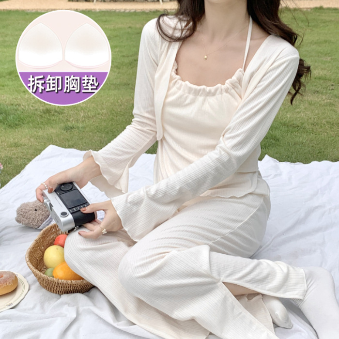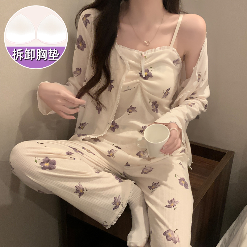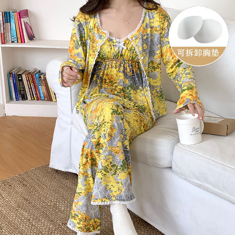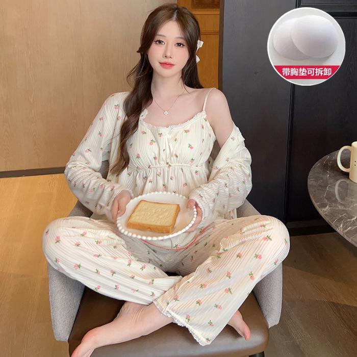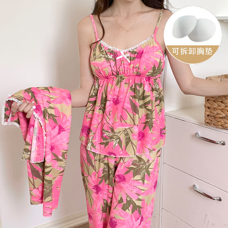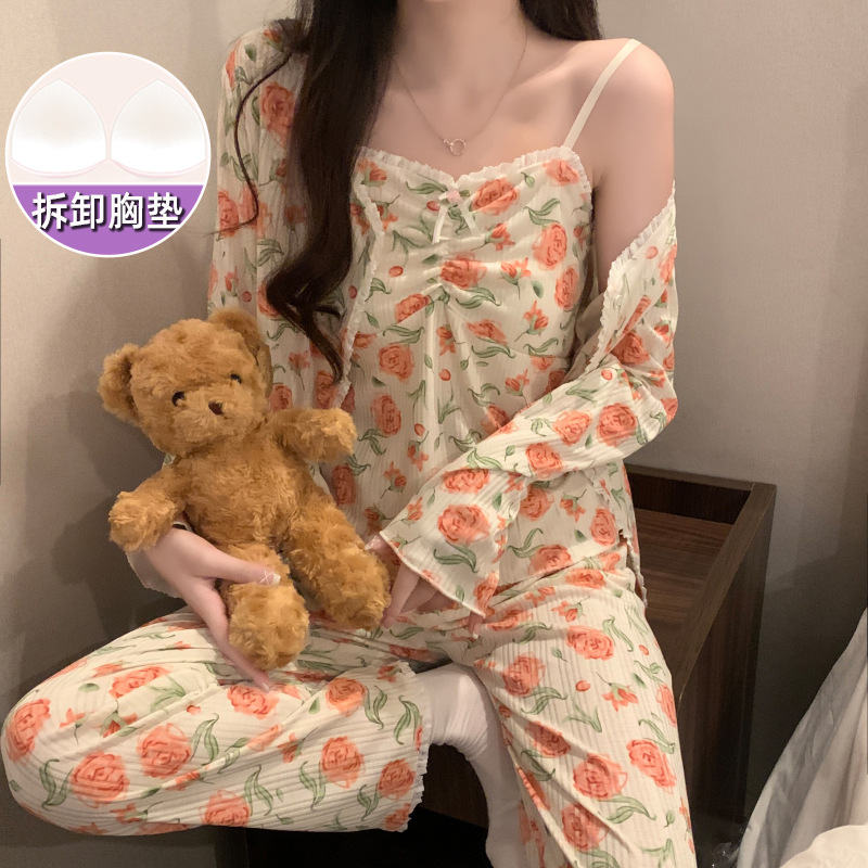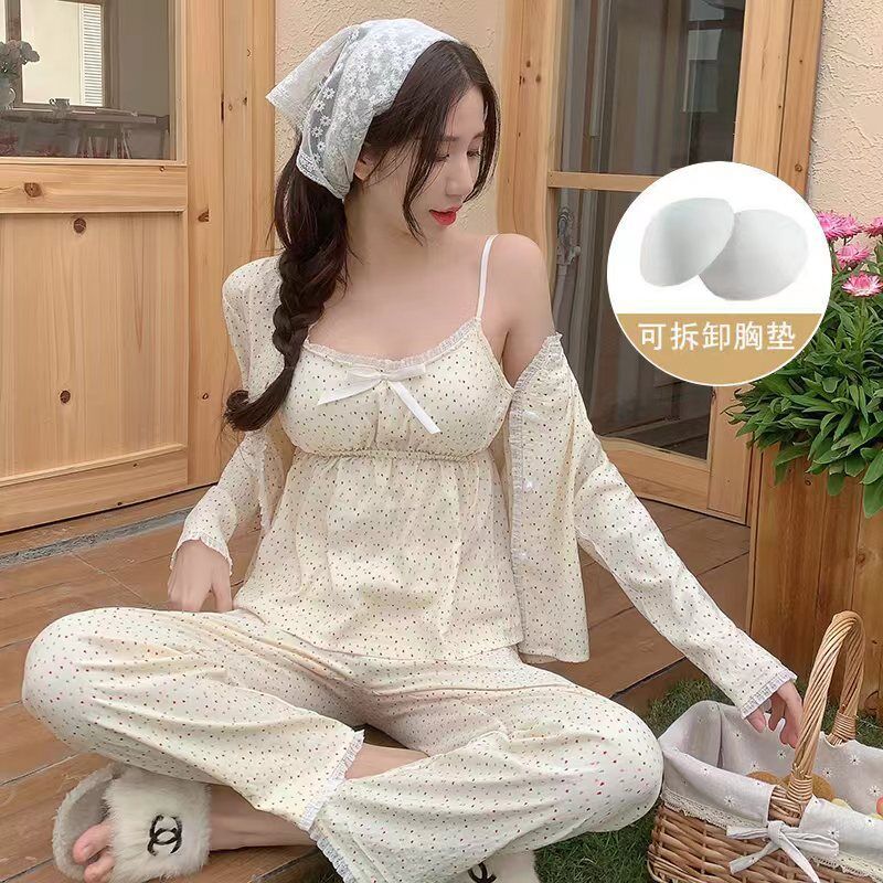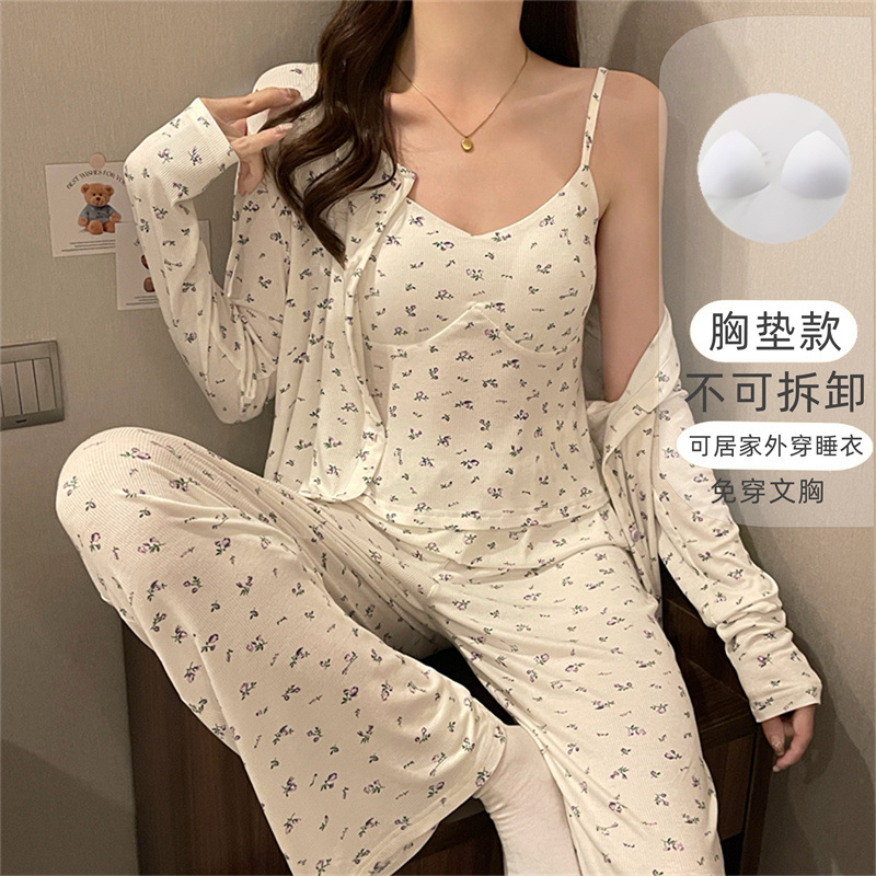 가슴 패드가 달린 잠옷 여성 봄과 가을면 작은 꽃 3 조각 세트 신선하고 순수한 스타일 섹시한 슬링 홈 옷스토어 가기