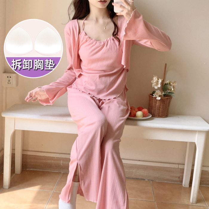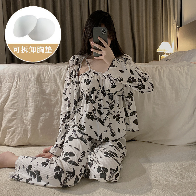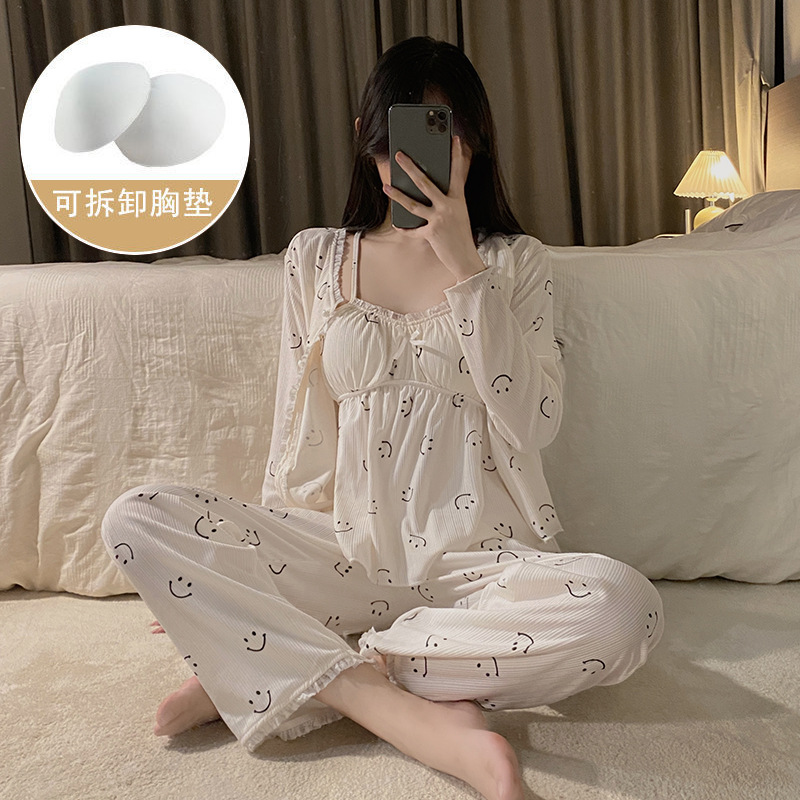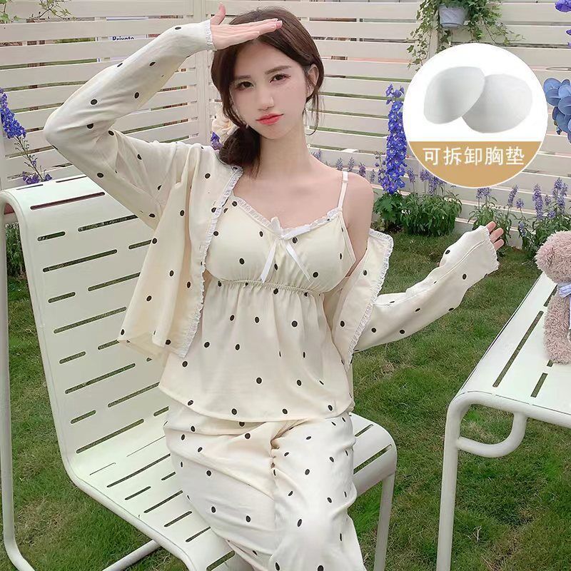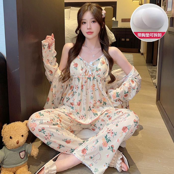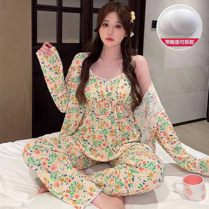 가슴 패드가 달린 잠옷 여성 봄과 가을면 작은 꽃 3 조각 세트 신선하고 순수한 스타일 섹시한 슬링 홈 옷