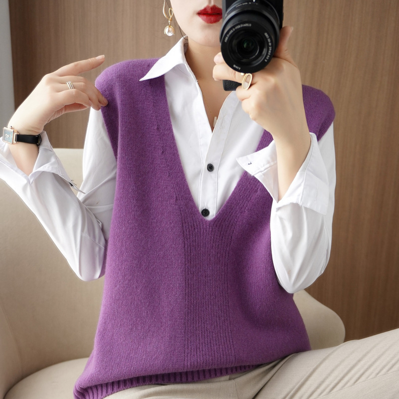 양모 블렌드 2024 가을 겨울 여성의 새로운 짧은 느슨한 대형 V 넥 솔리드 컬러 풀오버 니트 조끼 착용스토어 가기