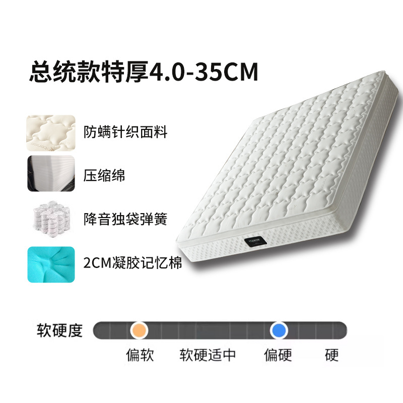• 프레지던트 특대 4.0 · 수면감 : 부드러움 - 35cm [튜브형 사일런트 스프링 + 압축면 + 젤 메모리폼 + 면 2030 진드기 방지 원단]
