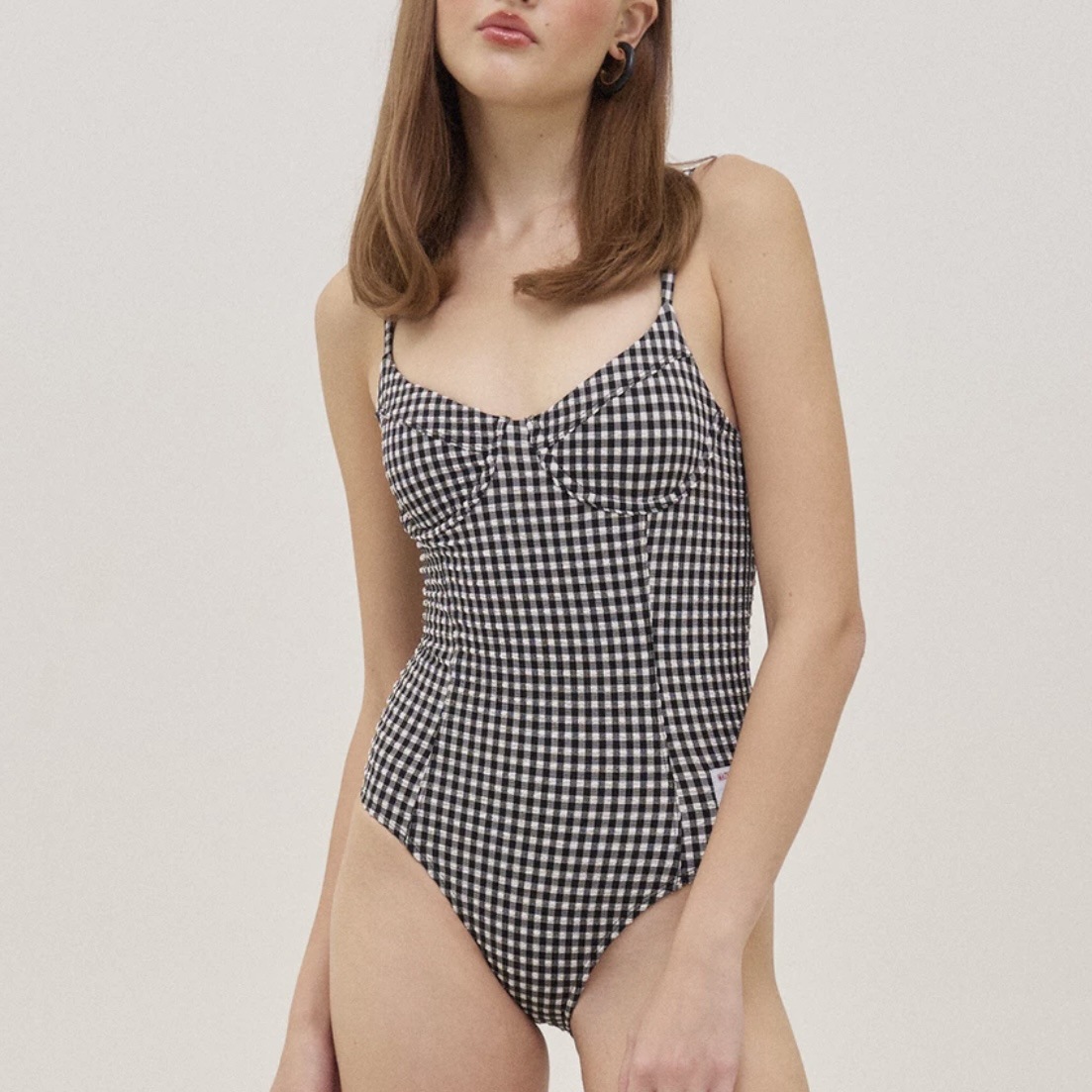 새로운 레트로 도파민 일본 격자 무늬 섹시한 작은 유방 배꼽을 덮는 슬림 보수적 스파 휴가 수영복스토어 가기