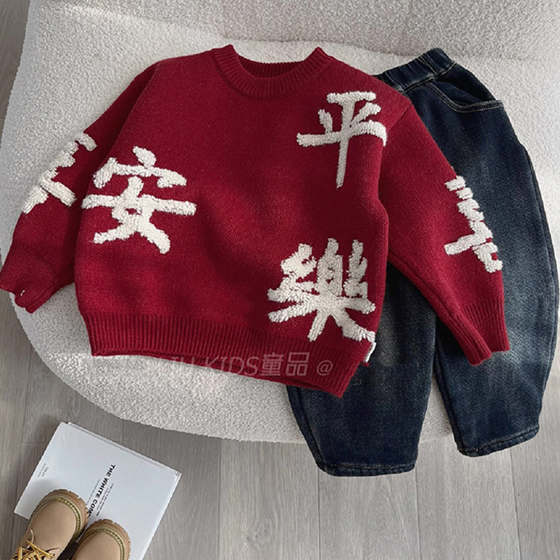 남녀 아동용 스웨터, 2026년 가을 겨울 신상품, 중국풍 빨간색 축제 아기 새해맞이 니트 스웨터 상의