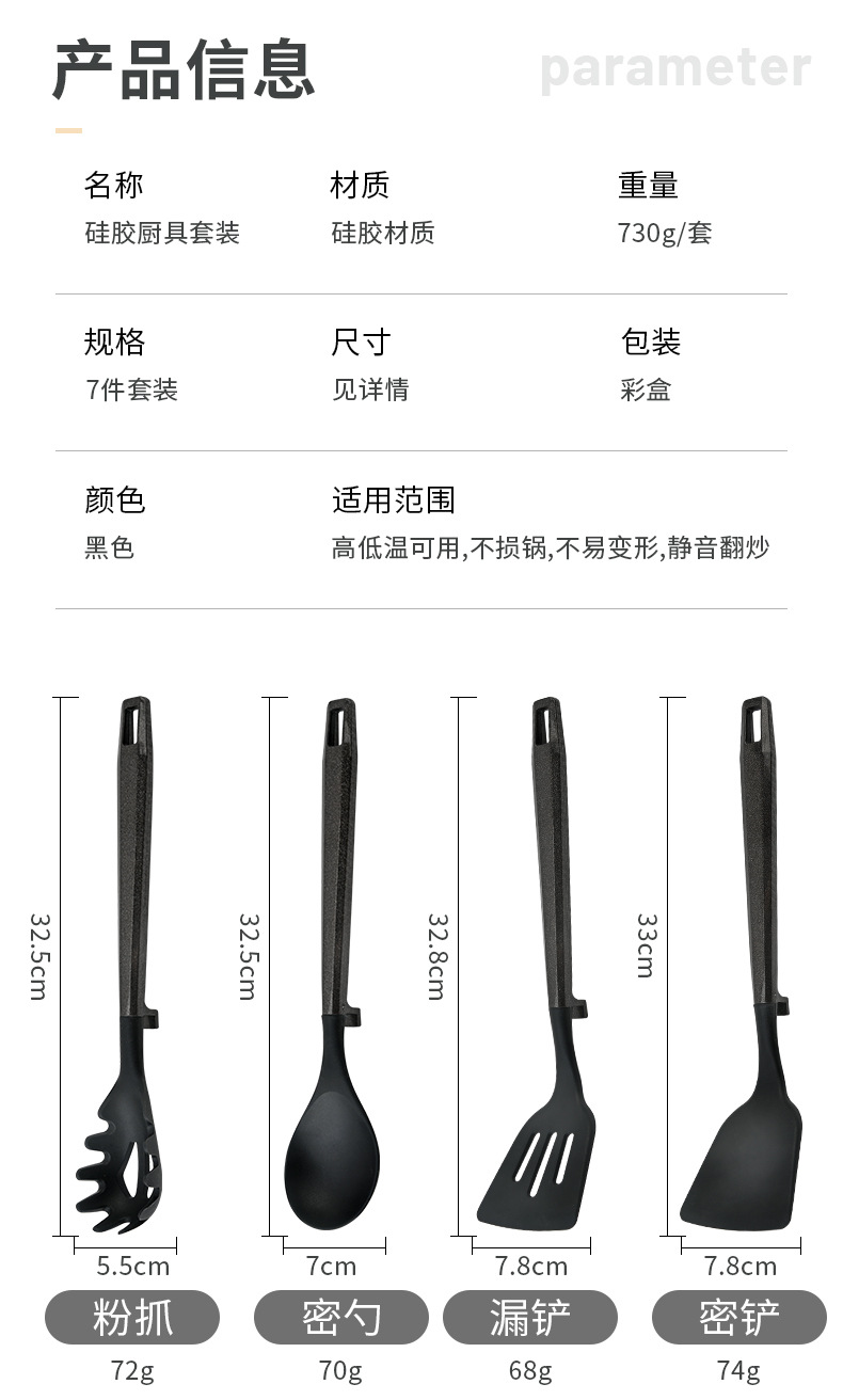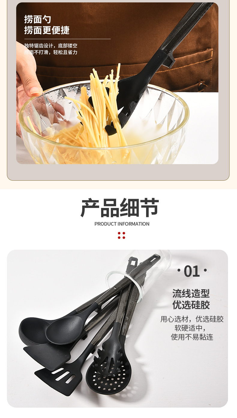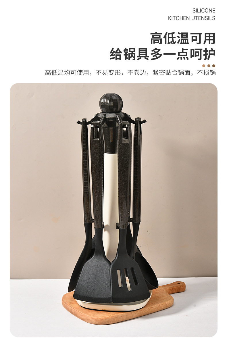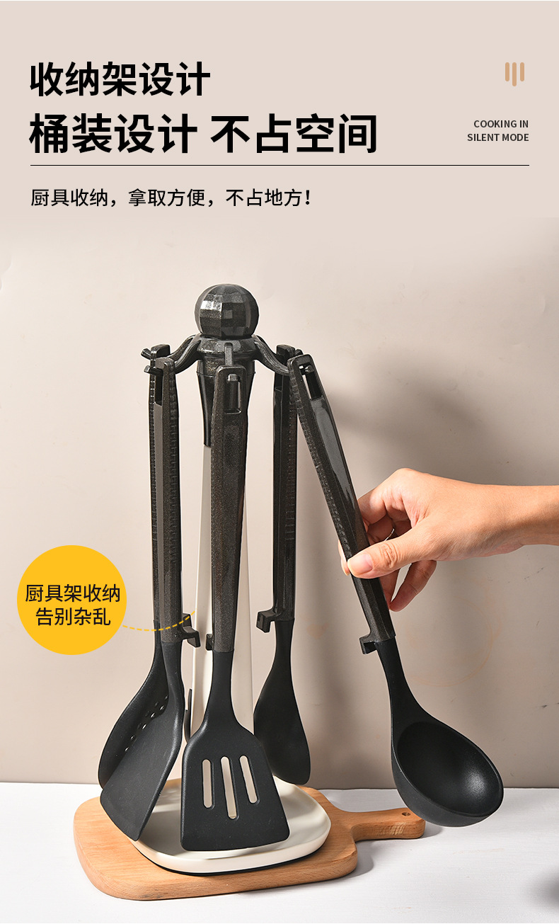 새로운 국경 실리콘 주방 용품 7 피스 세트는 주방 용품 고온 저항성 주걱 플라스틱 랙 삽 도구를 요리 할 수 있습니다.스토어 가기