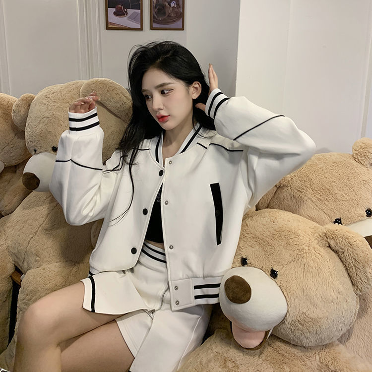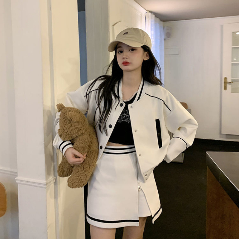 아메리칸 스타일 레트로 야구 세트 세트 여자 한국 스타일 세련된 짧은 코트 높은 허리 스커트 봄과 가을 투피스 세트스토어 가기
