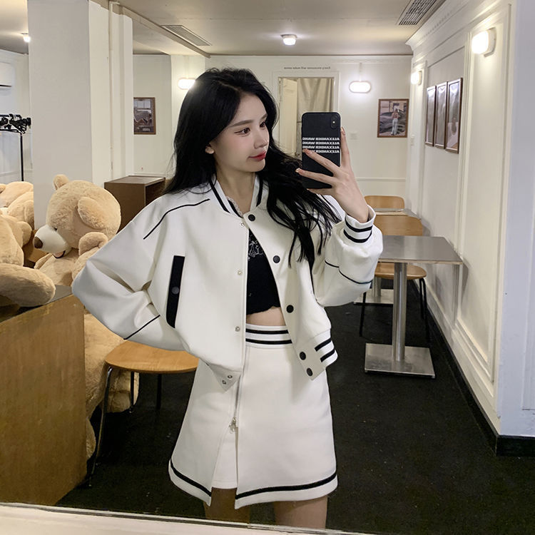 아메리칸 스타일 레트로 야구 세트 세트 여자 한국 스타일 세련된 짧은 코트 높은 허리 스커트 봄과 가을 투피스 세트