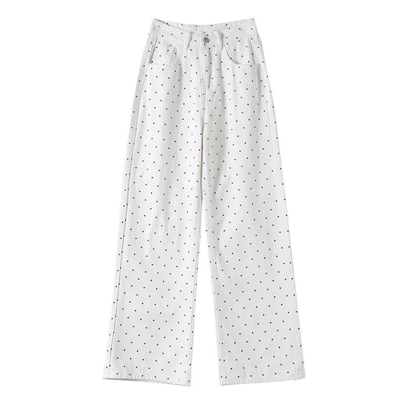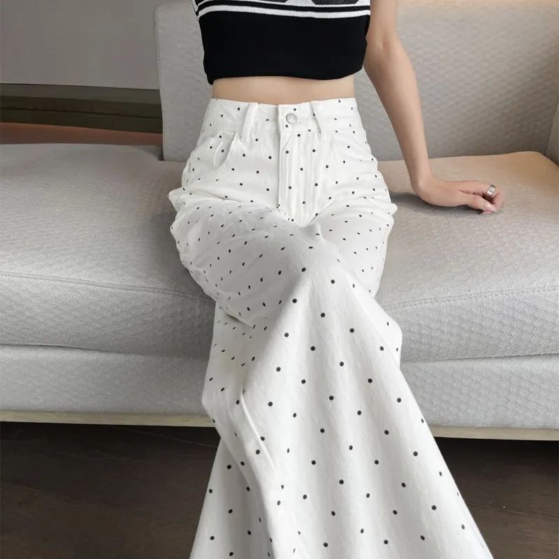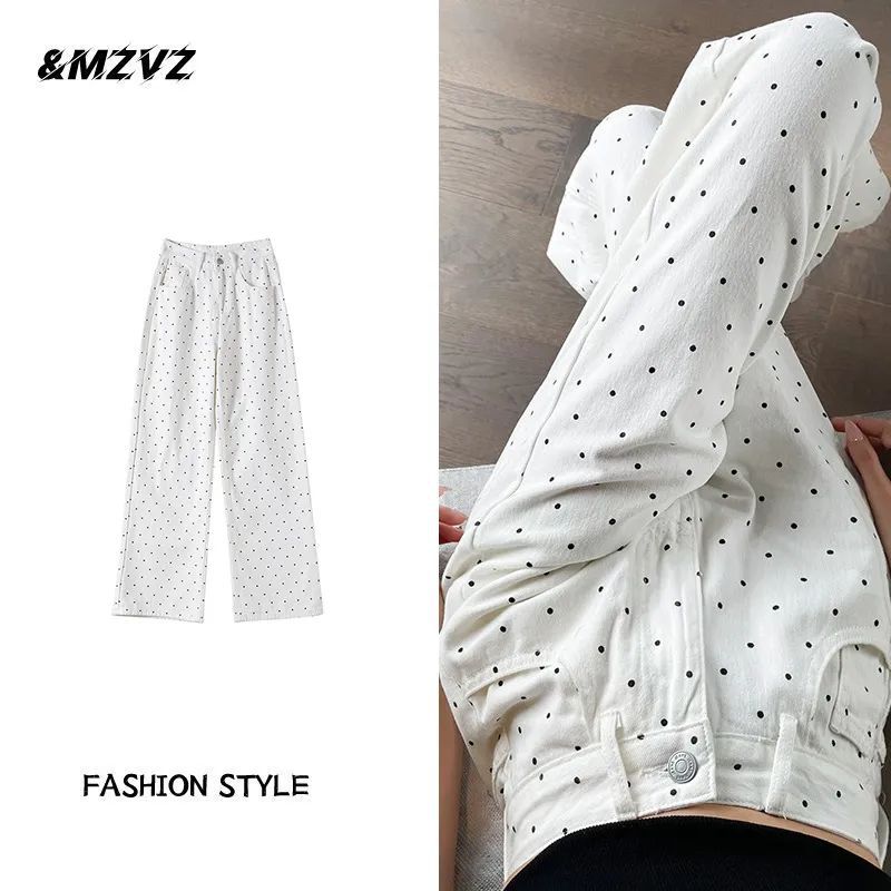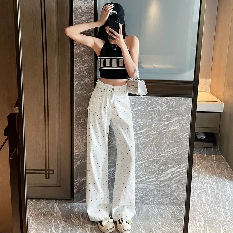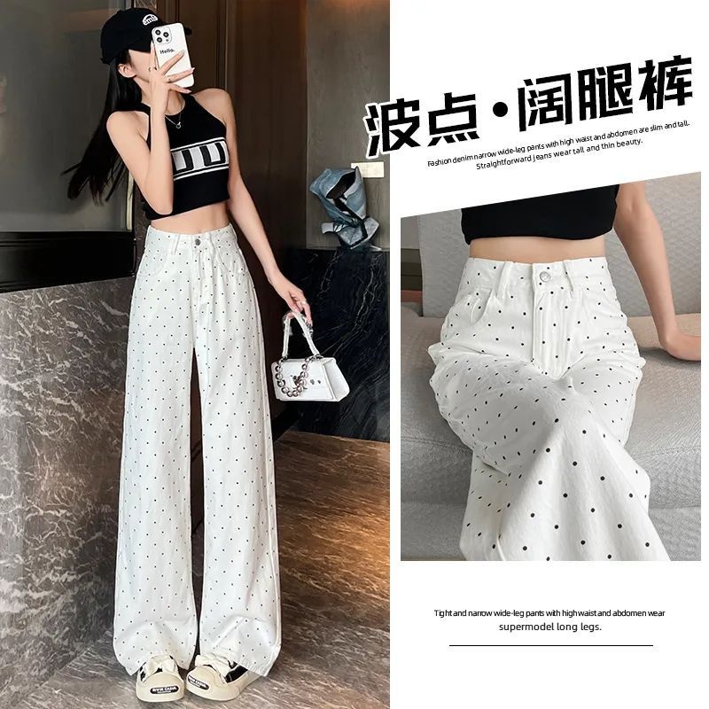 넓은 다리 스트레이트 설문 조사 점 청바지 여성의 가을 2024 한국식 장난기 느슨한 높은 허리 디자인 화이트 캐주얼 바지스토어 가기