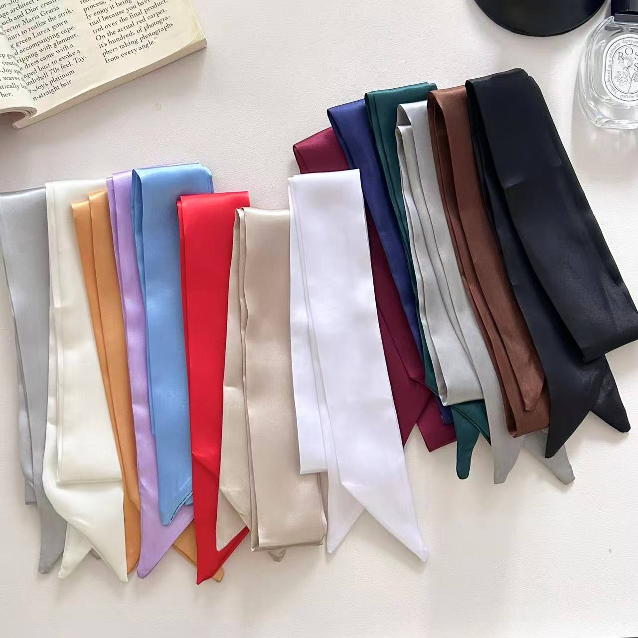 새로운 새틴 단색 스카프 얇은 좁은 긴 리본 프랑스 나비 가교 헤어 리본 우아한 올 매치 작은 스카프스토어 가기