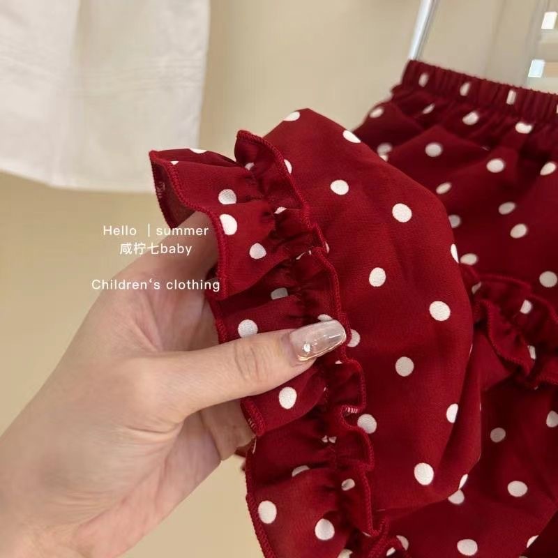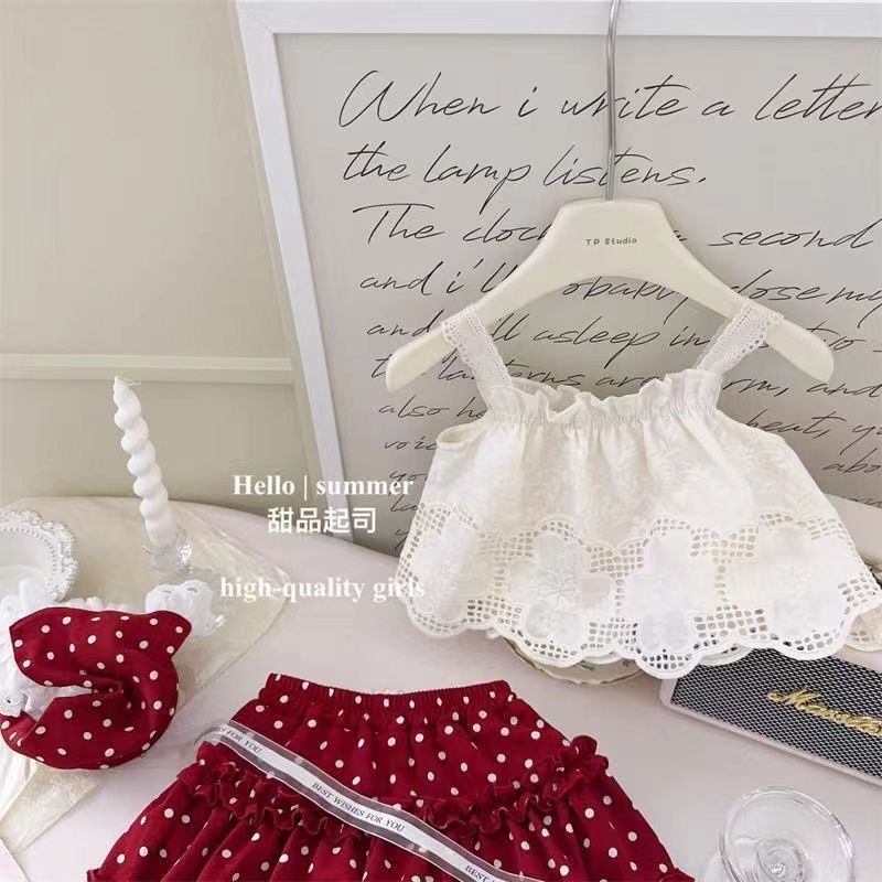 소녀 2025 새로운 슬링 세트 여름 귀여운 여성 크로 셰 스타일 조끼 웨이브 도트 바지 3 피스 세트
