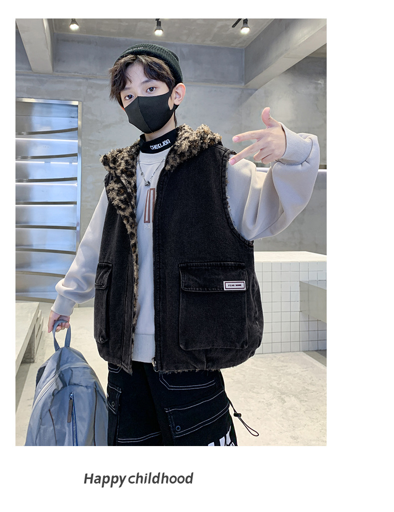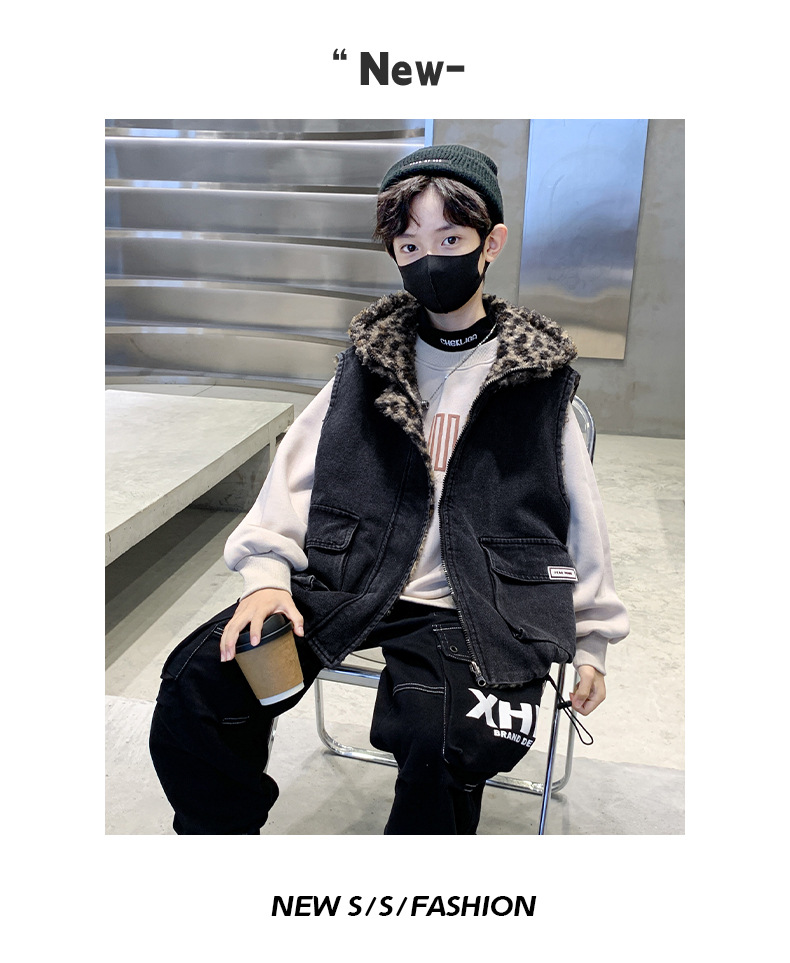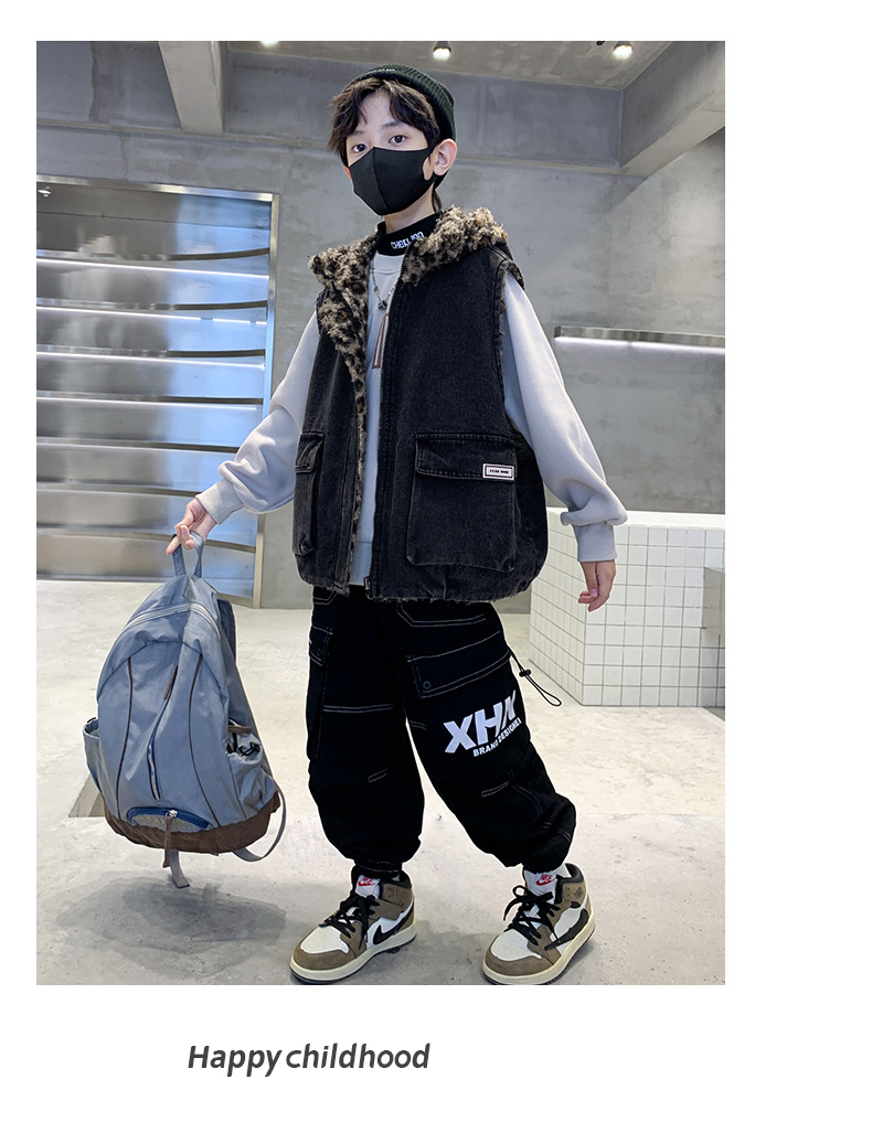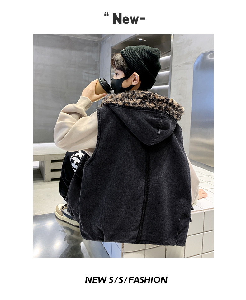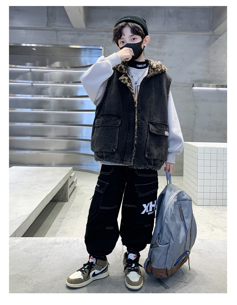 데님 조끼 소년의 봄 가을과 겨울 기모 어깨 허리 코트 어린이 2024 새로운 스타일 중대형 어린이 두꺼운 조끼 외부 착용스토어 가기