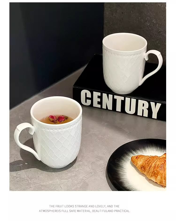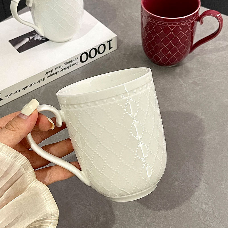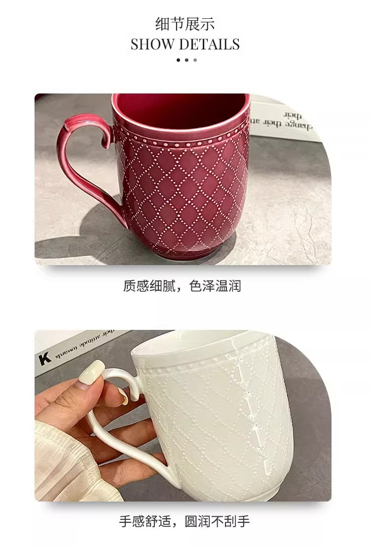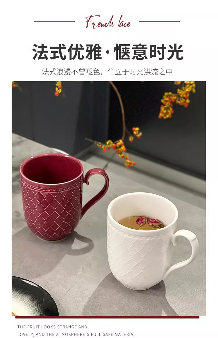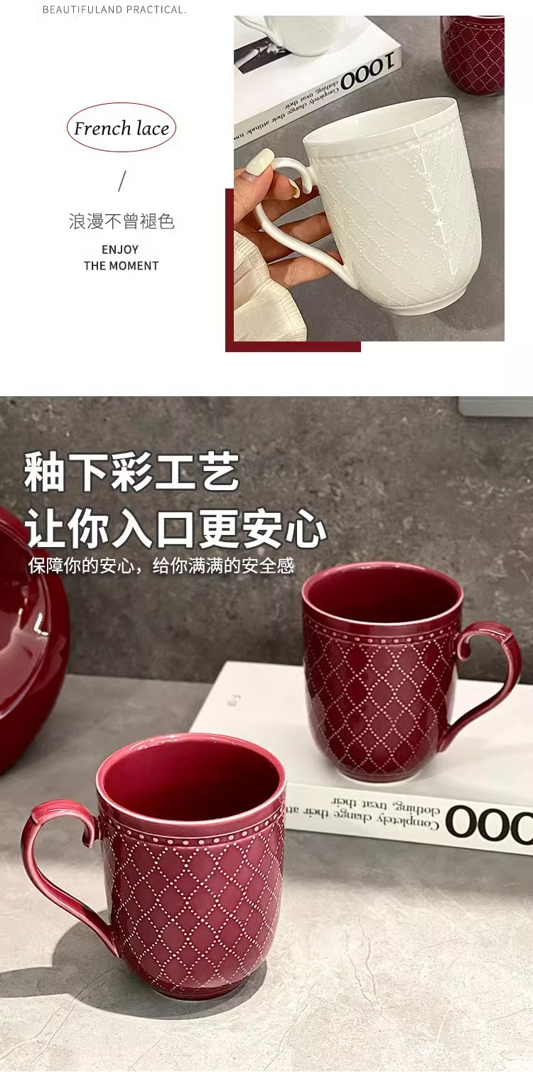 프랑스 Ins 스타일 양각 레이스 패턴 찻잔 가구 대용량 높은 색상 가치 커플 세라믹 머그잔 도매