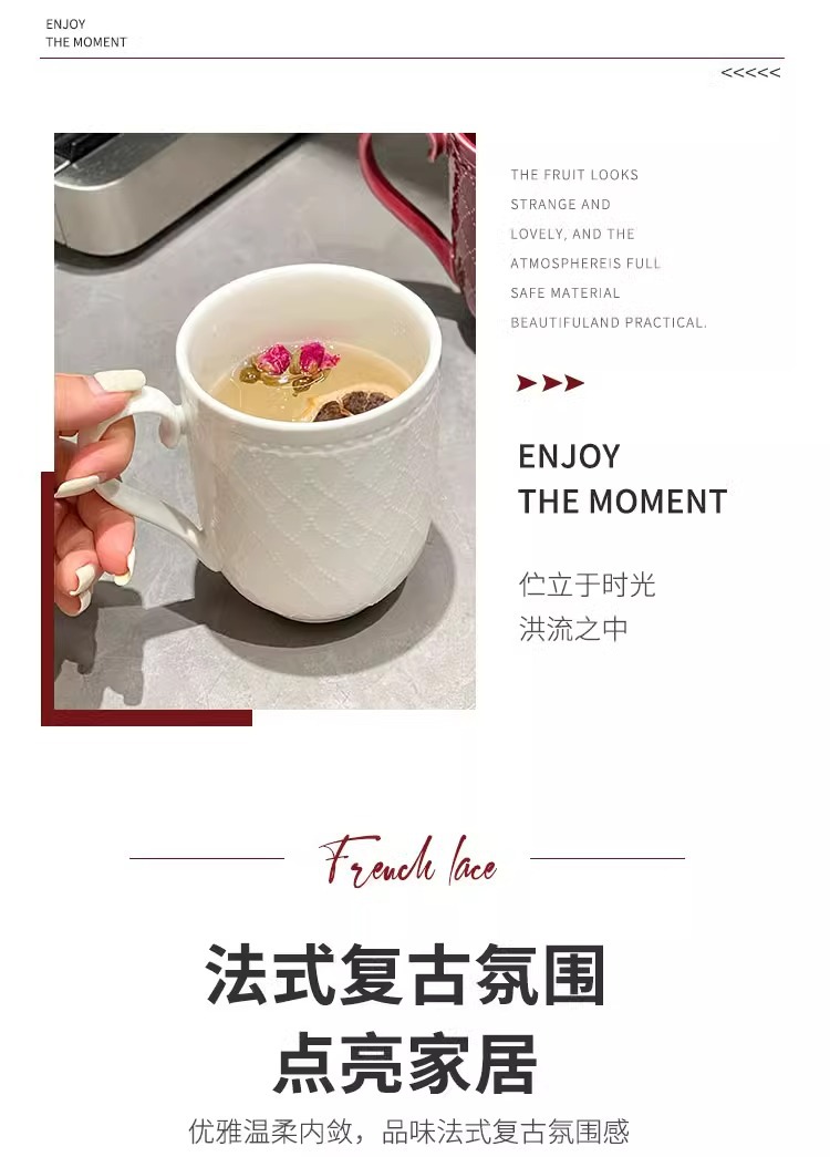 프랑스 Ins 스타일 양각 레이스 패턴 찻잔 가구 대용량 높은 색상 가치 커플 세라믹 머그잔 도매스토어 가기
