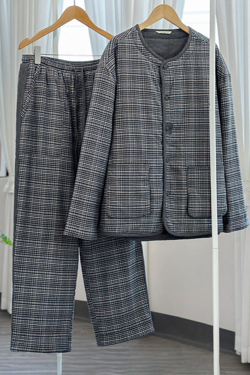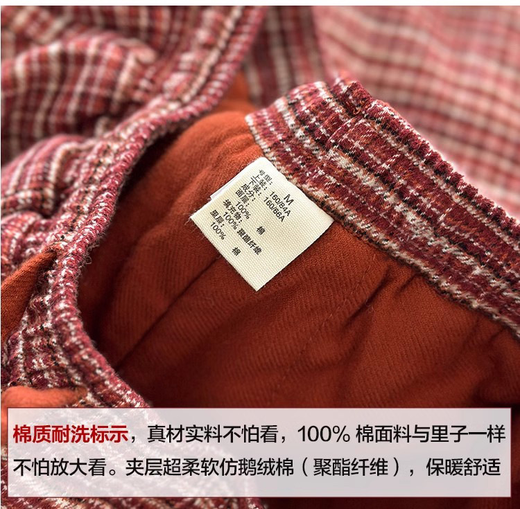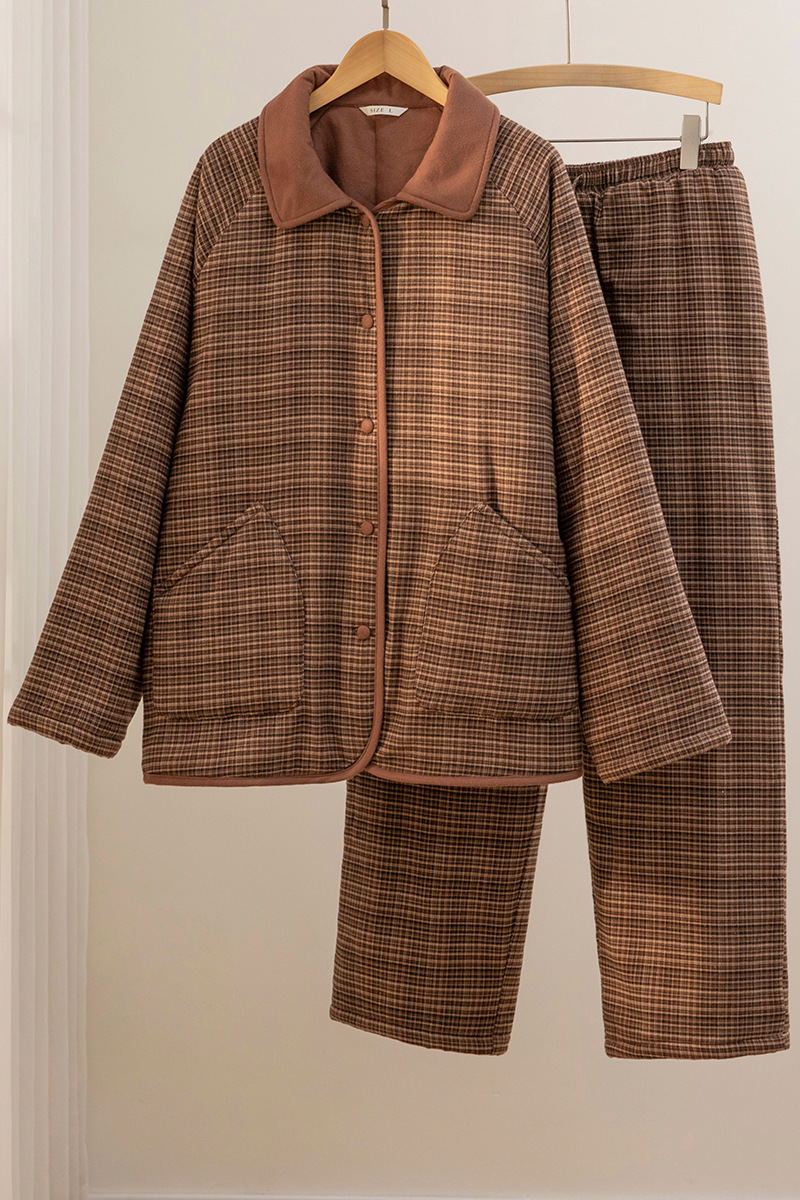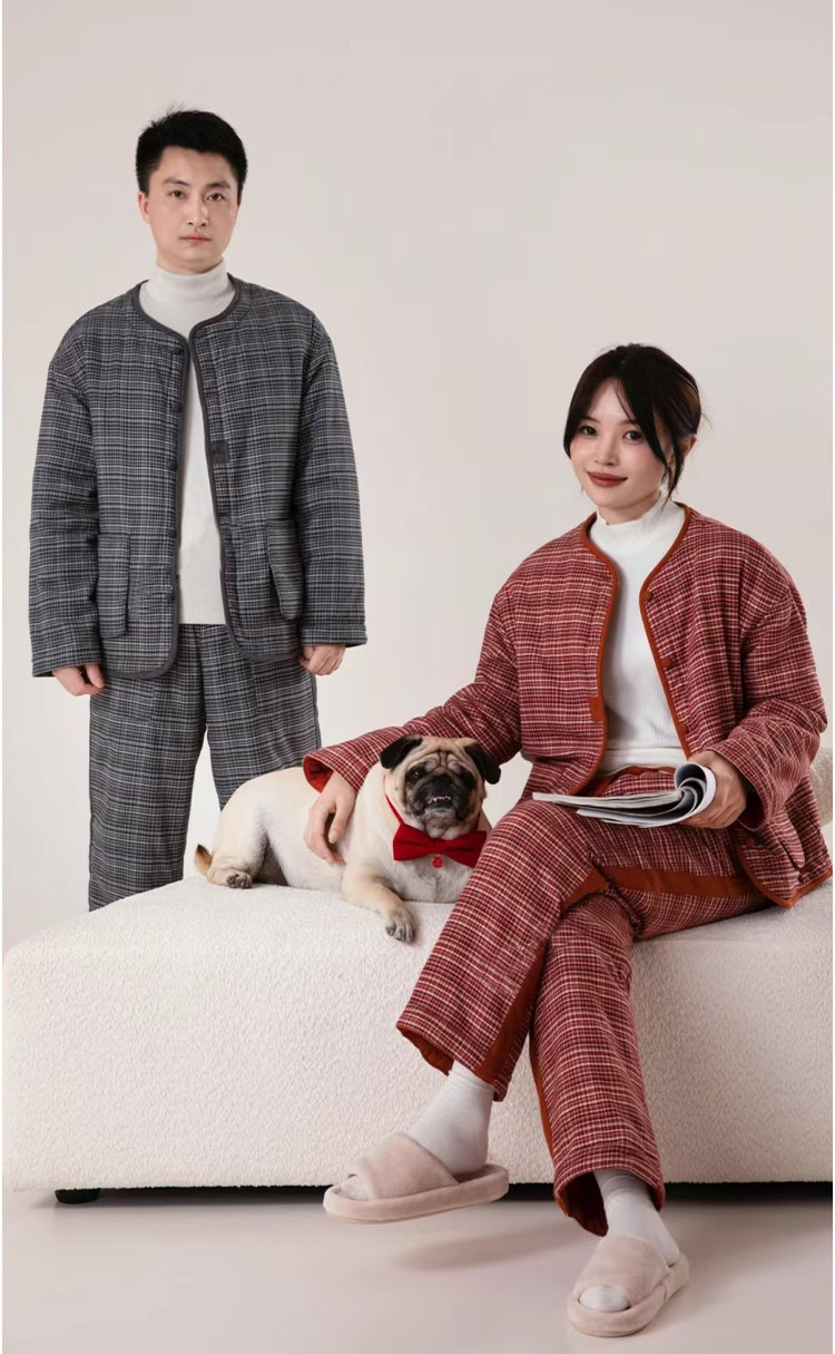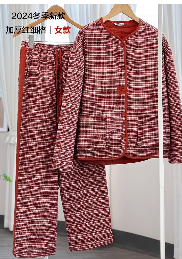 MUJI 일본식 좋은 제품 두꺼운 순면 플란넬 퀼트 파자마 여성면 패딩 코트 격자 남성용 홈 의류 세트