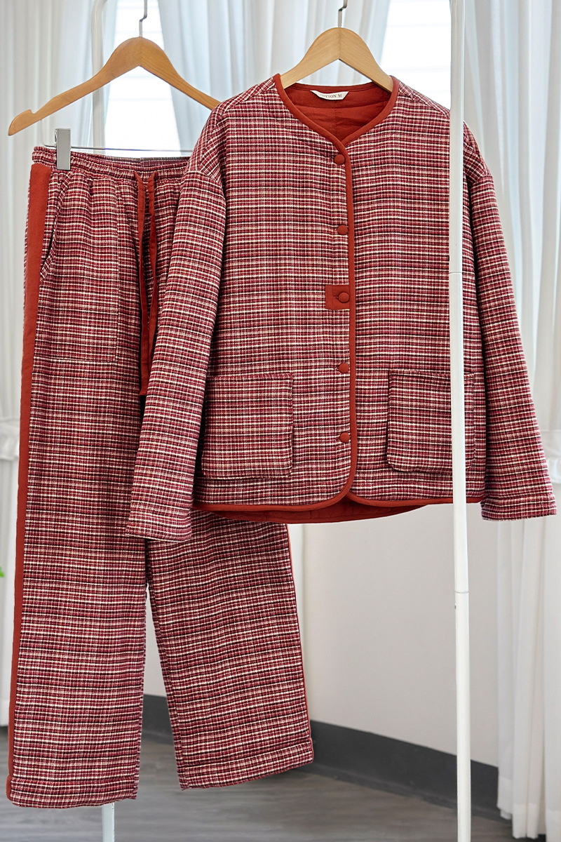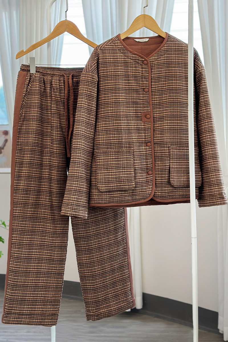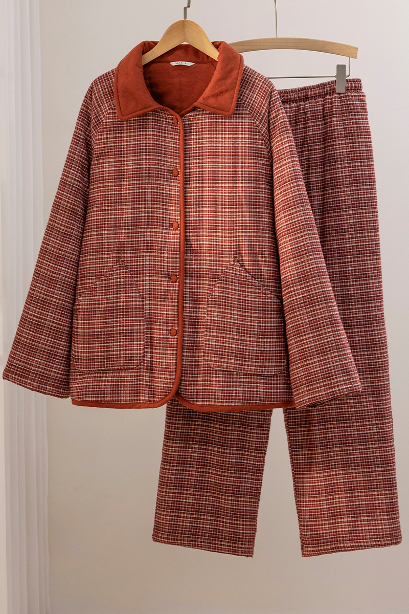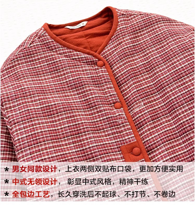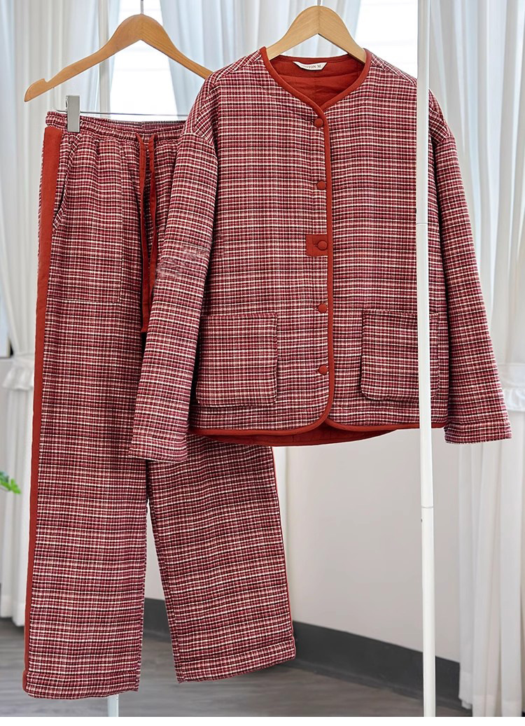 MUJI 일본식 좋은 제품 두꺼운 순면 플란넬 퀼트 파자마 여성면 패딩 코트 격자 남성용 홈 의류 세트