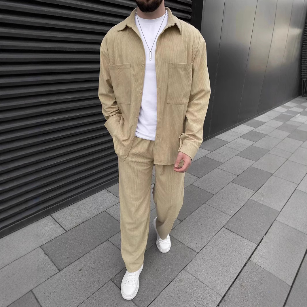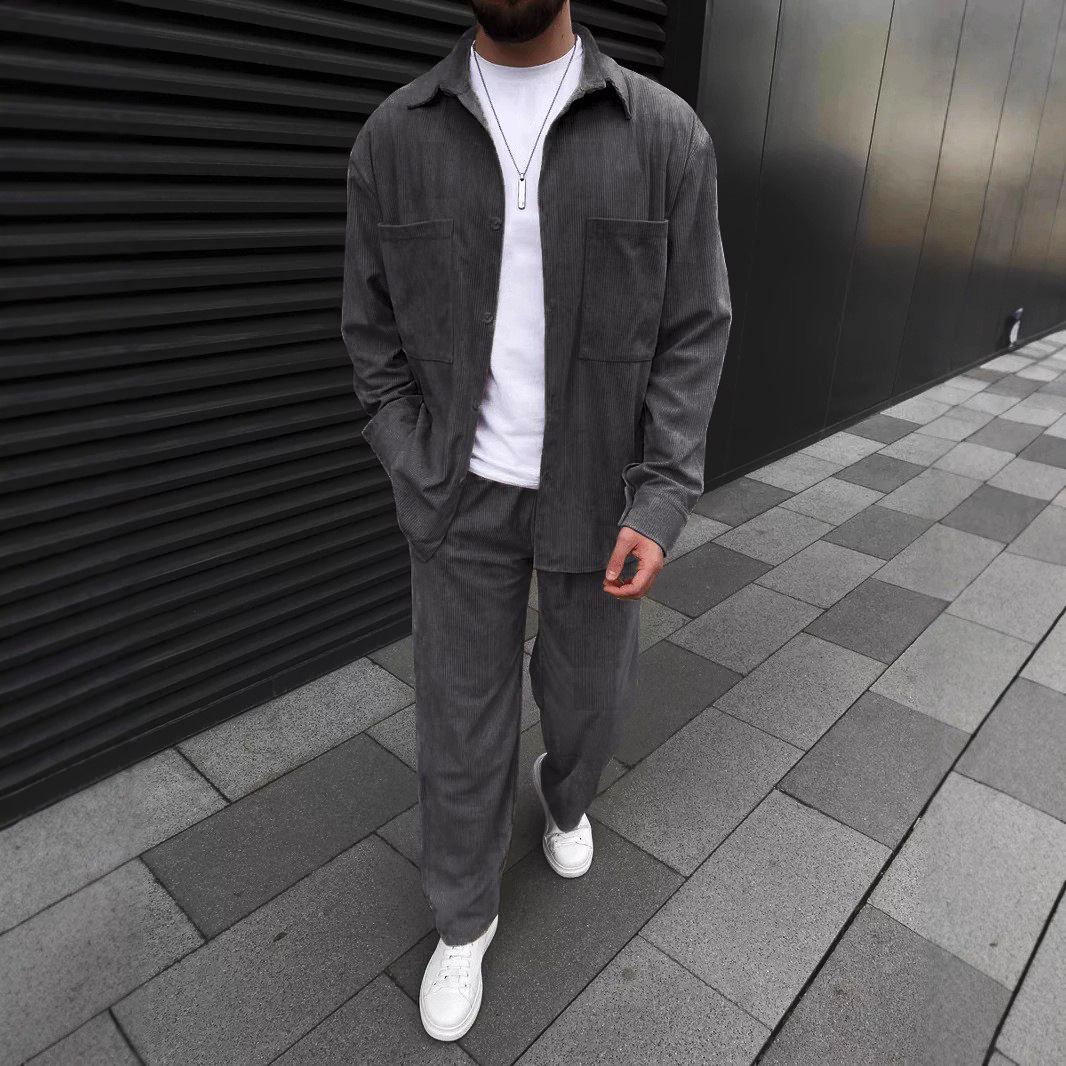 국경 2025 봄 유럽과 미국 남성 매일 레저 코듀로이 바지 긴팔 옷깃 셔츠 세트