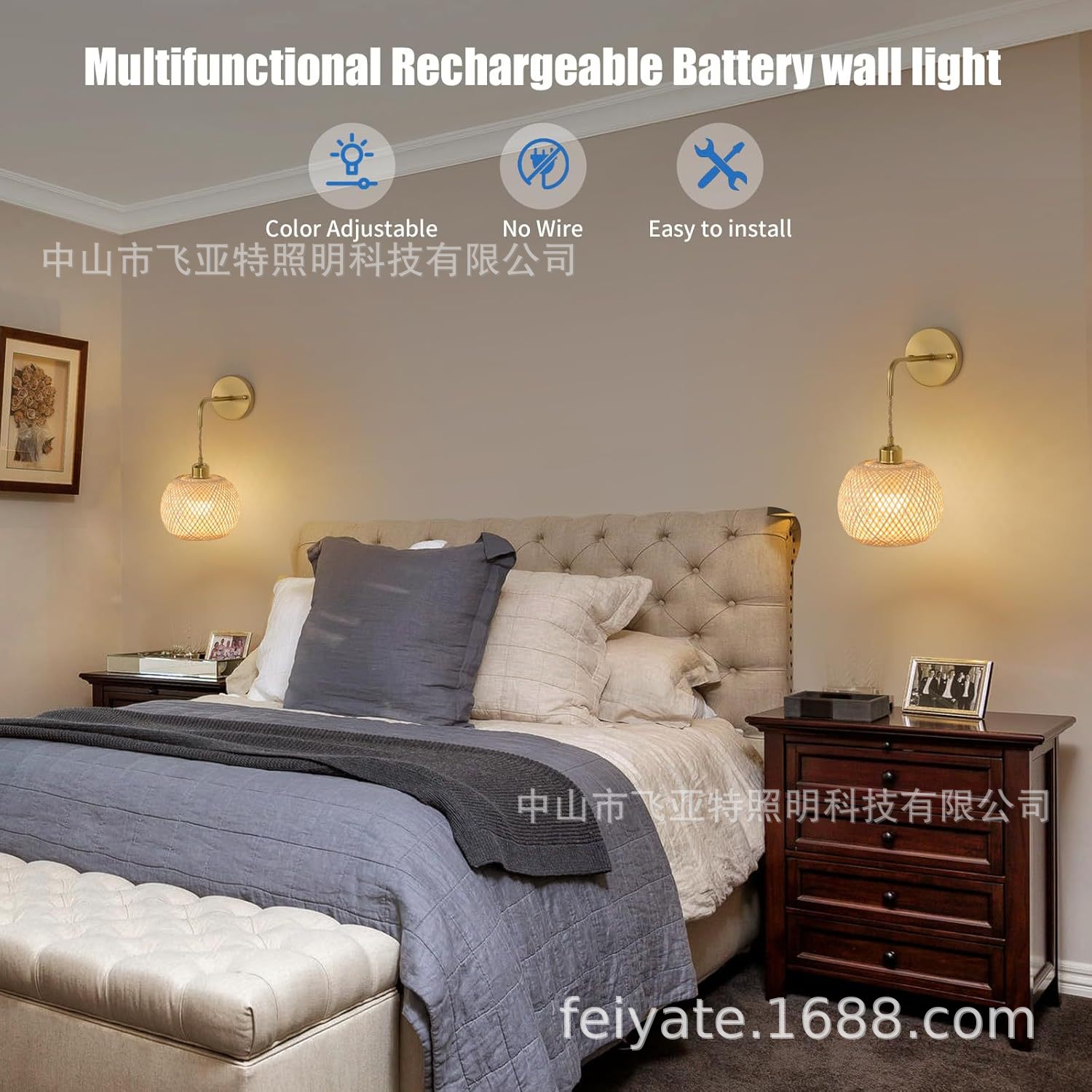 국경 간 Amazon 맞춤형 일본식 배선없는 대나무 침실 머리맡 벽 램프 거실 골드 무선 충전 벽 램프