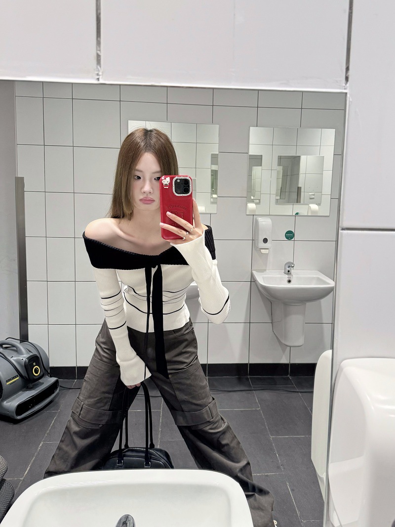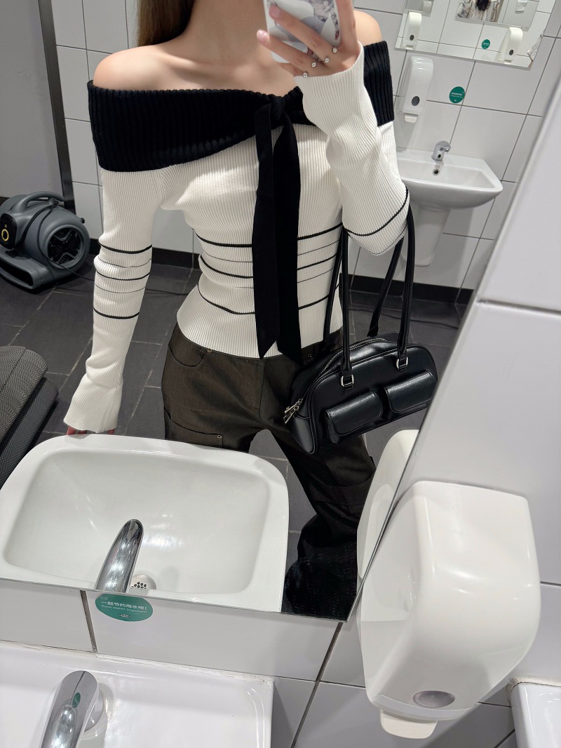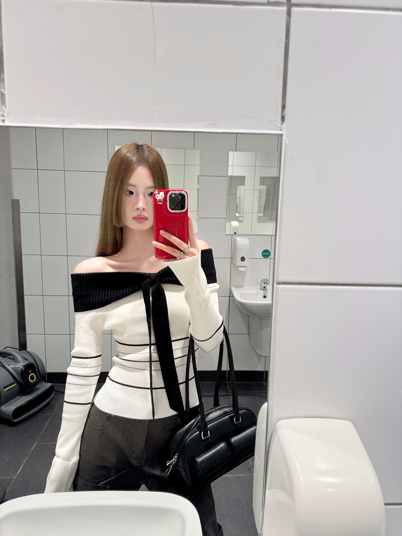 여성용 원숄더 니트 스웨터, 배색 스트라이프, 슬림핏, 숏, 오프숄더, 긴팔, 가을겨울 상의