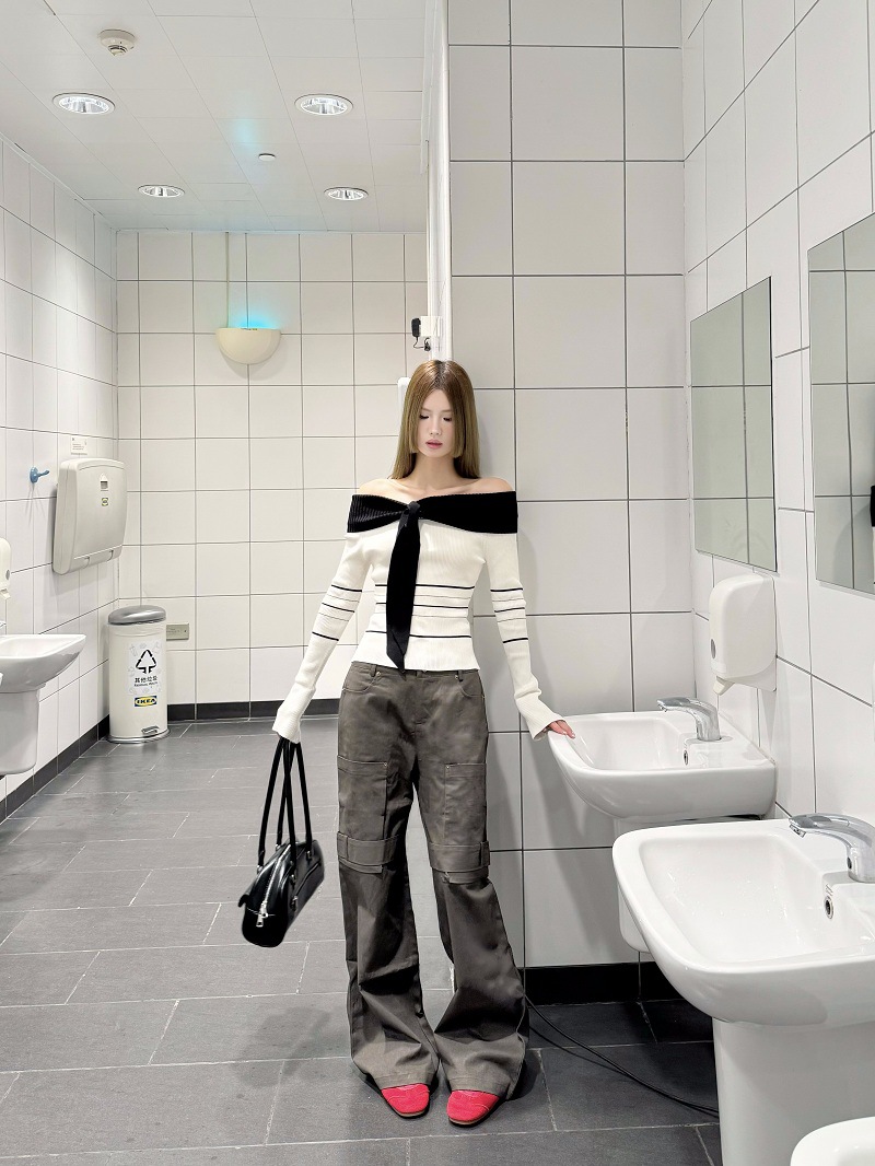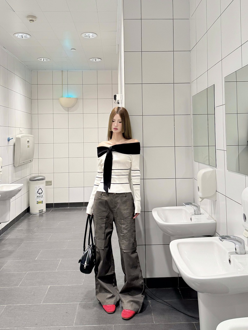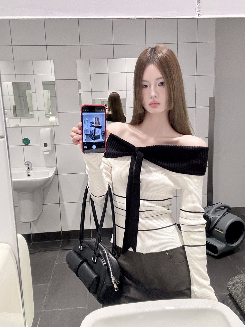 여성용 원숄더 니트 스웨터, 배색 스트라이프, 슬림핏, 숏, 오프숄더, 긴팔, 가을겨울 상의스토어 가기