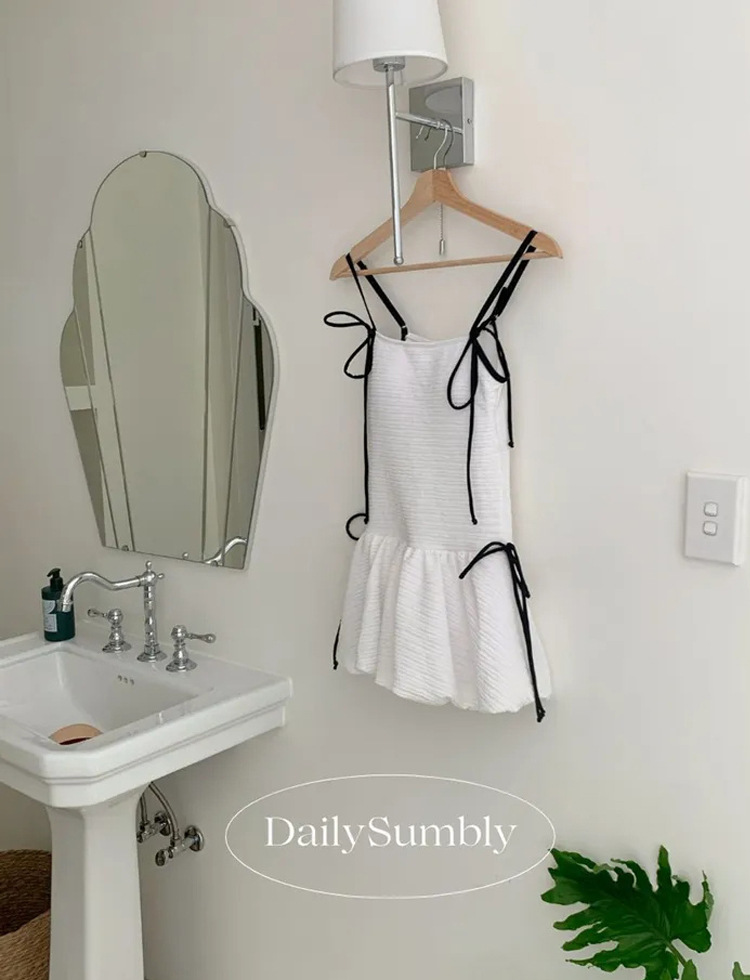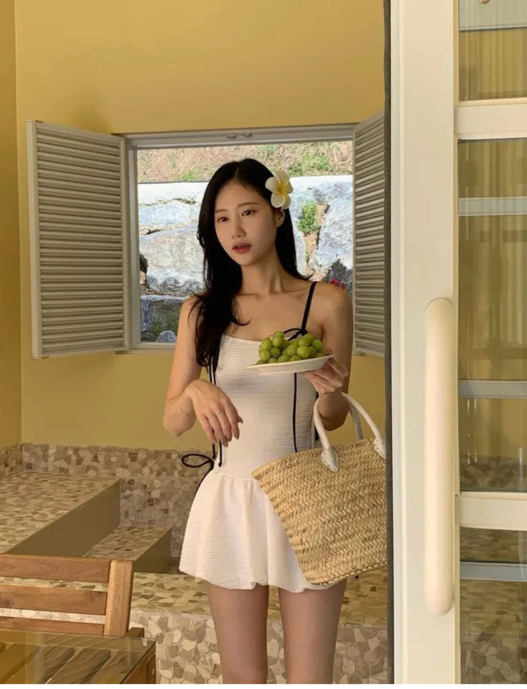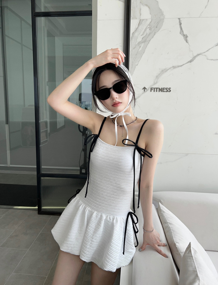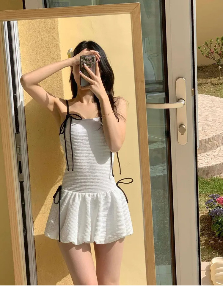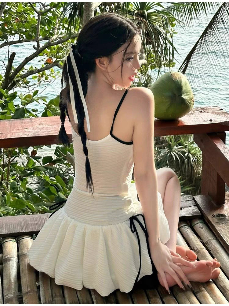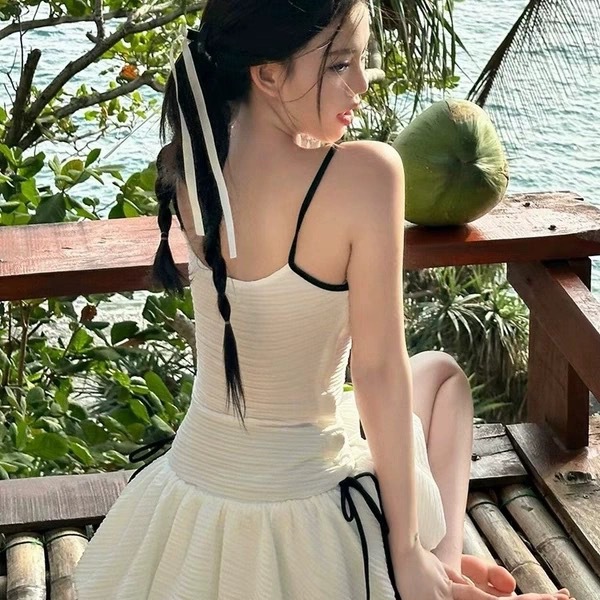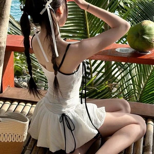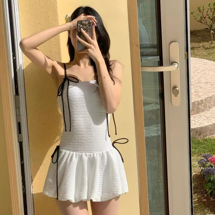 새로운 스타일 넥타이 활 슬링 여성의 여름 순수한 욕망 짧은 치마 흰색 첫사랑 스커트 허리 수영복