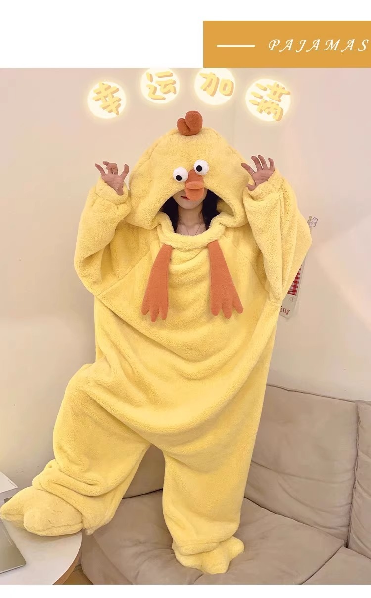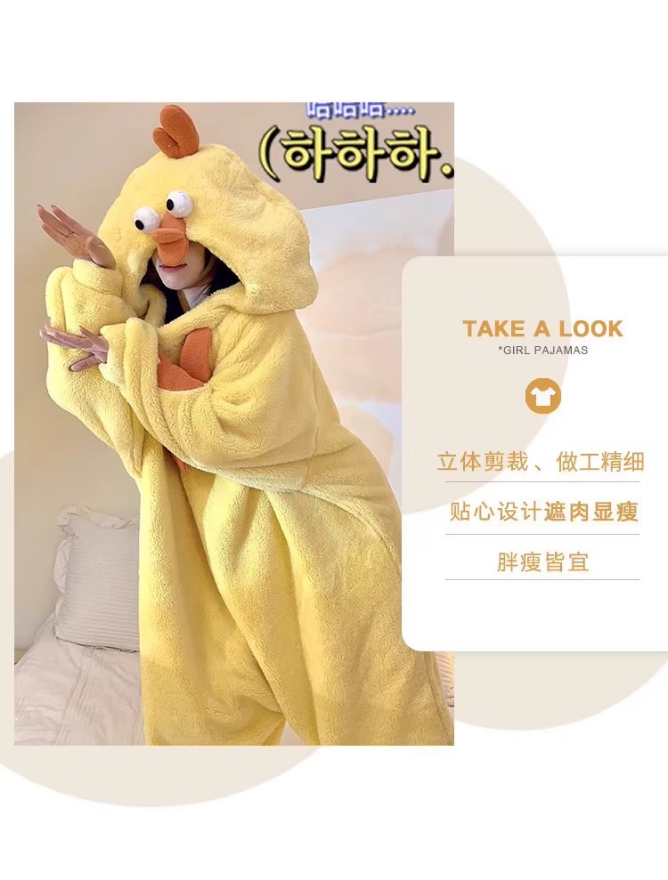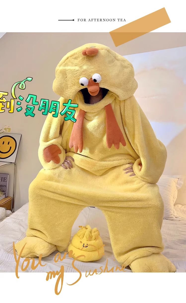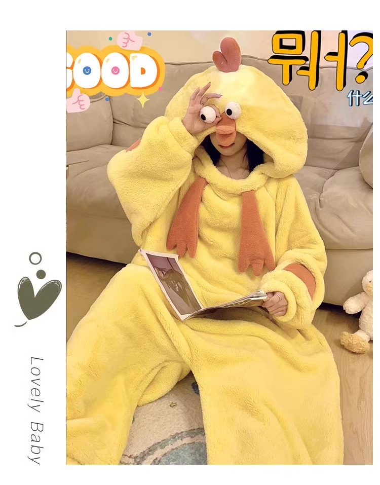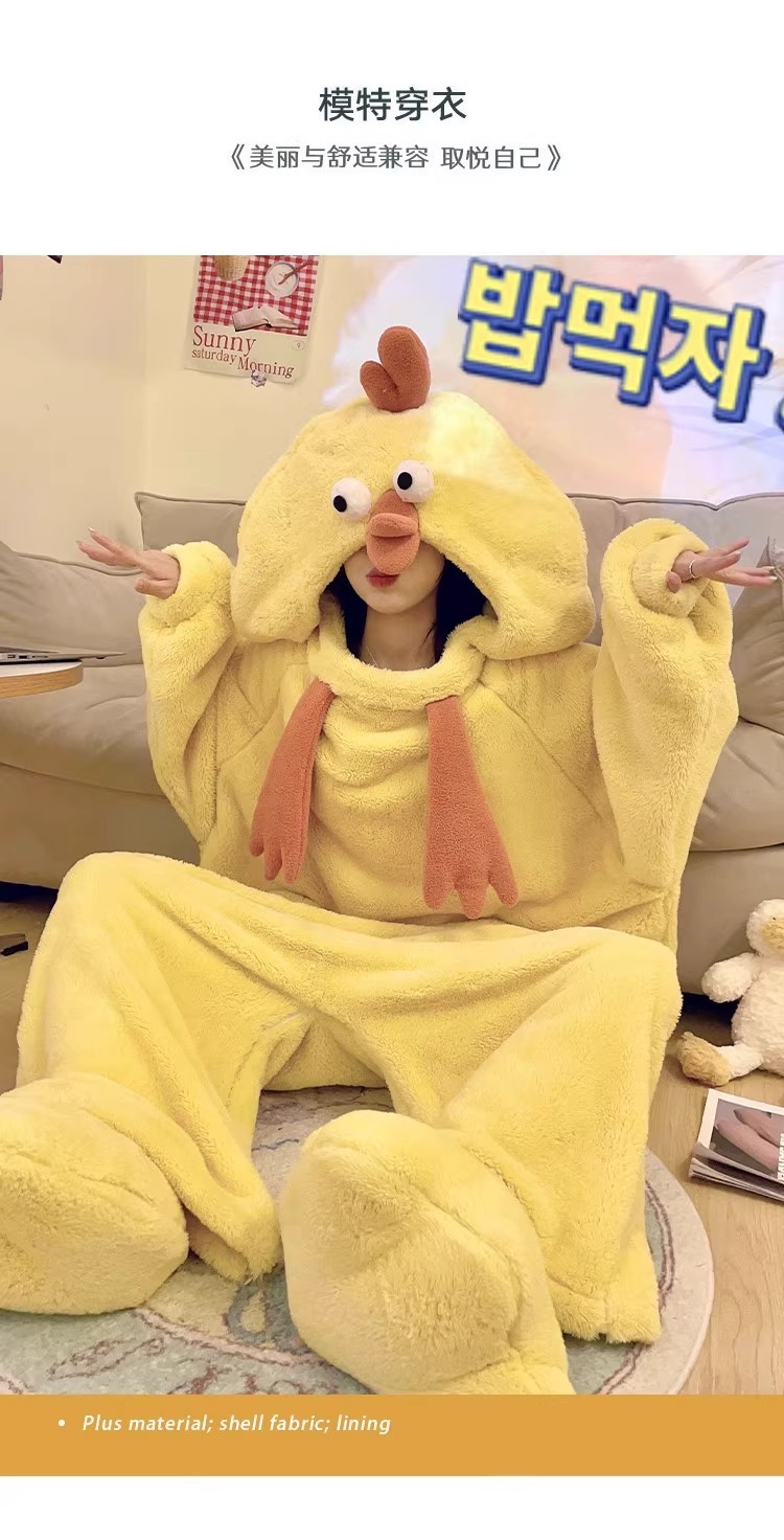 귀여운 노란색 치킨 커플 슬리퍼 남성과 여성의 두꺼운 산호 양털 홈 옷 겨울 성인 재미있는 잠옷