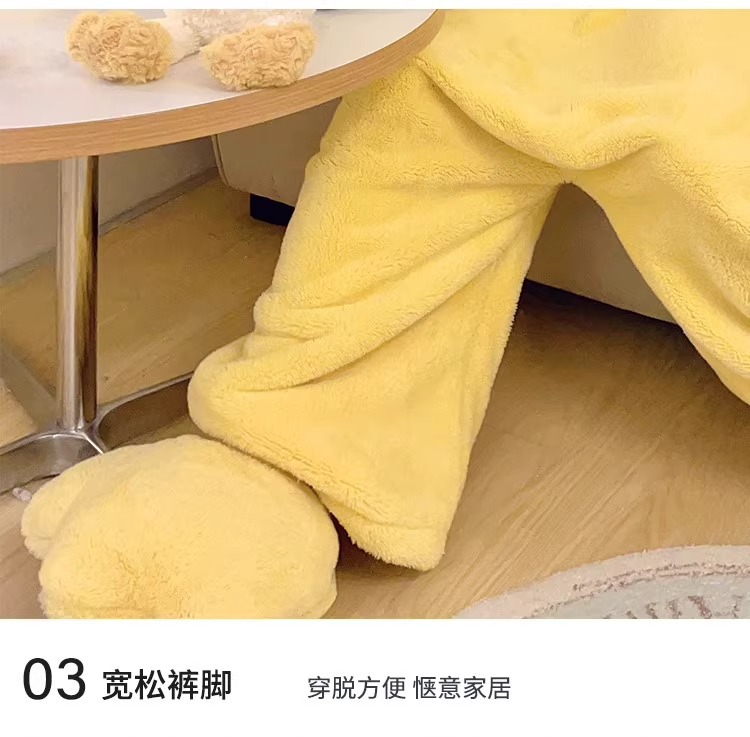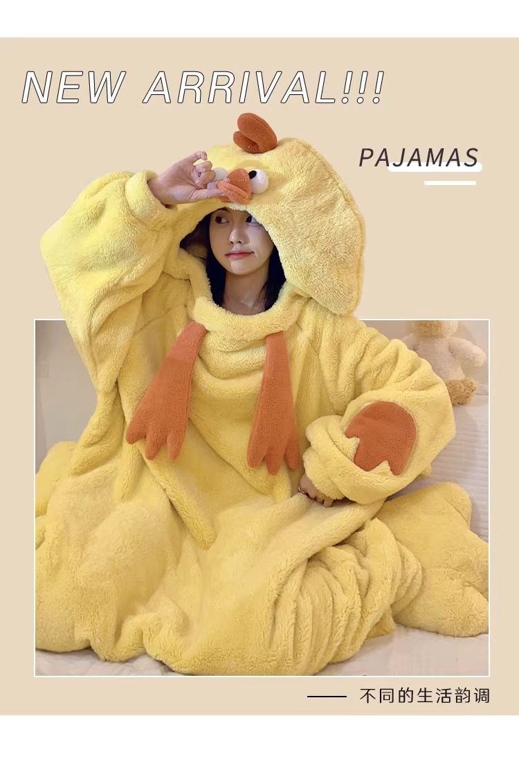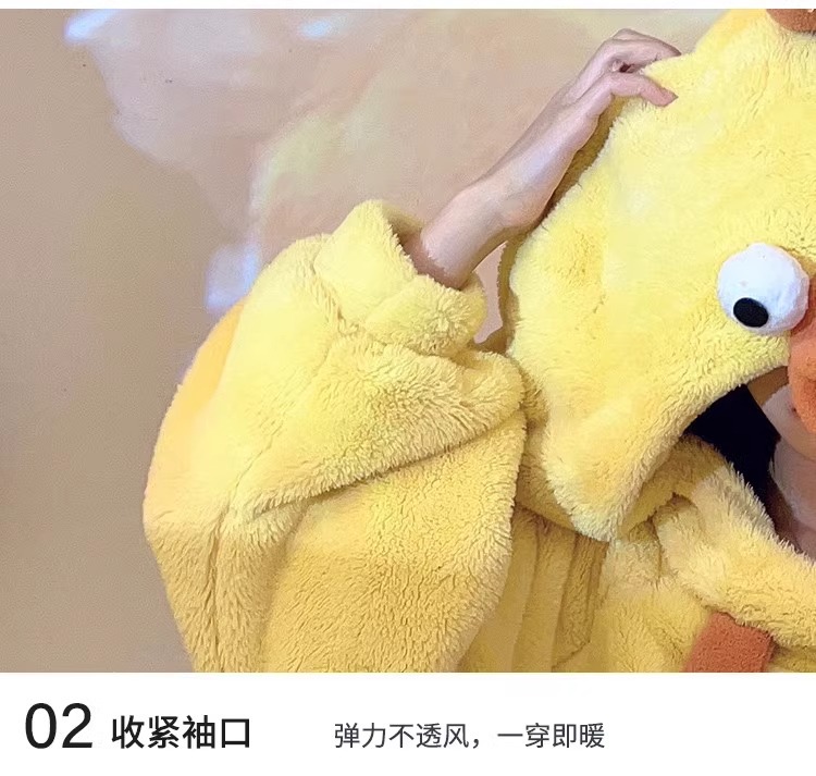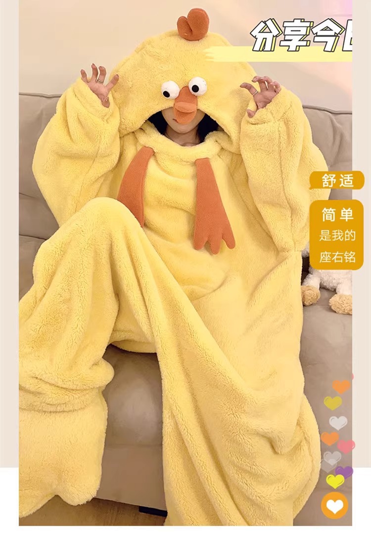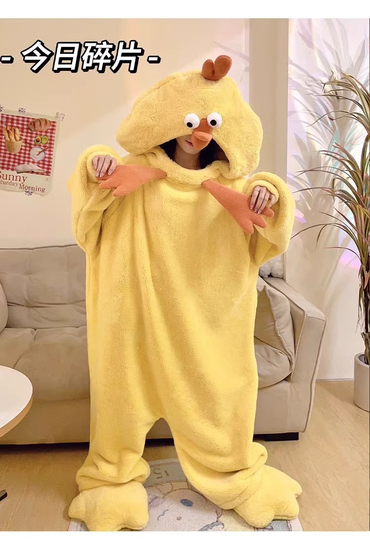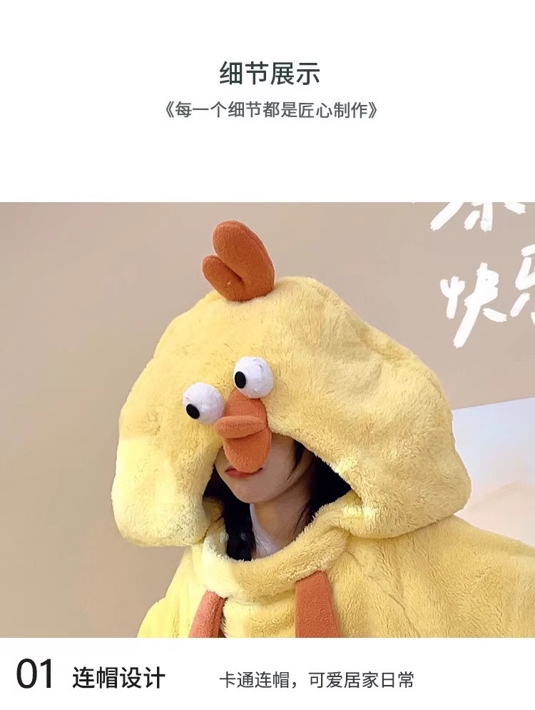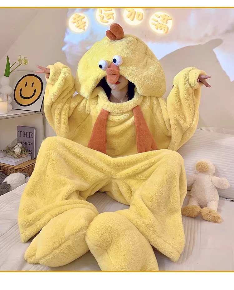 귀여운 노란색 치킨 커플 슬리퍼 남성과 여성의 두꺼운 산호 양털 홈 옷 겨울 성인 재미있는 잠옷