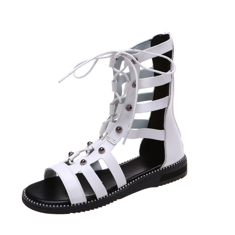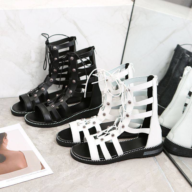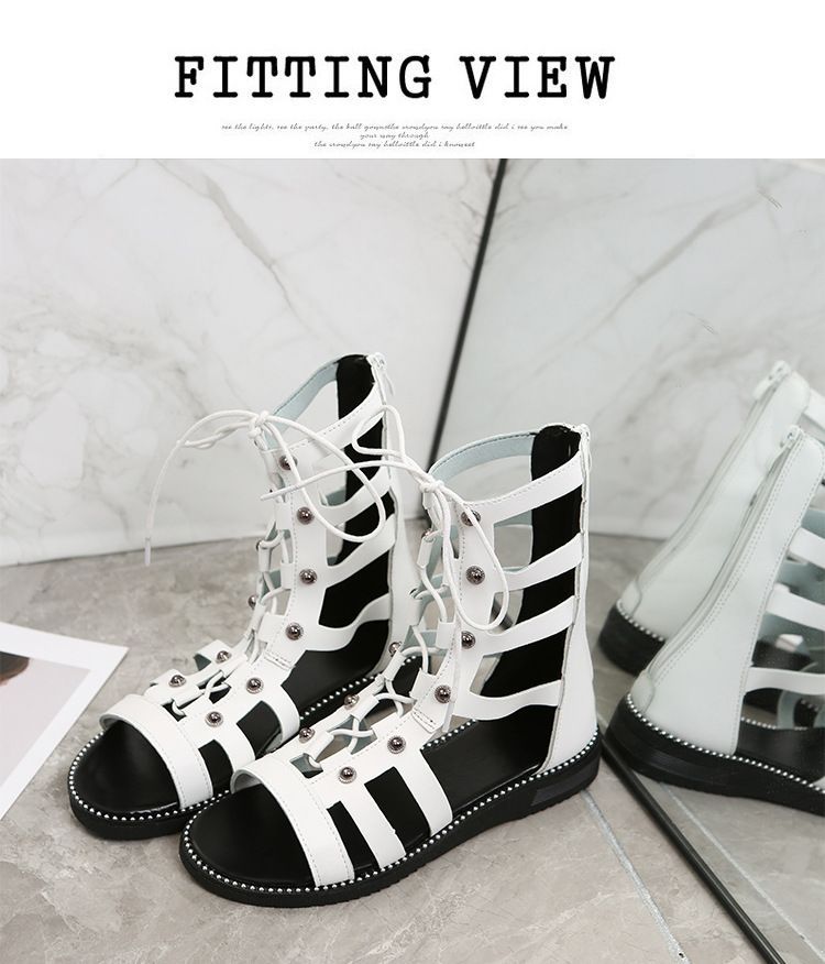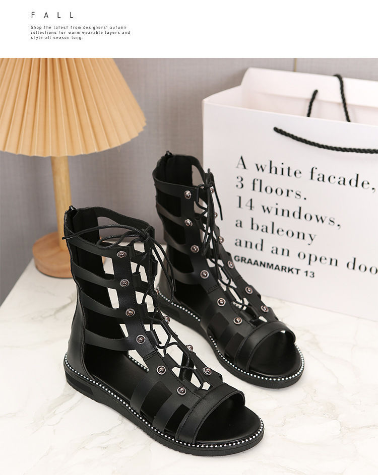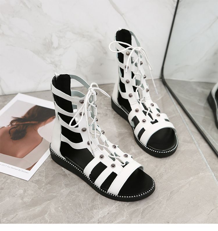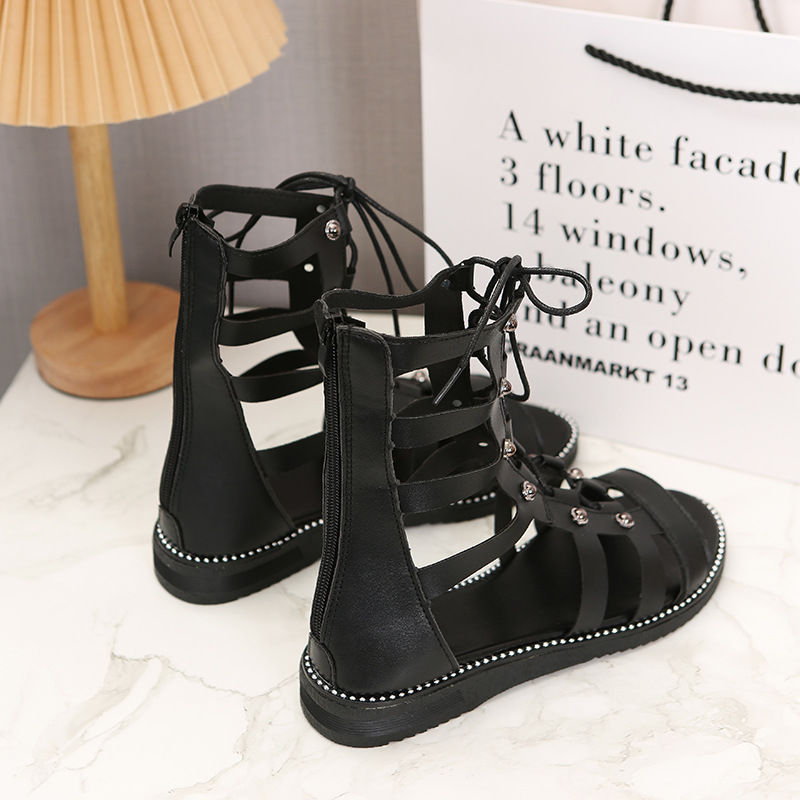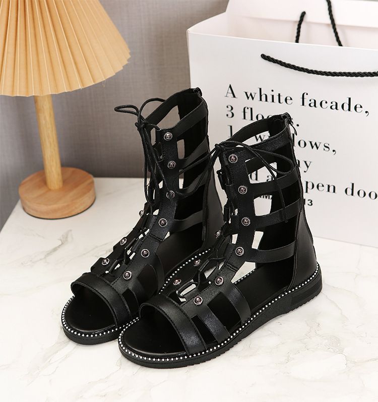 2024 년 여름 새로운 하이 탑 쿨 부츠 여성 대외 무역 플러스 사이즈 로마 위커 네일 할로우 지퍼 플랫 쿨 부츠