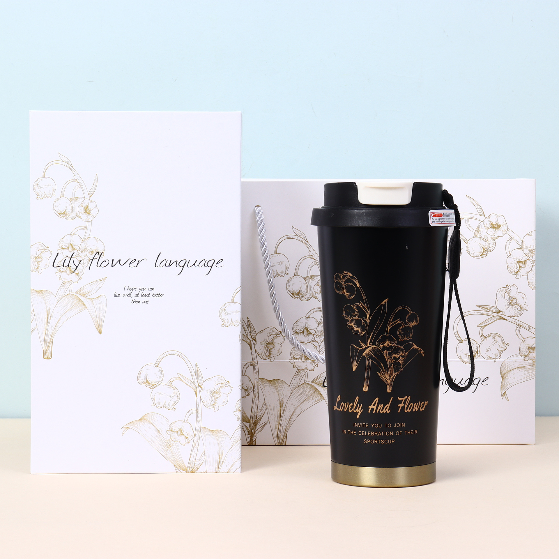 • 검은색 컵에 프린팅이 있습니다. 흰색 선물 상자 [더블 드링크 뚜껑 - 식품 등급 스테인리스 스틸]