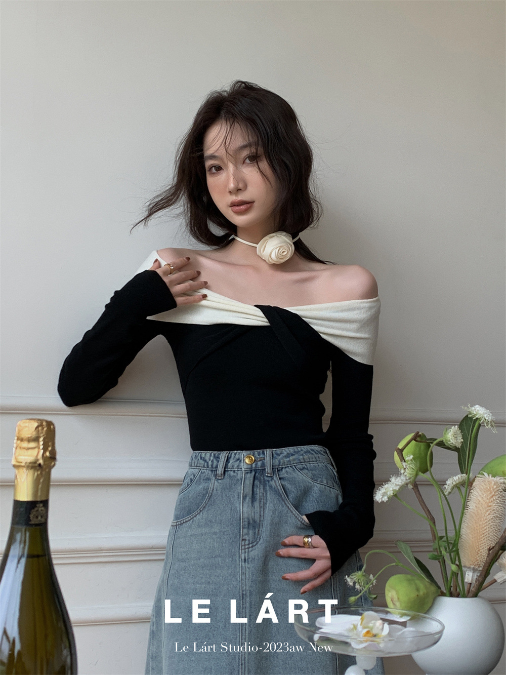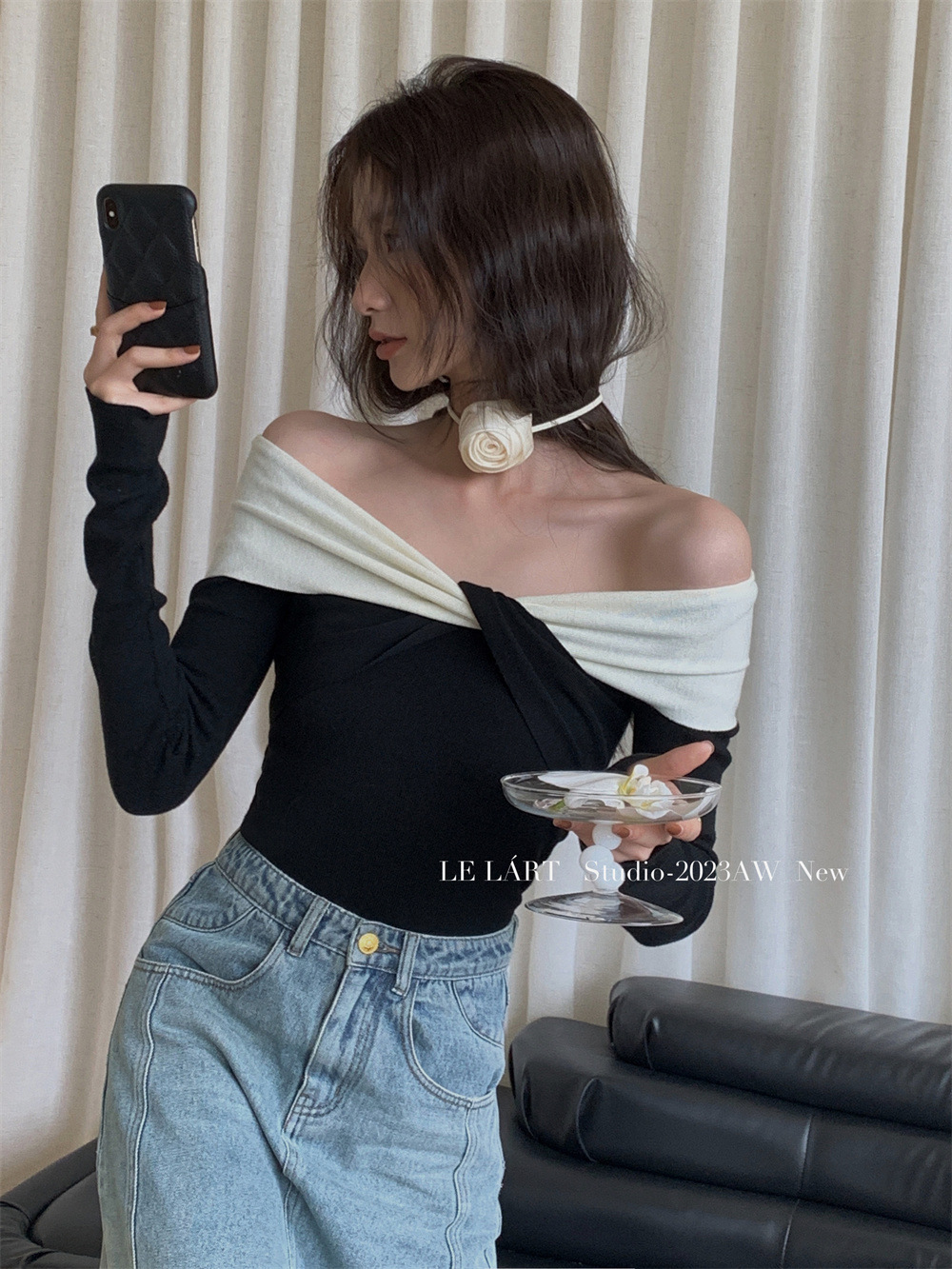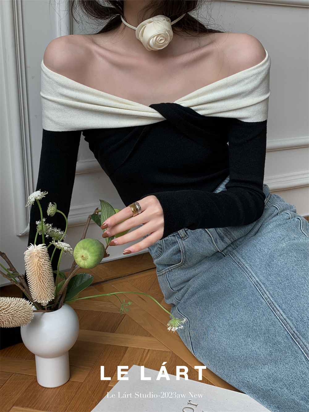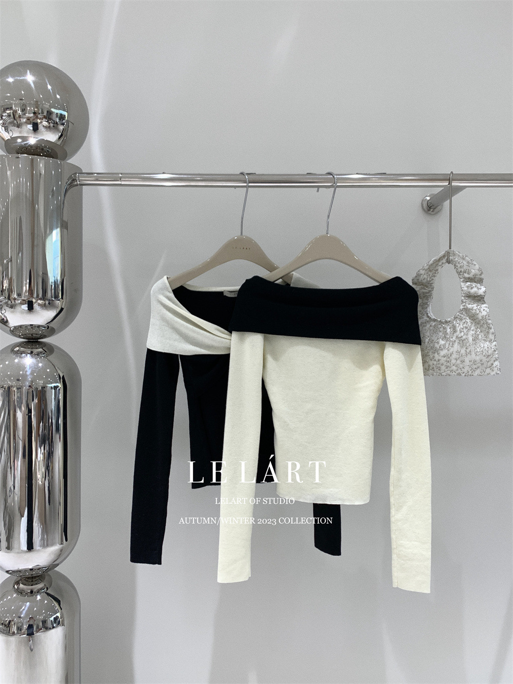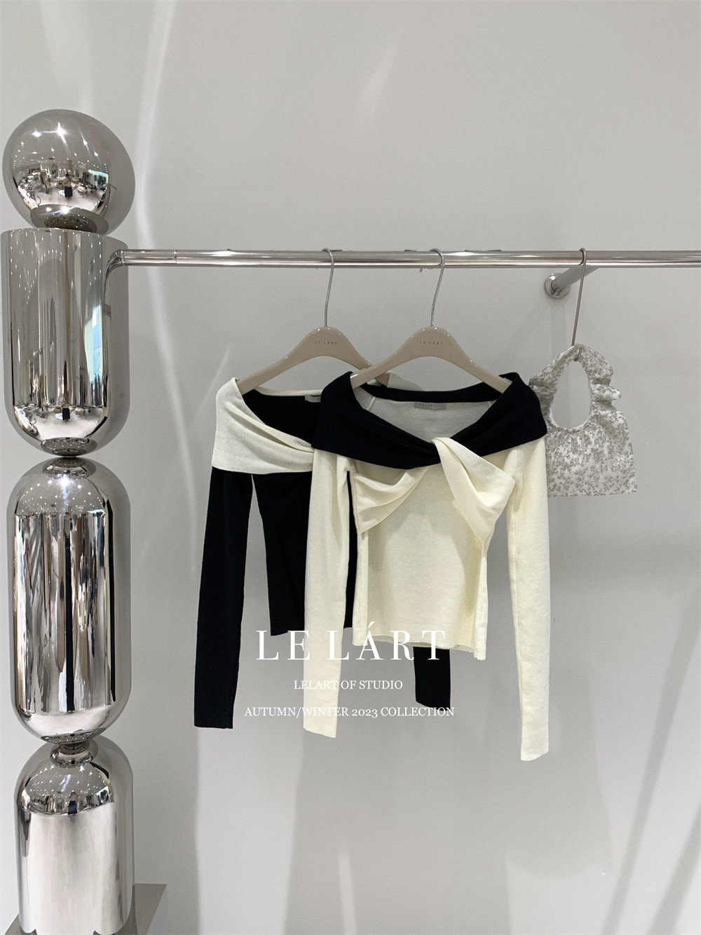 6289 # 가을 새로운 한국 스타일 디자인 센스 싱크 콘트라스트 컬러 슬림 니트 셔츠 틈새 순수 욕망 어깨 재킷스토어 가기