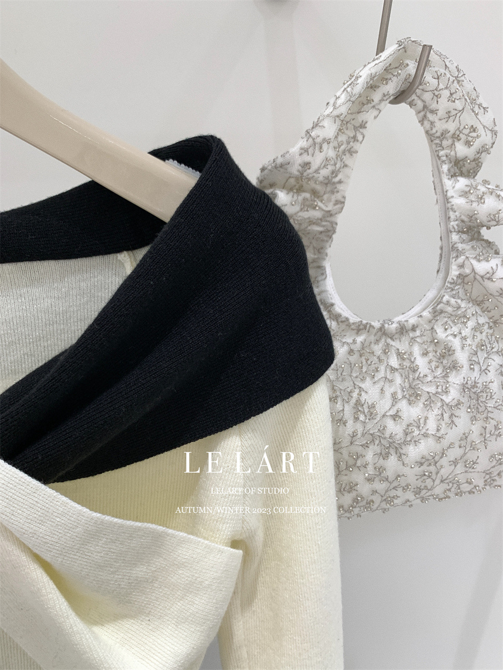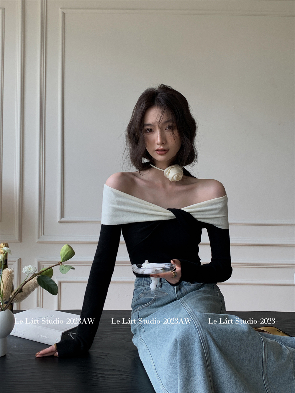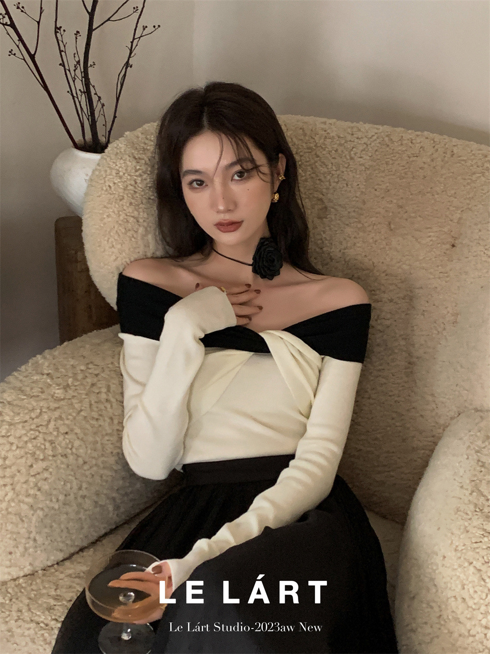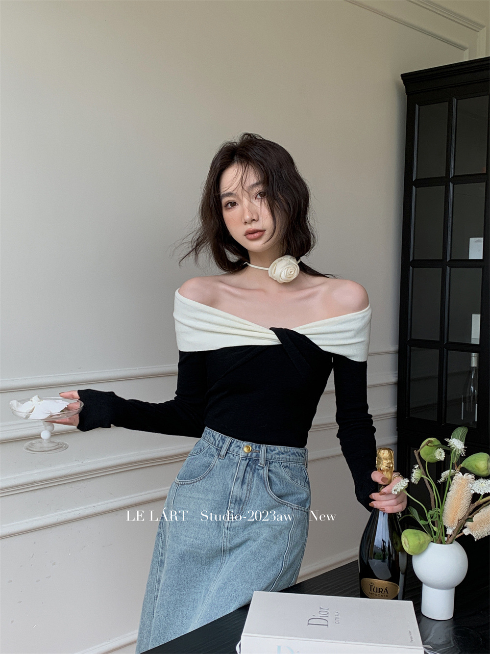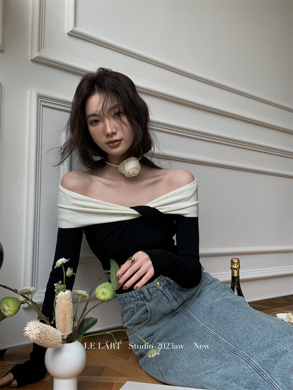6289 # 가을 새로운 한국 스타일 디자인 센스 싱크 콘트라스트 컬러 슬림 니트 셔츠 틈새 순수 욕망 어깨 재킷스토어 가기