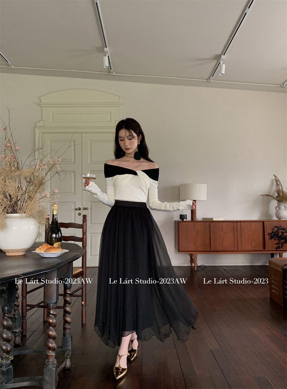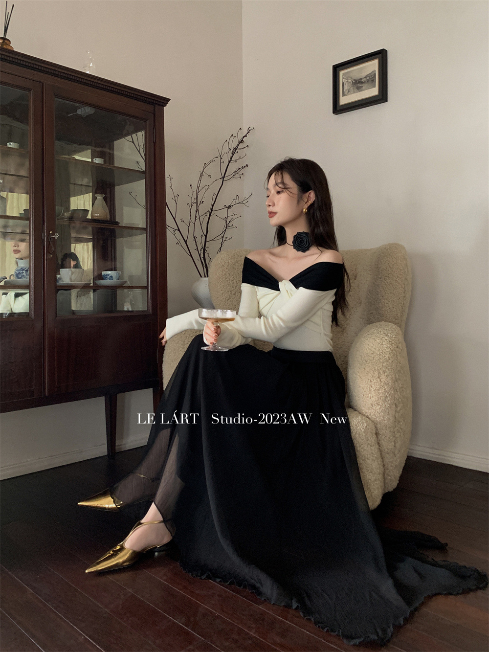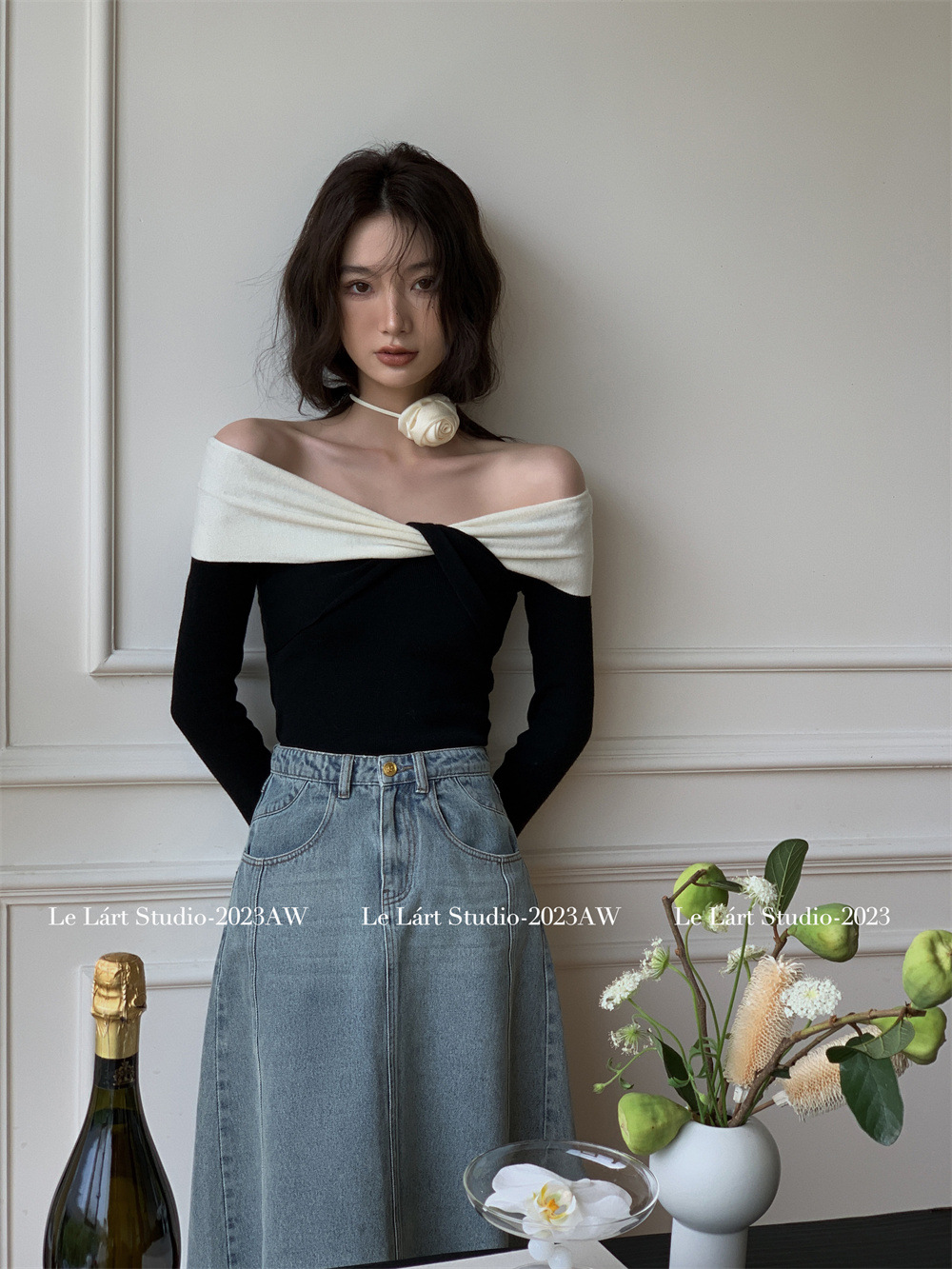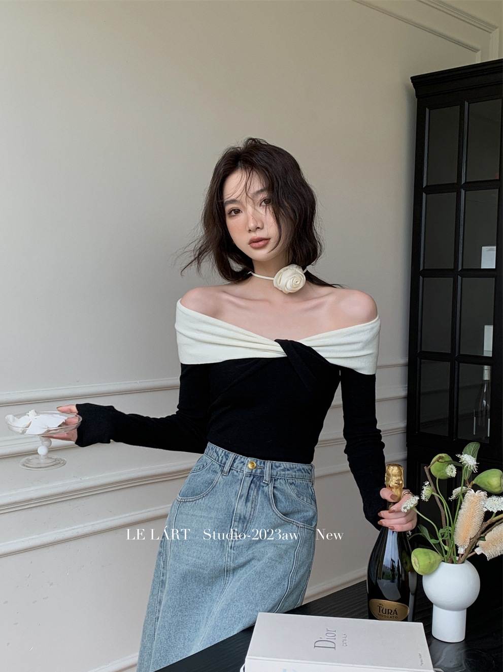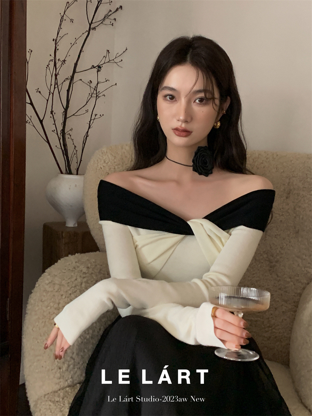 6289 # 가을 새로운 한국 스타일 디자인 센스 싱크 콘트라스트 컬러 슬림 니트 셔츠 틈새 순수 욕망 어깨 재킷스토어 가기
