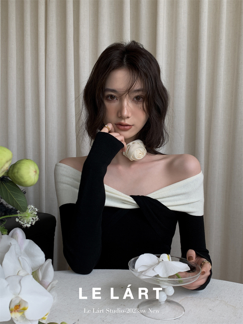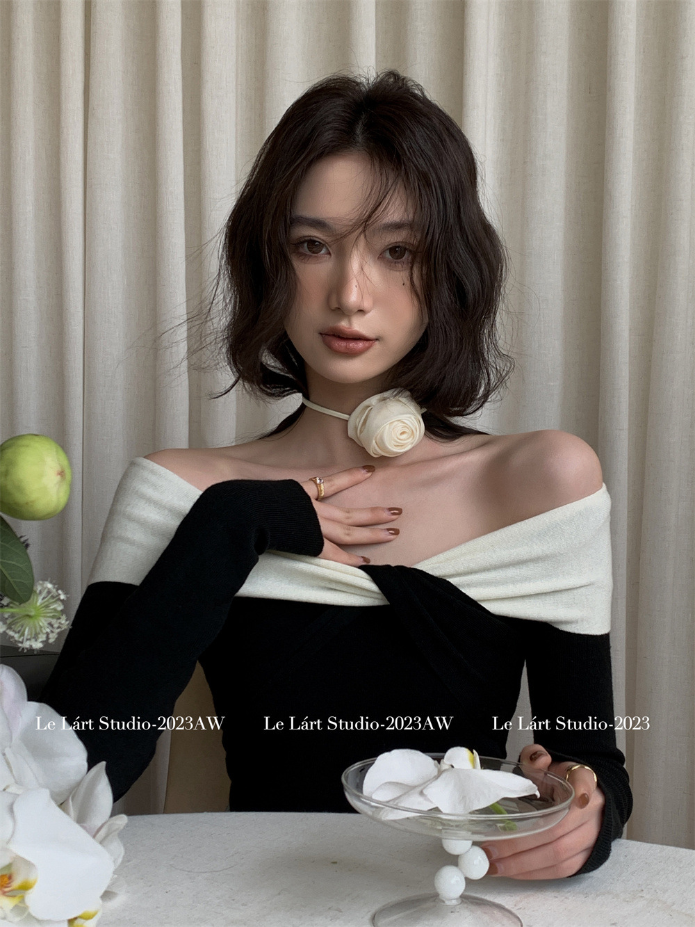 6289 # 가을 새로운 한국 스타일 디자인 센스 싱크 콘트라스트 컬러 슬림 니트 셔츠 틈새 순수 욕망 어깨 재킷