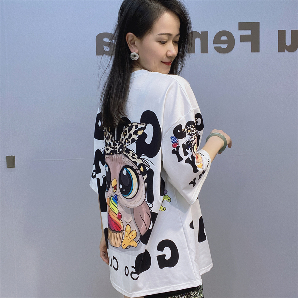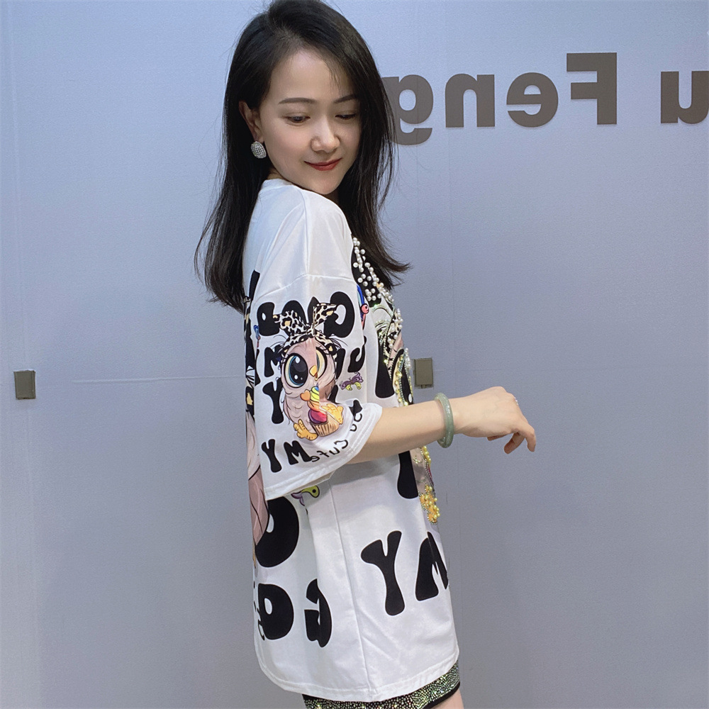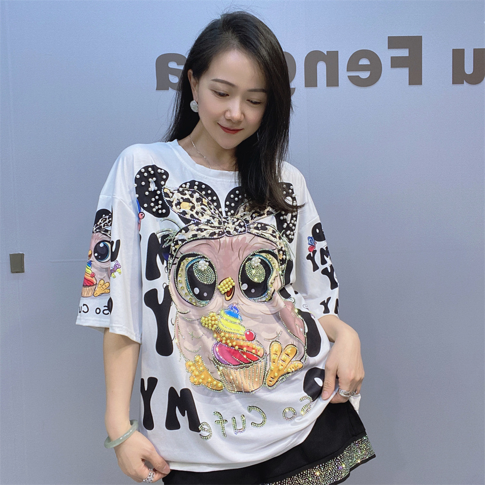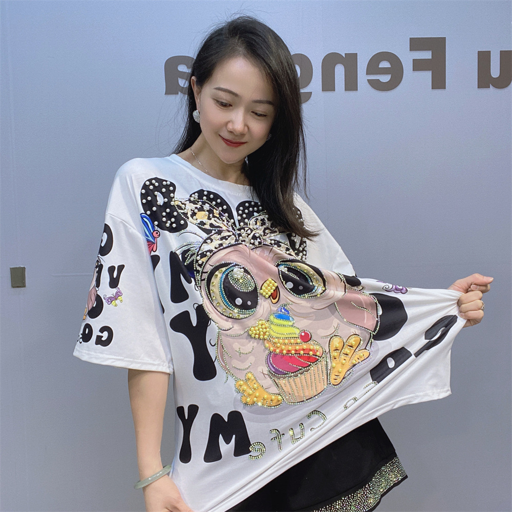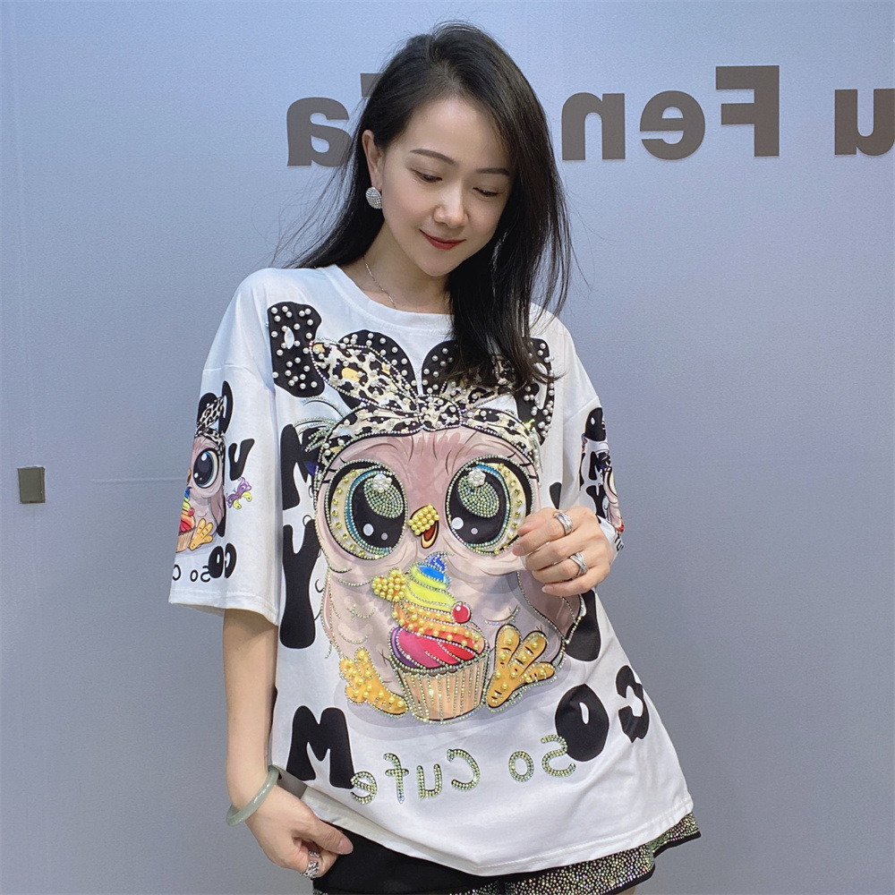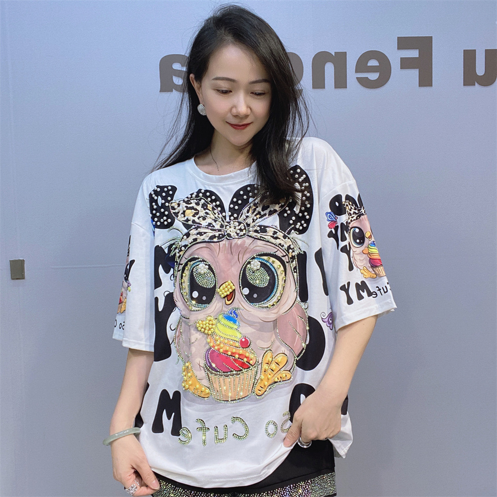 대외 무역 국경 패션 새로운 라운드 넥 반팔 티셔츠 여성 여름 2025 새로운 느슨한 중공업 플래시 다이아몬드 반소매 탑스토어 가기