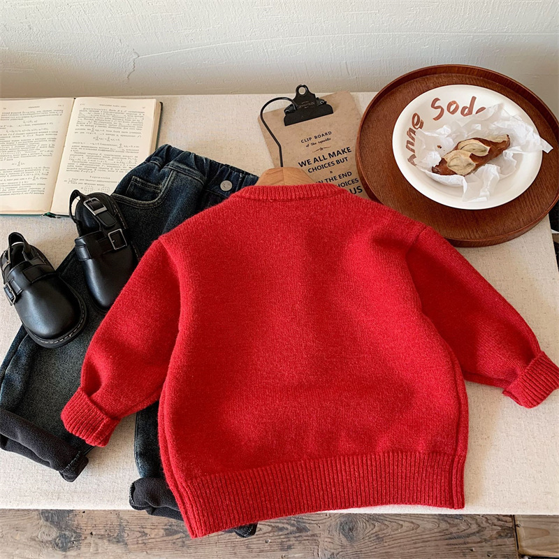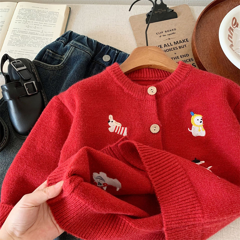 스위트샤오시 아동용 스웨터 겨울 한국판 신상품 남아 여아용 세련된 자수 강아지 니트 가디건 레드 상의