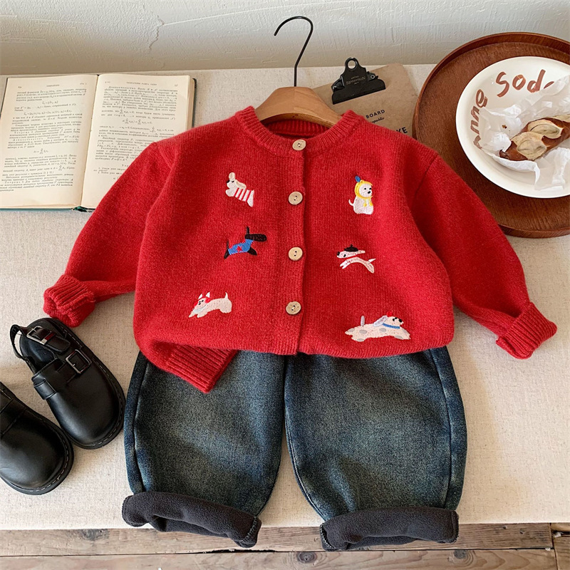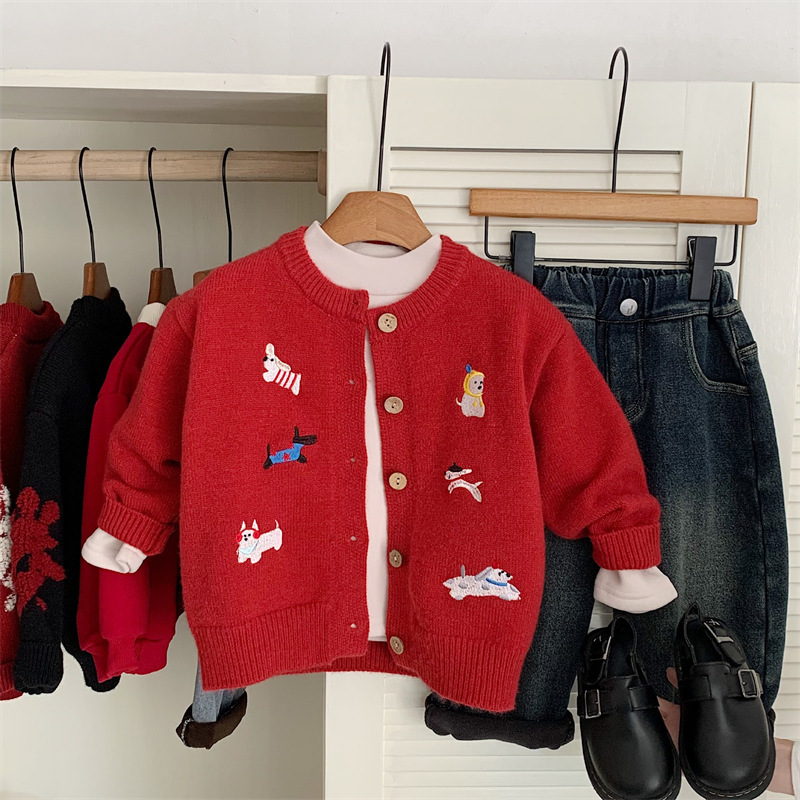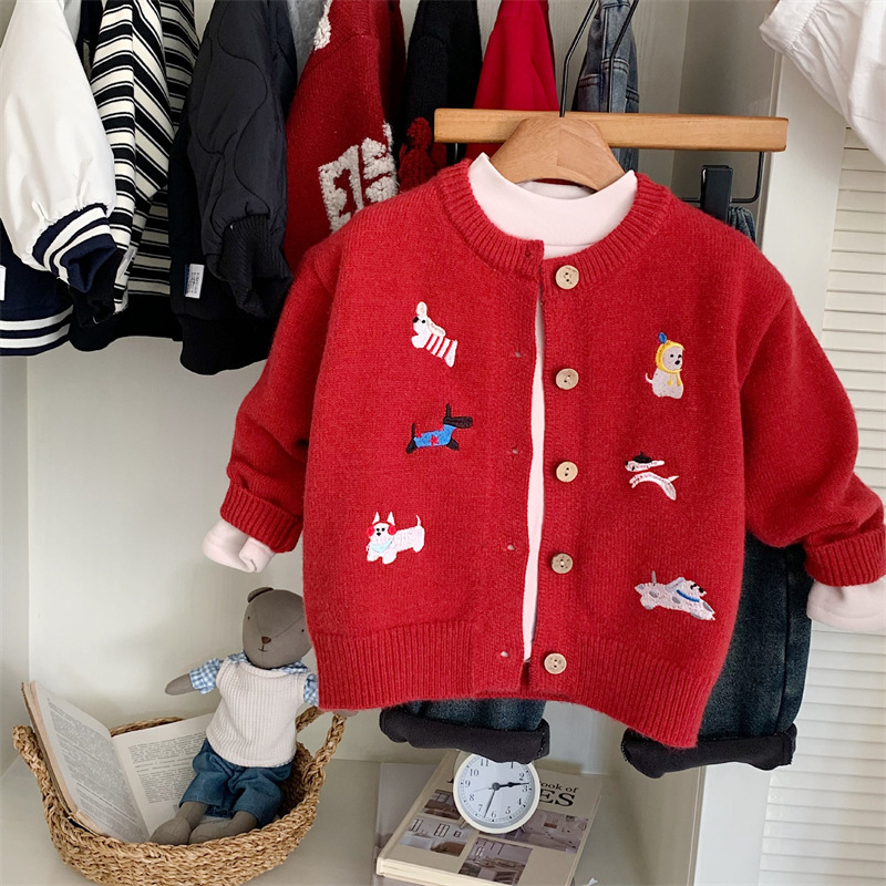 스위트샤오시 아동용 스웨터 겨울 한국판 신상품 남아 여아용 세련된 자수 강아지 니트 가디건 레드 상의스토어 가기