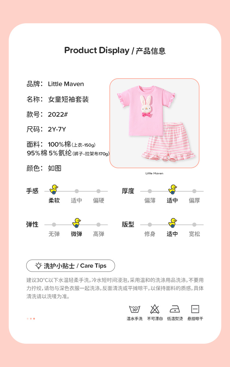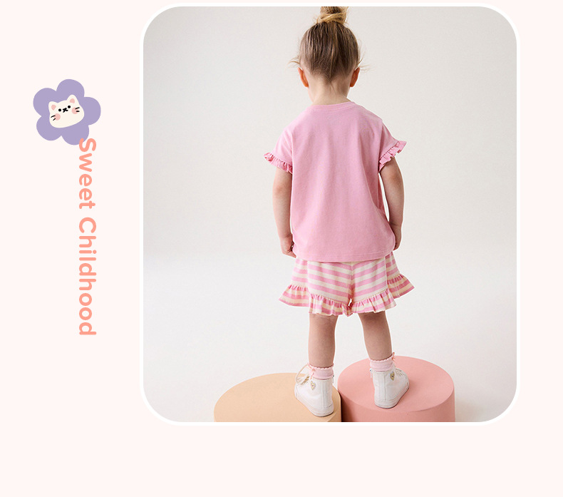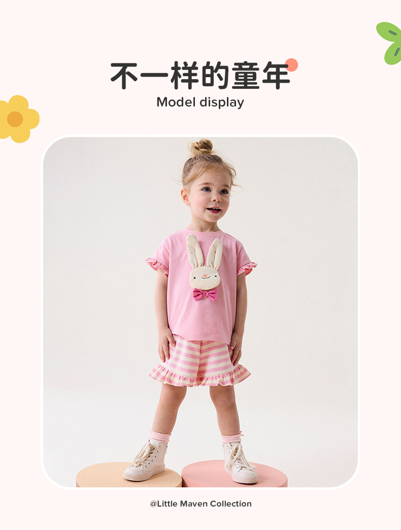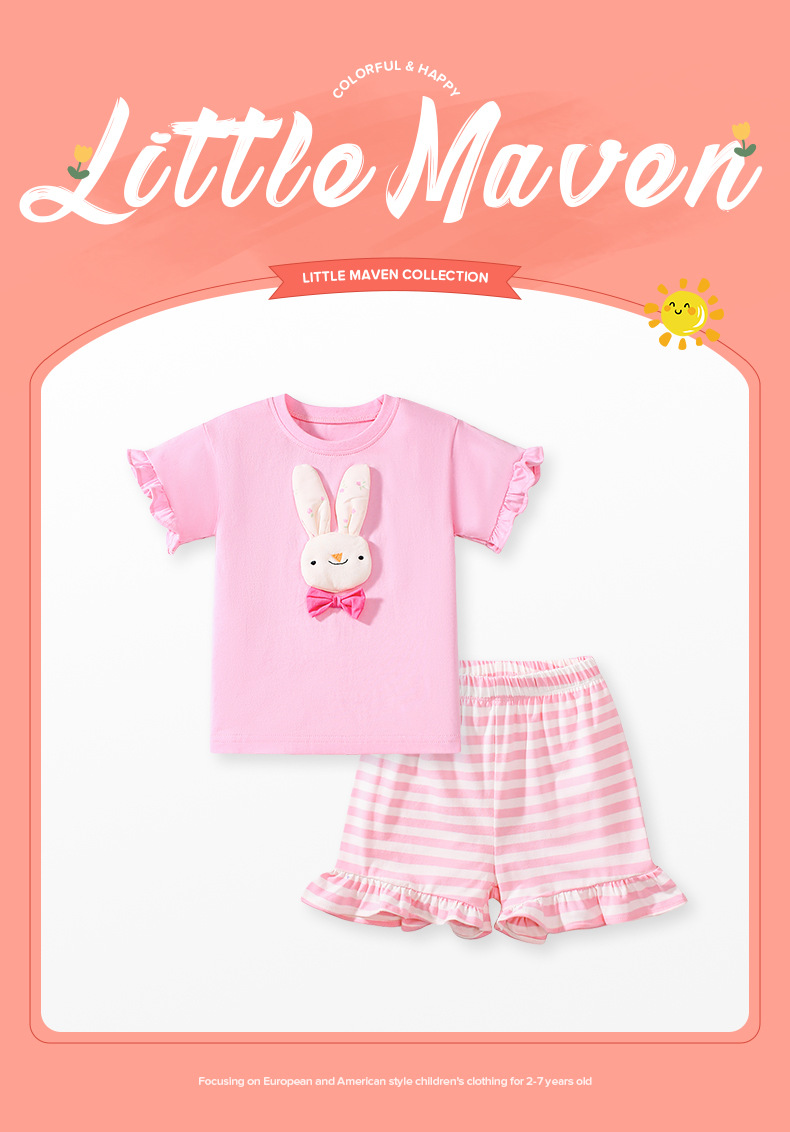 작은 maven 유럽과 미국의 귀여운 어린이 세트 여름 짧은 소매 소녀 세트 만화 줄무늬 아동복 도매스토어 가기