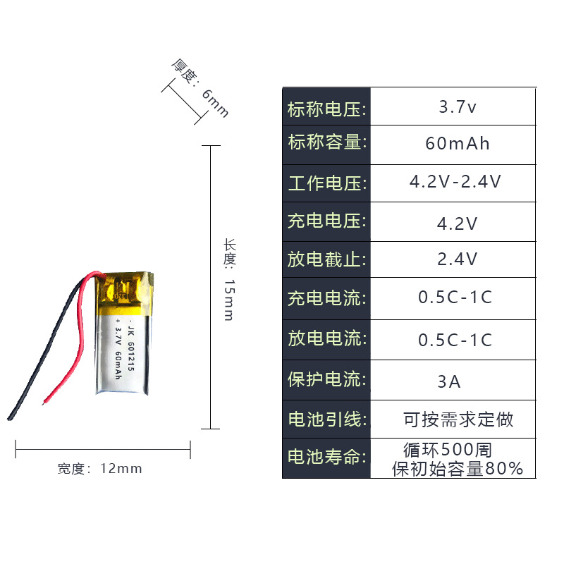601215 고용량 밀도 3.7V 리튬 배터리 블루투스 헤드셋 배터리 60mAh 폴리머 배터리 코어 제조 업체