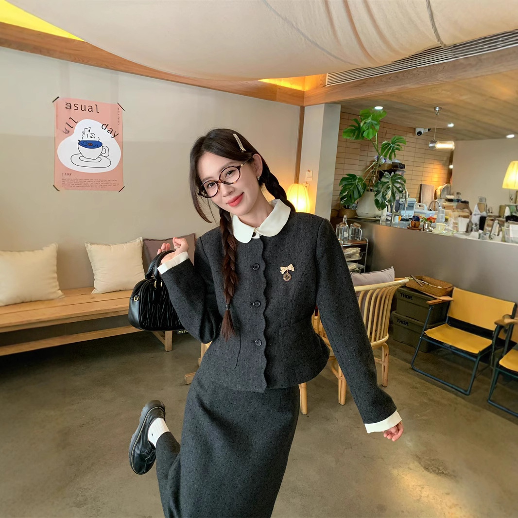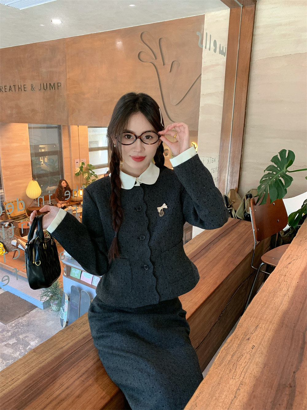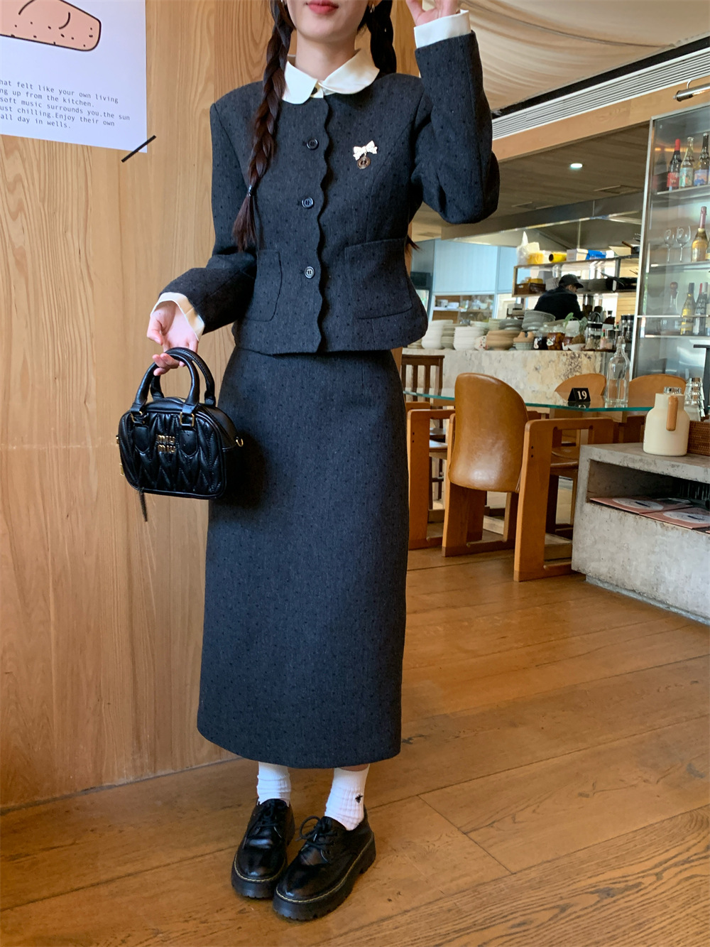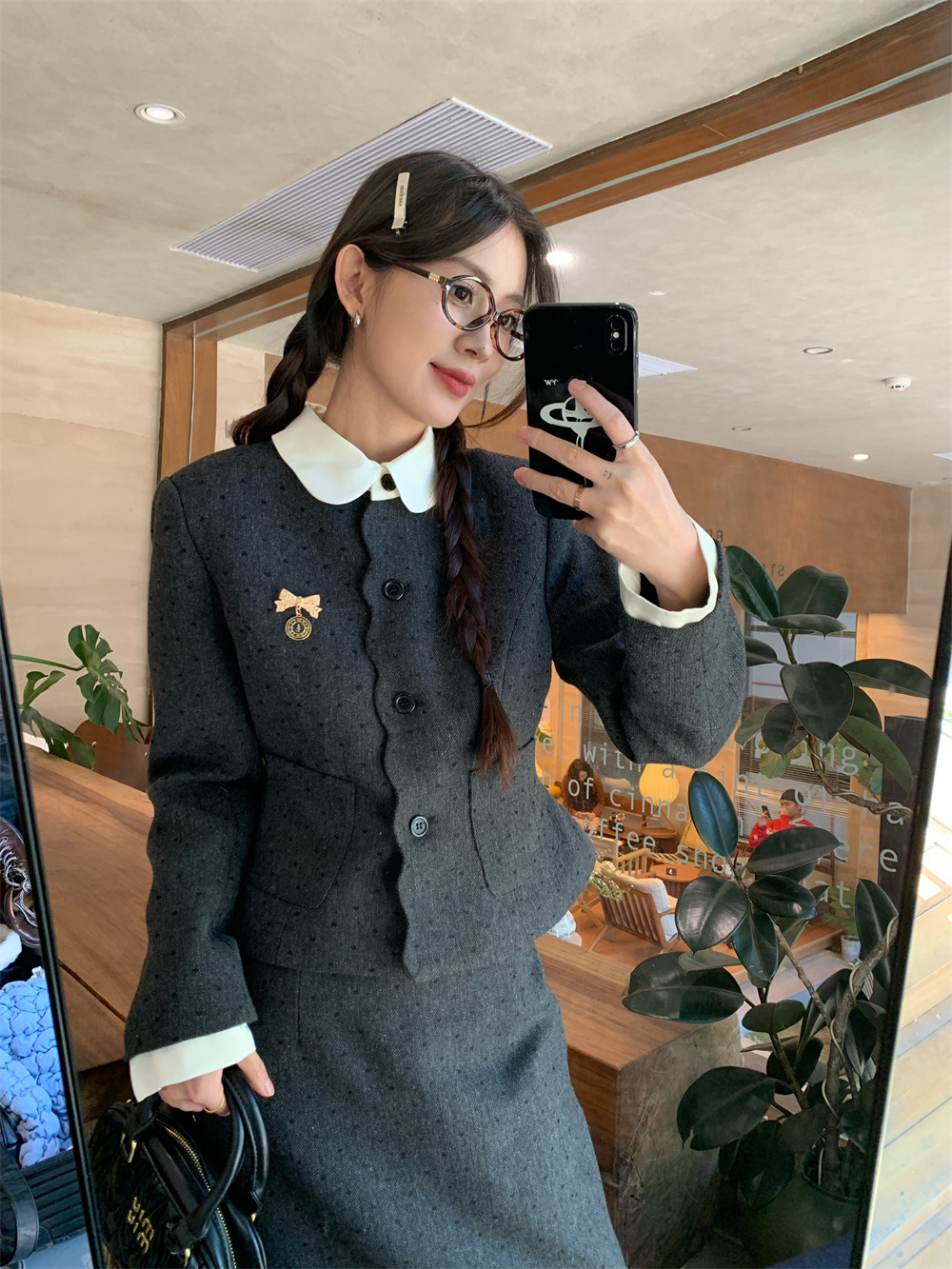 진짜 가을 겨울 새로운 프랑스 회색 작은 향기로운 스타일 코튼 코트 여성용 스트레이트 스커트 투피스 세트 74769