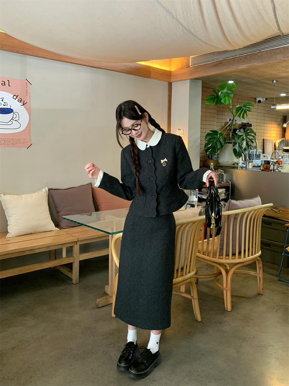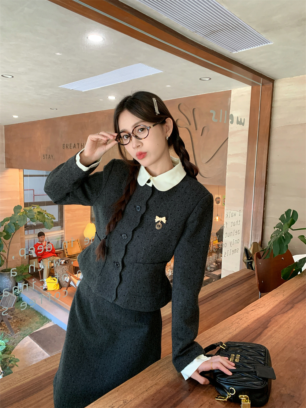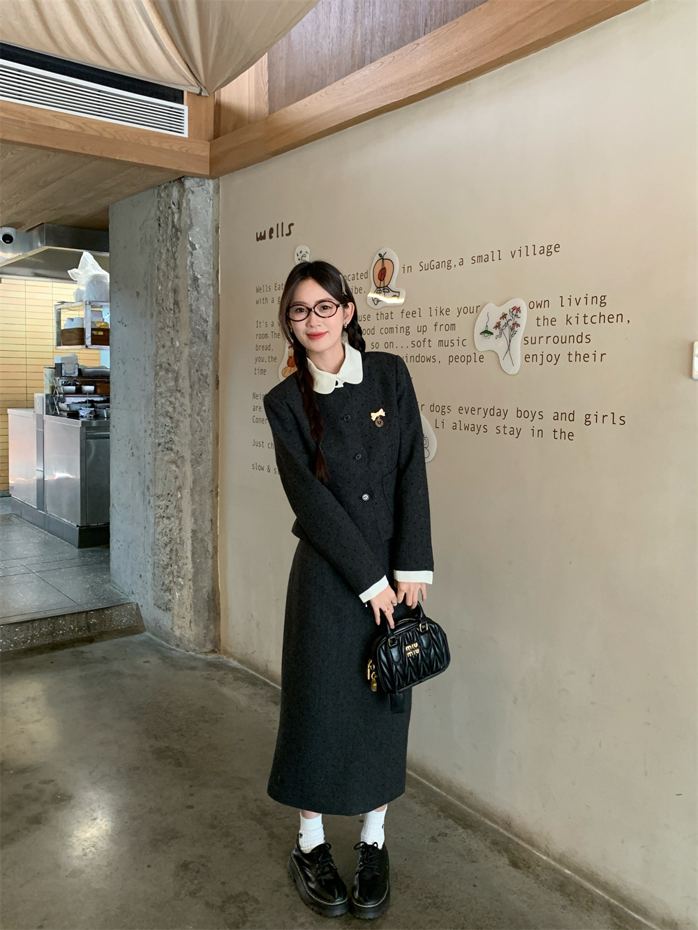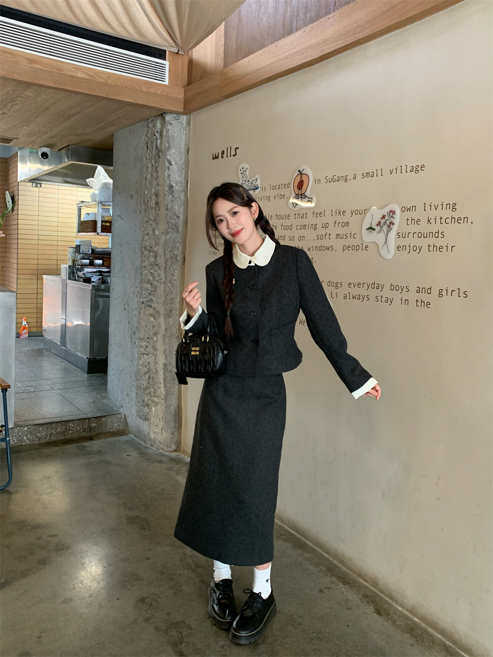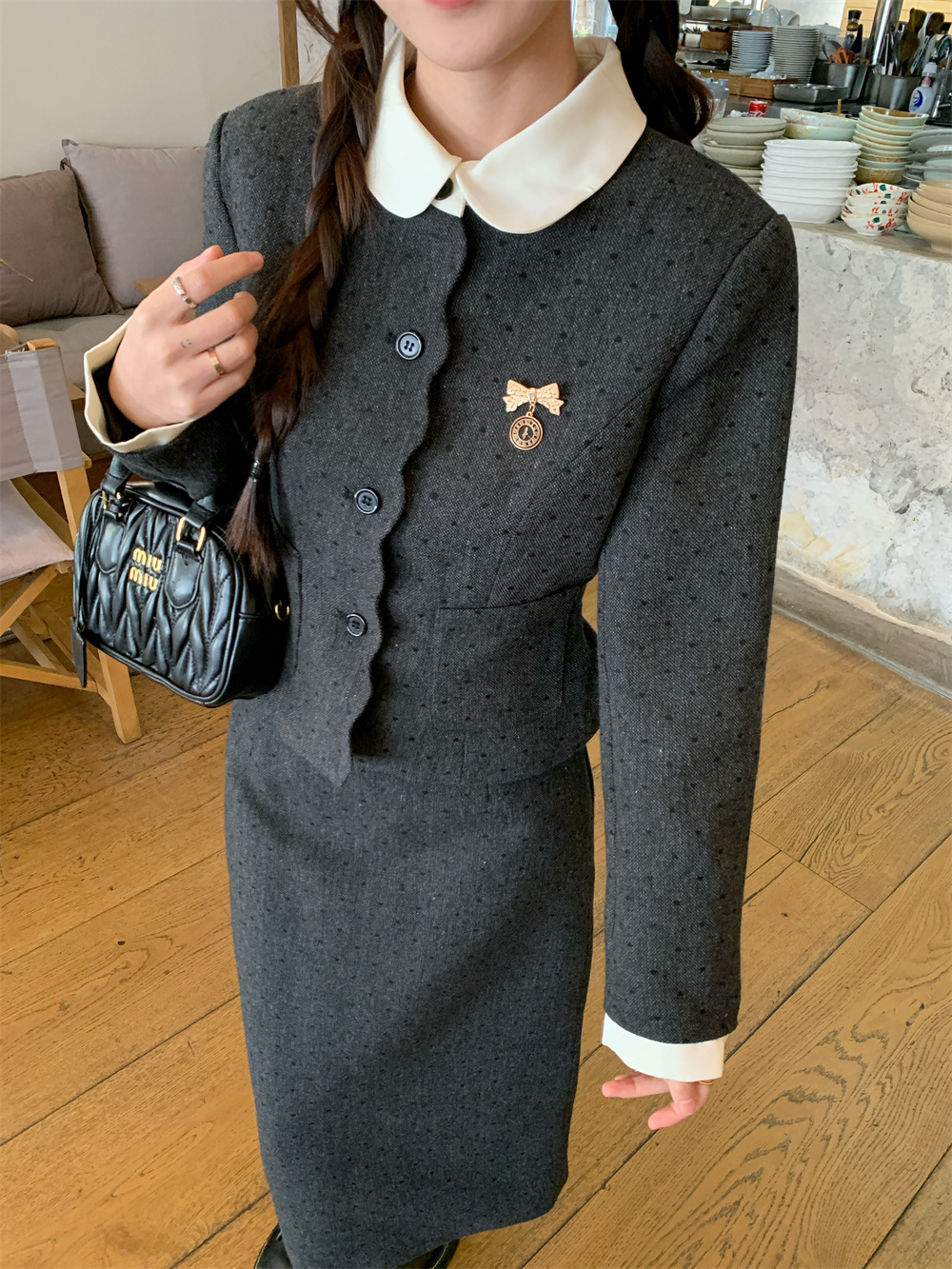 진짜 가을 겨울 새로운 프랑스 회색 작은 향기로운 스타일 코튼 코트 여성용 스트레이트 스커트 투피스 세트 74769