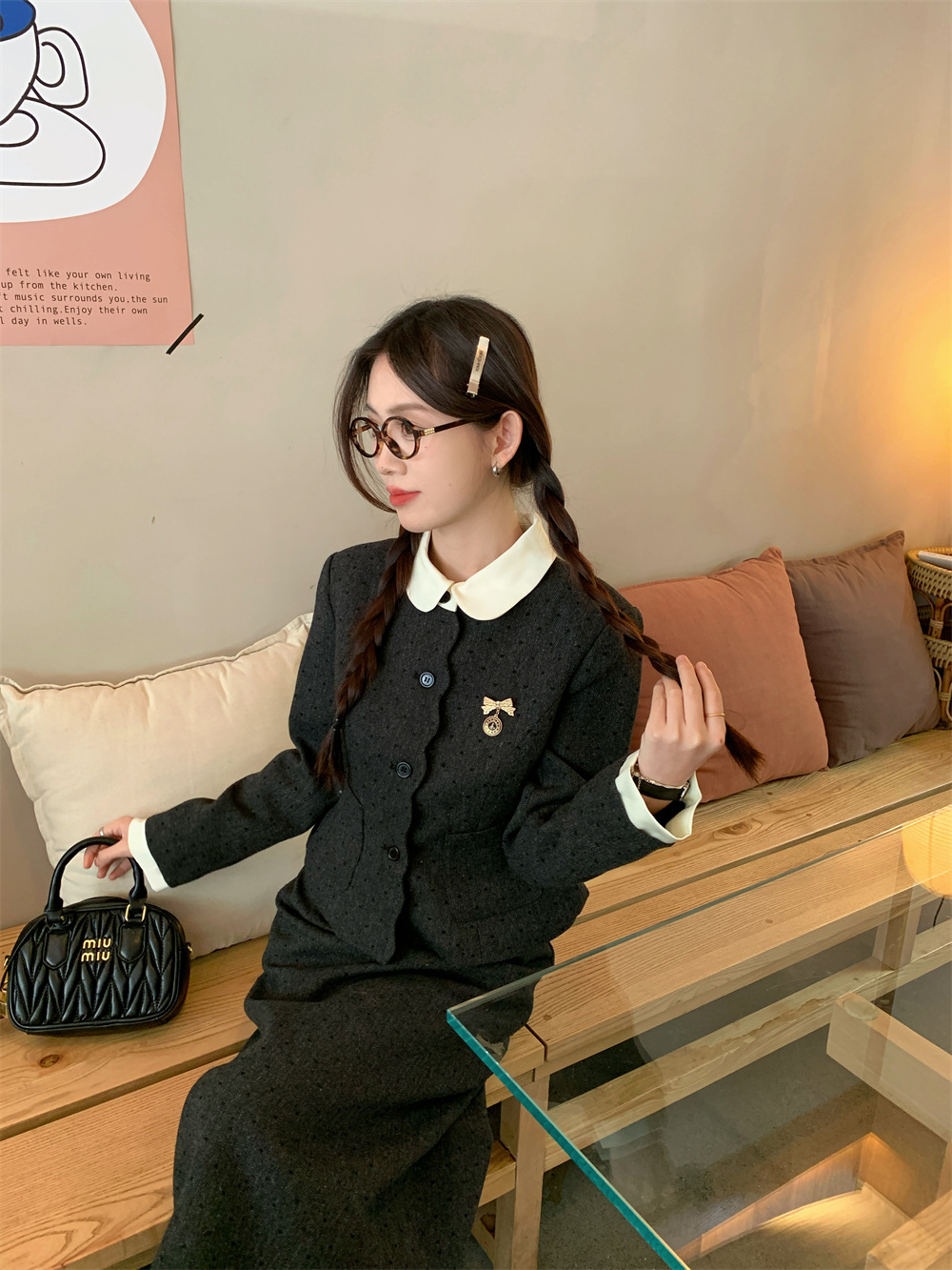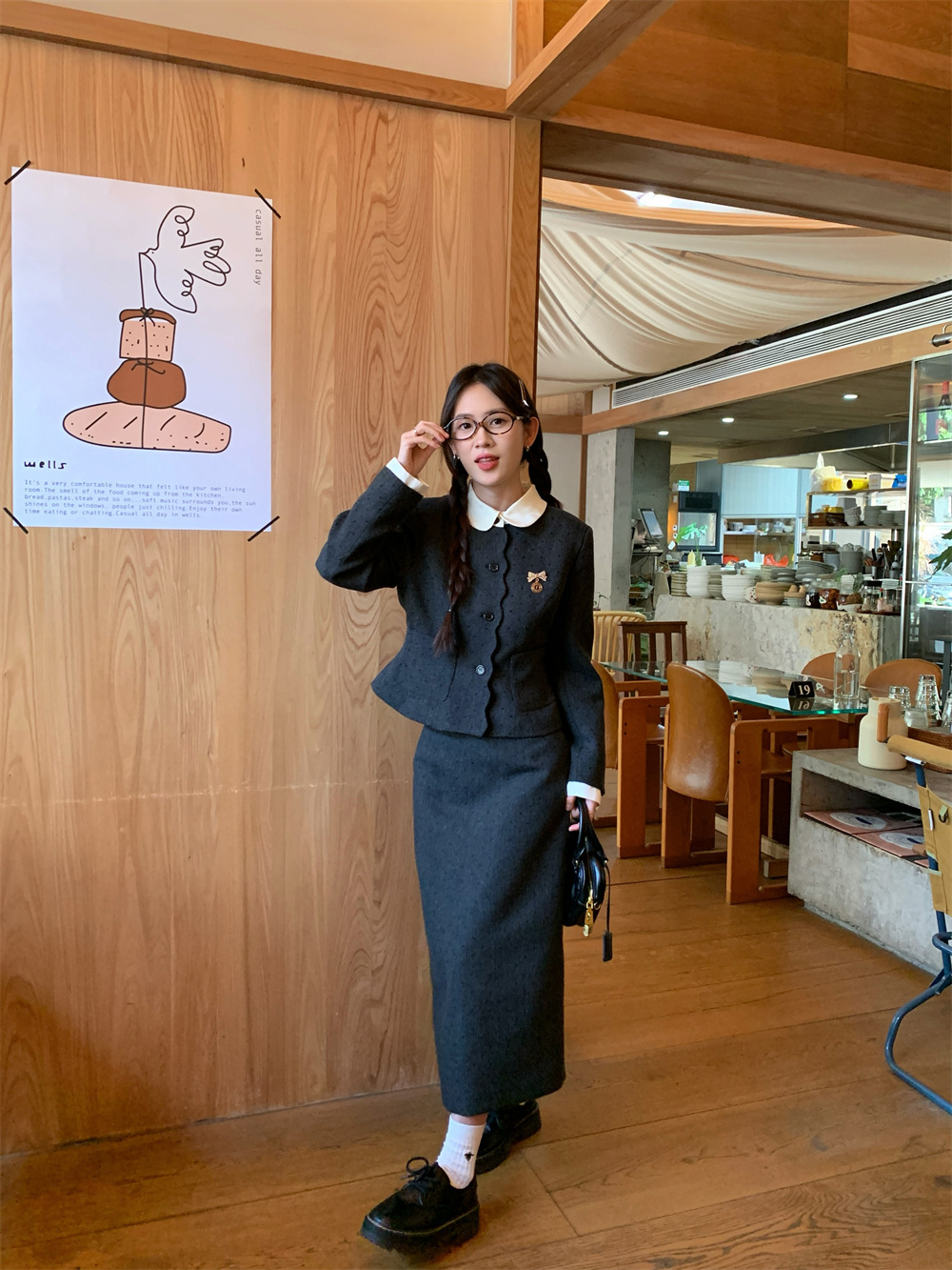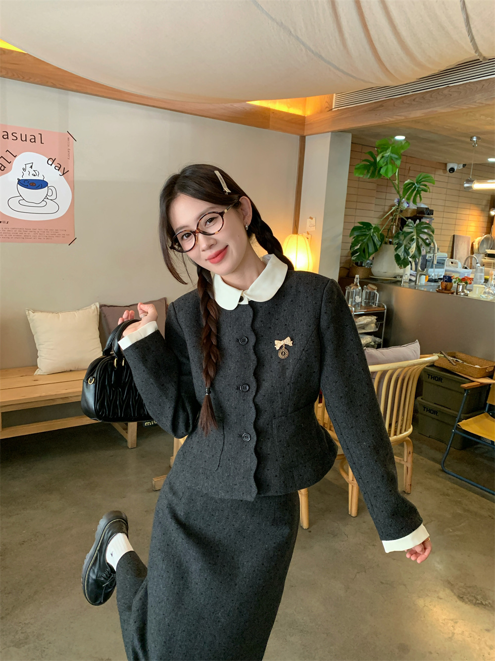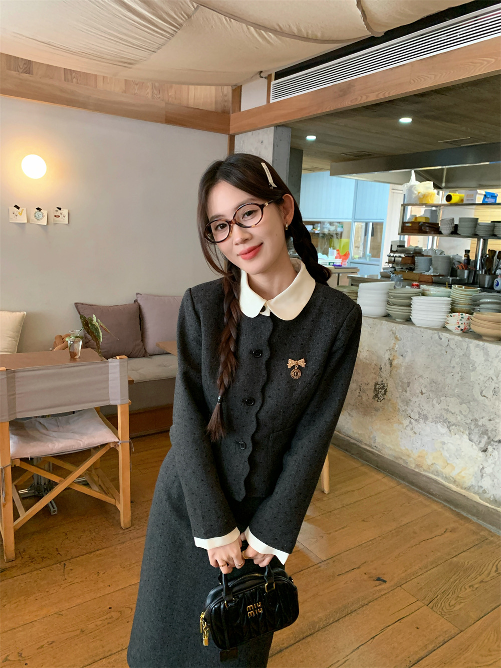 진짜 가을 겨울 새로운 프랑스 회색 작은 향기로운 스타일 코튼 코트 여성용 스트레이트 스커트 투피스 세트 74769