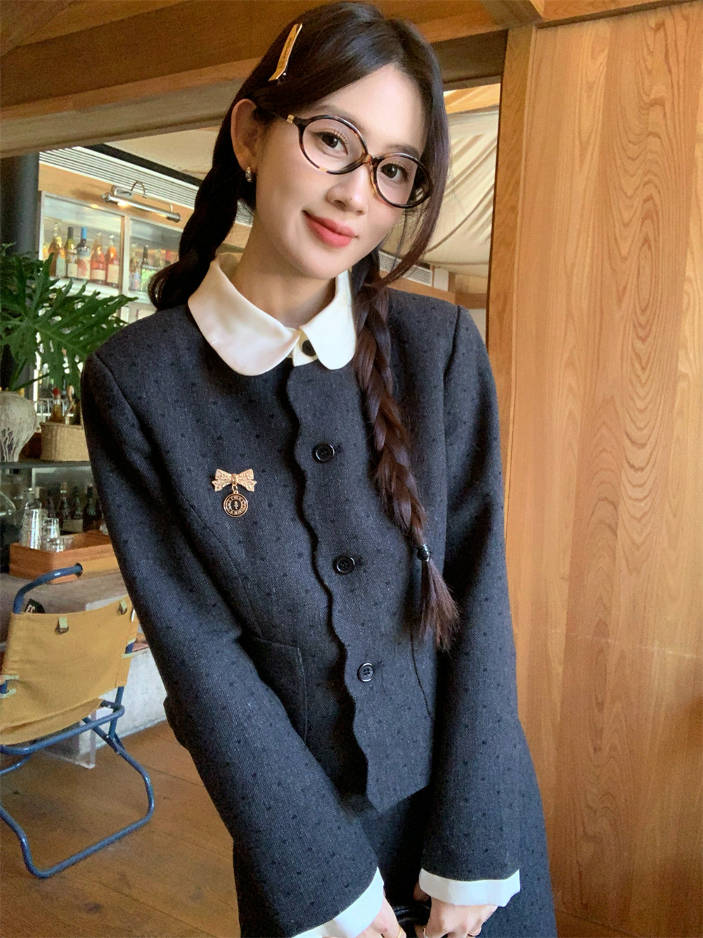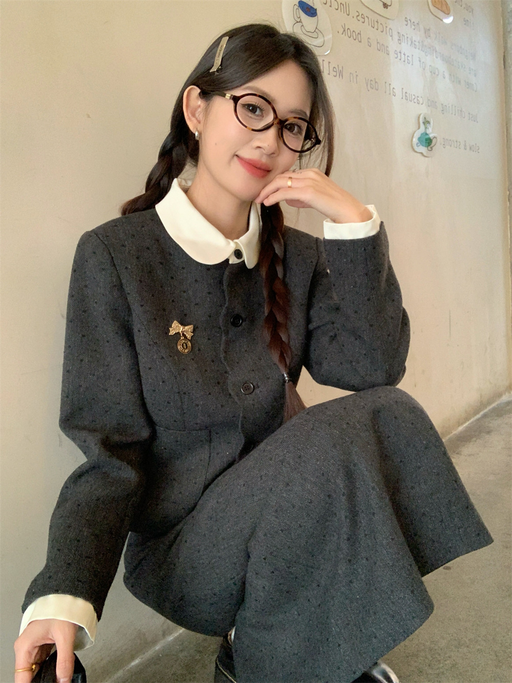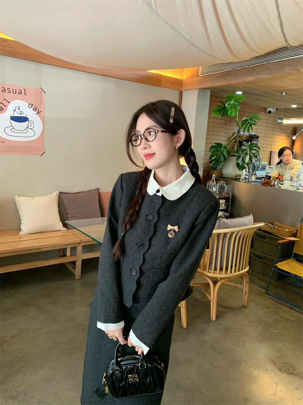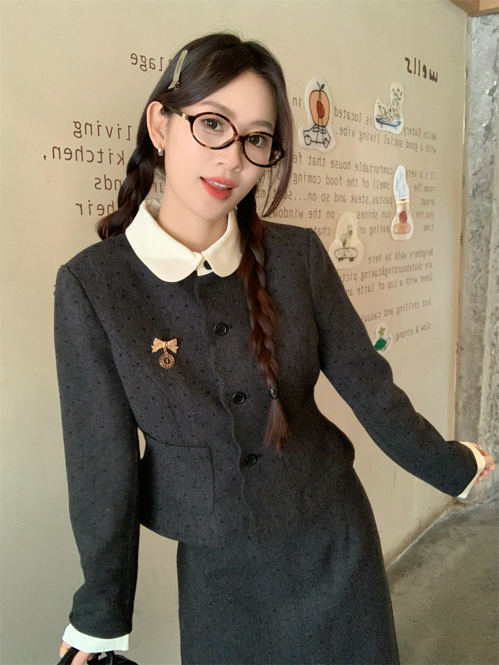 진짜 가을 겨울 새로운 프랑스 회색 작은 향기로운 스타일 코튼 코트 여성용 스트레이트 스커트 투피스 세트 74769