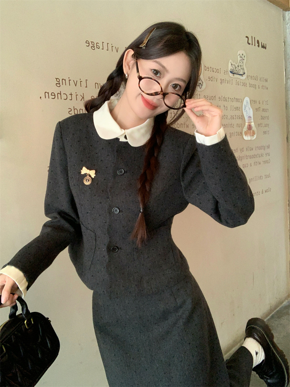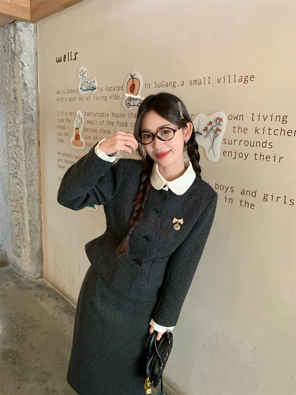 진짜 가을 겨울 새로운 프랑스 회색 작은 향기로운 스타일 코튼 코트 여성용 스트레이트 스커트 투피스 세트 74769스토어 가기