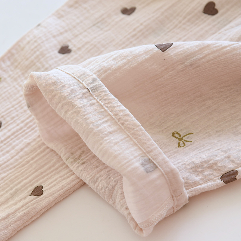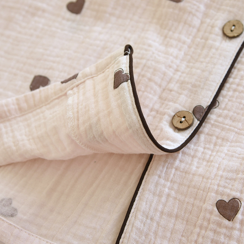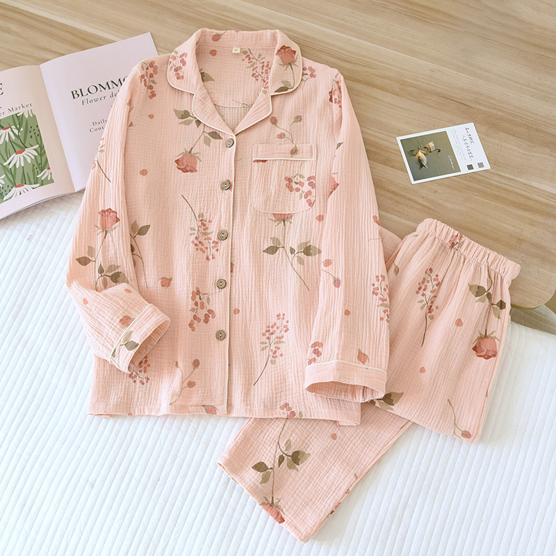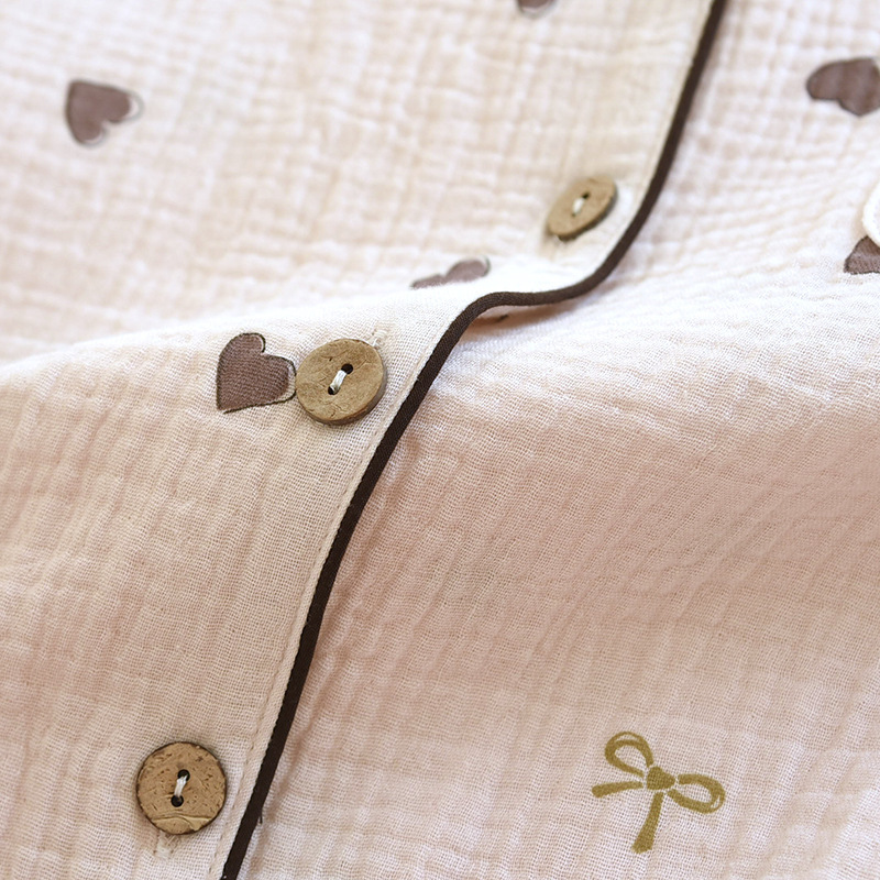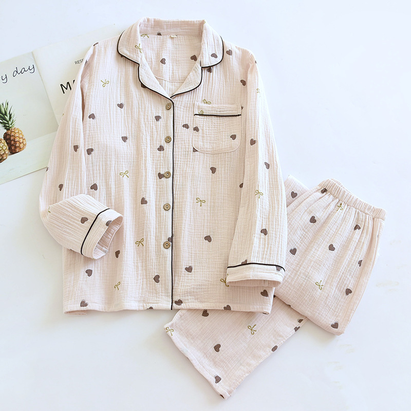 4중 크레이프 원단으로 제작된 사랑스러운 카라 디자인의 잠옷 세트, 긴팔 긴바지, 면 이중 거즈, 얇은 크로스보더 홈웨어