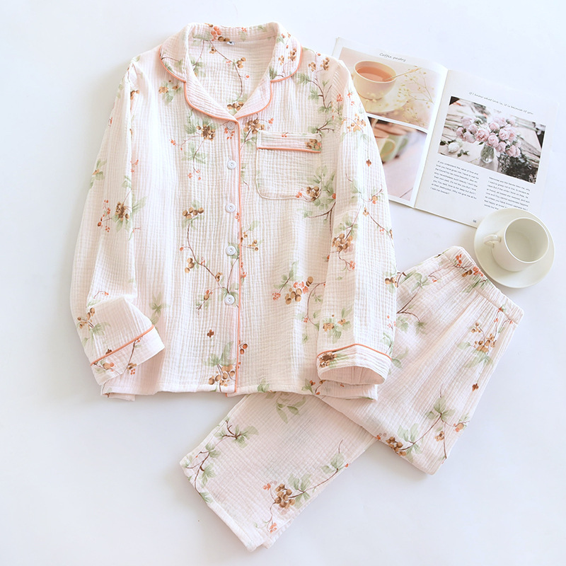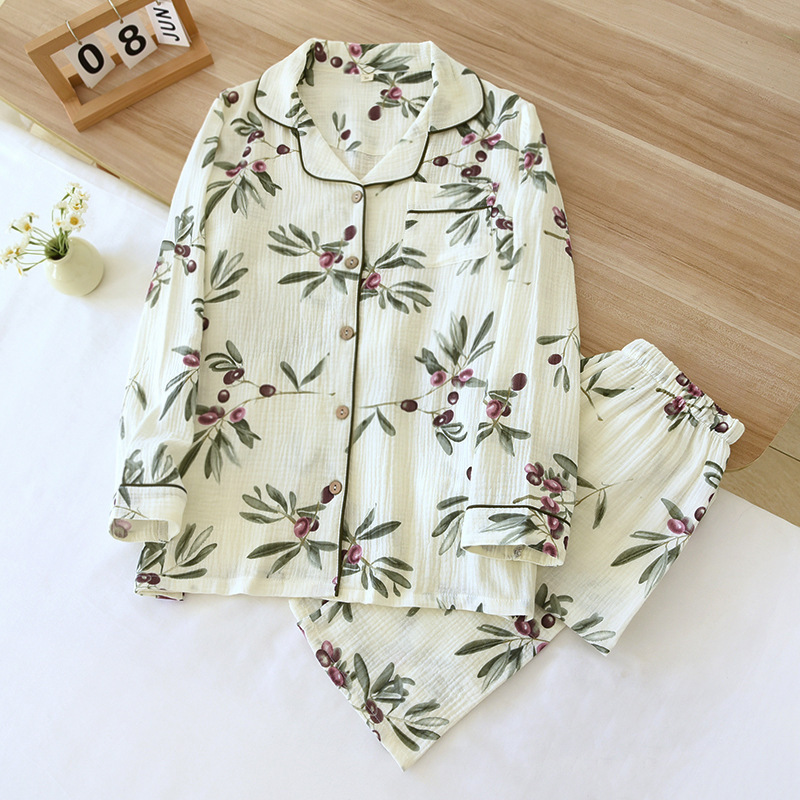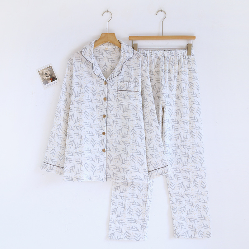 4중 크레이프 원단으로 제작된 사랑스러운 카라 디자인의 잠옷 세트, 긴팔 긴바지, 면 이중 거즈, 얇은 크로스보더 홈웨어스토어 가기