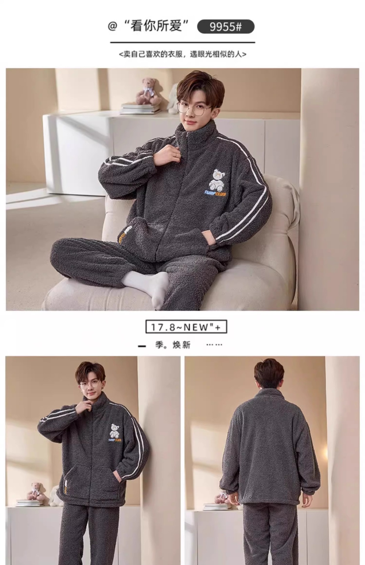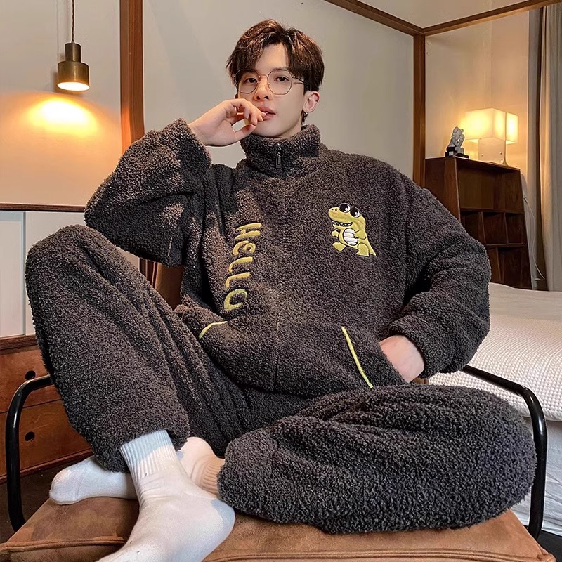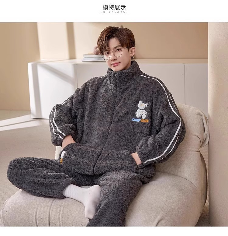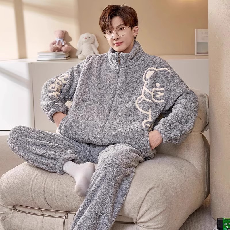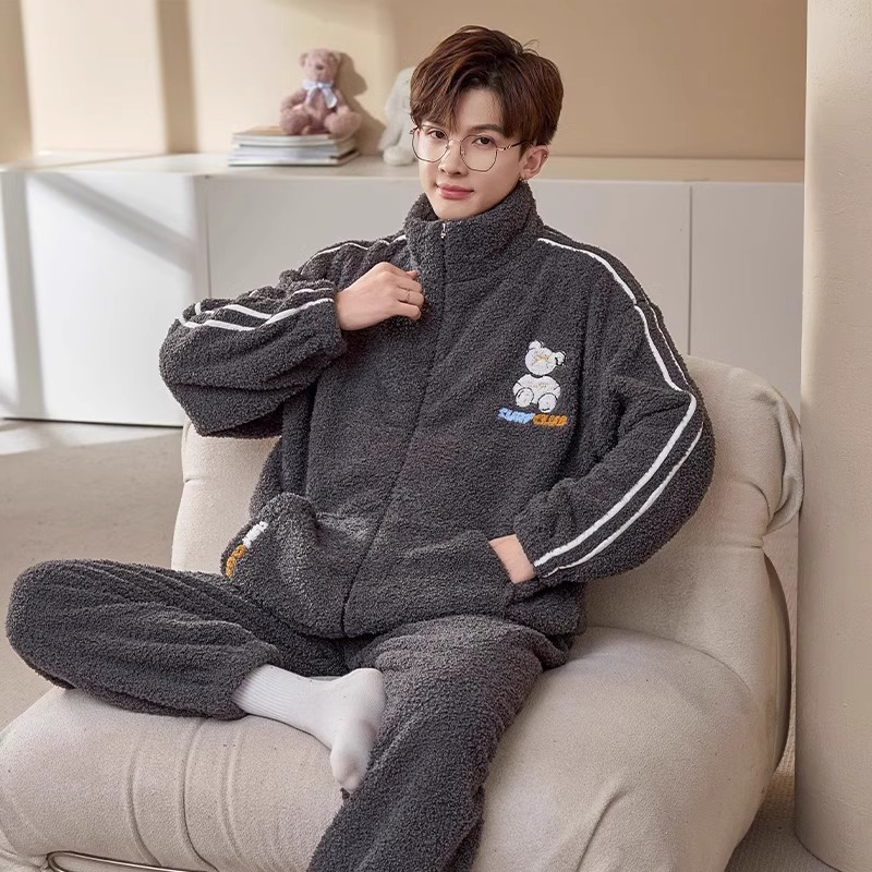 가을과 겨울 남성 양고기 양털은 겨울 세트 기모 두꺼운 잠옷 지퍼 밖에서 착용 할 수 있습니다.스토어 가기