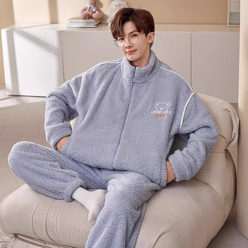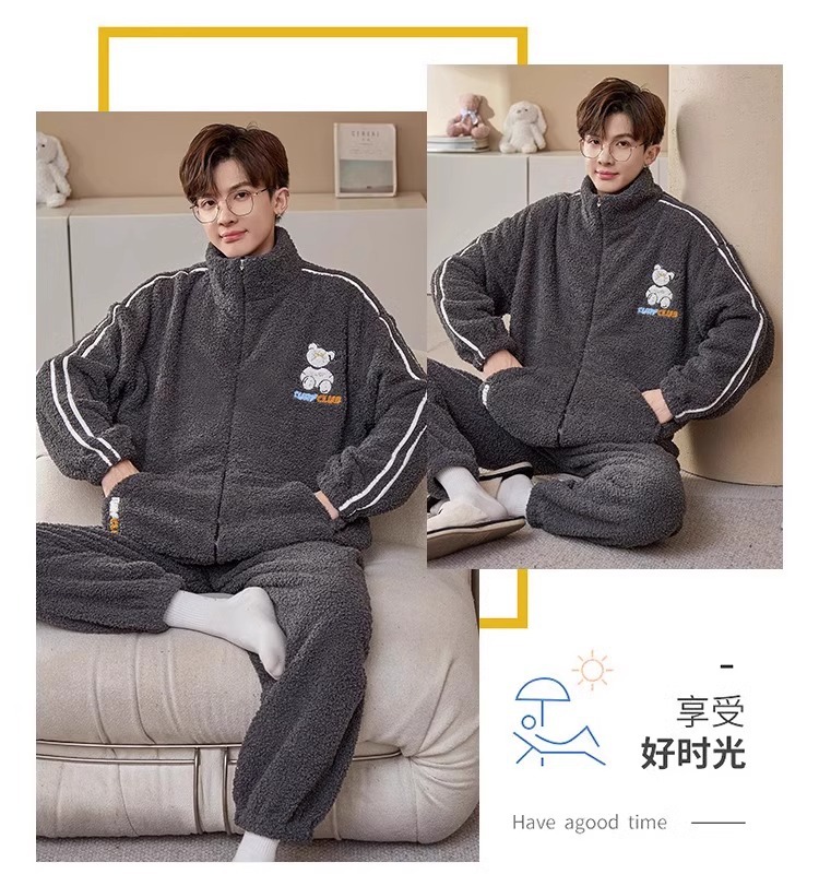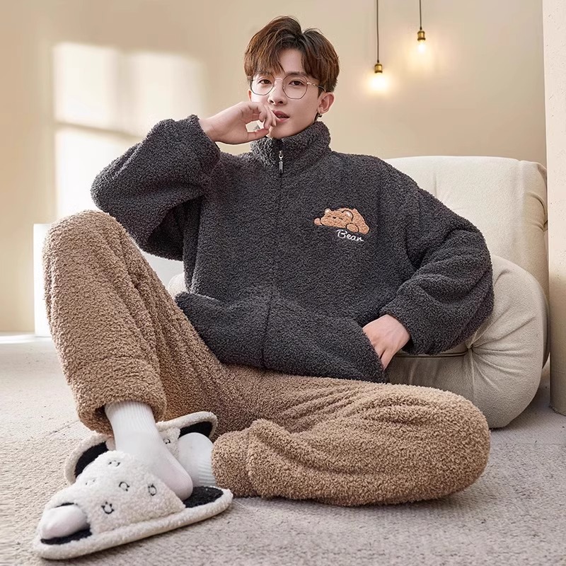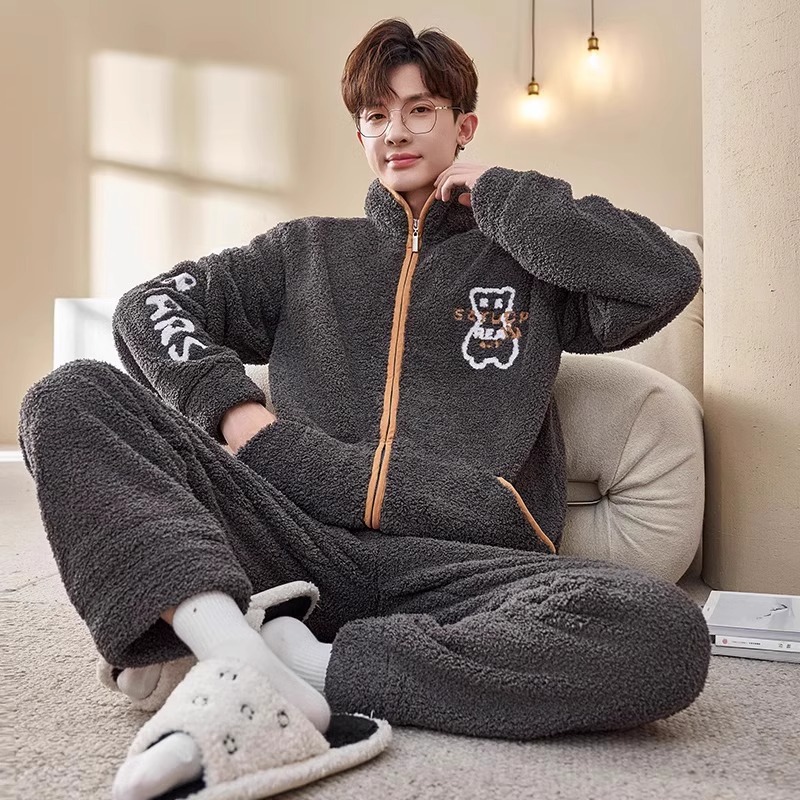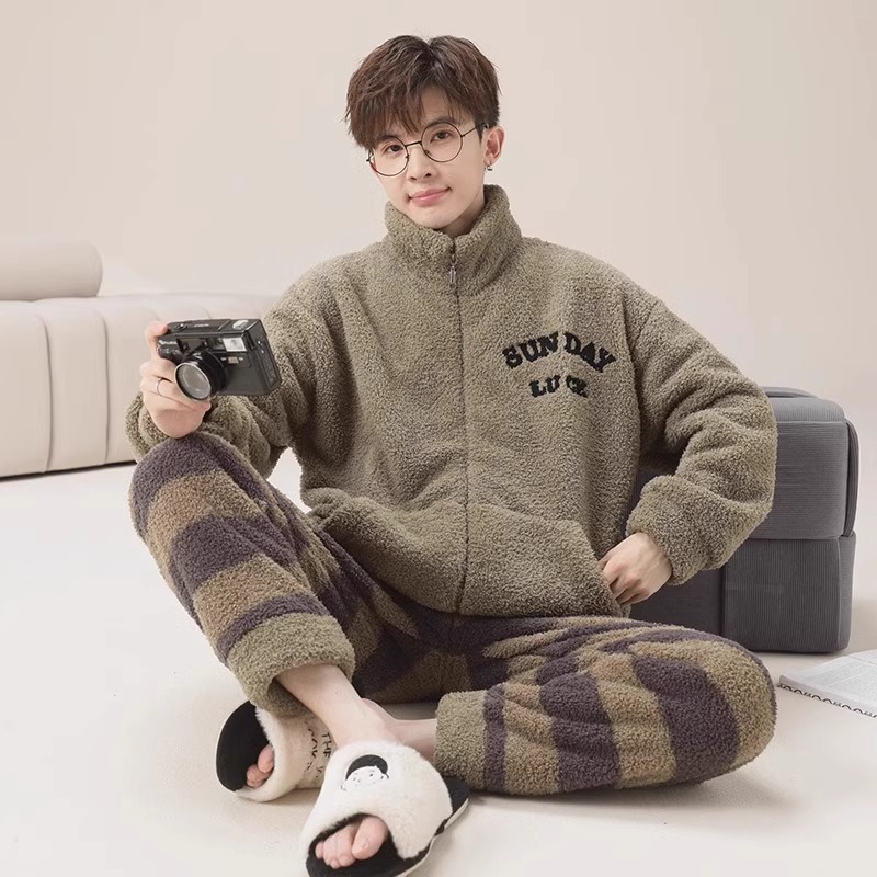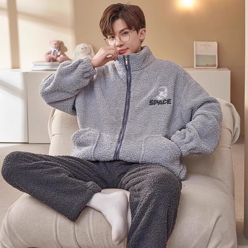 가을과 겨울 남성 양고기 양털은 겨울 세트 기모 두꺼운 잠옷 지퍼 밖에서 착용 할 수 있습니다.스토어 가기