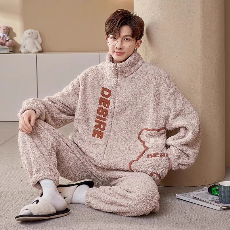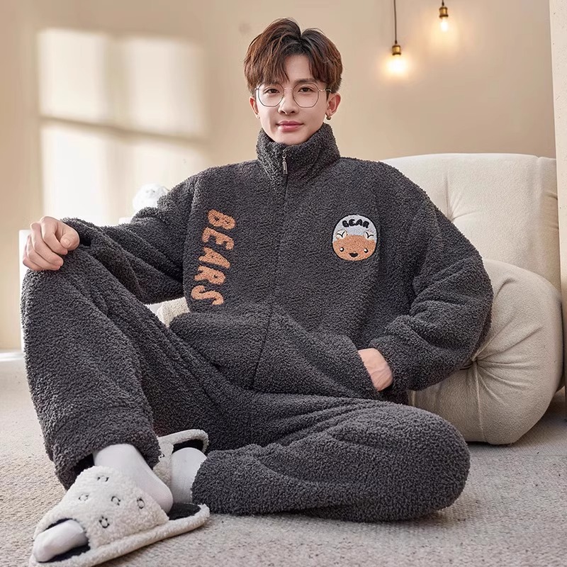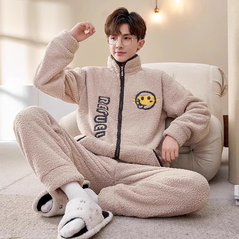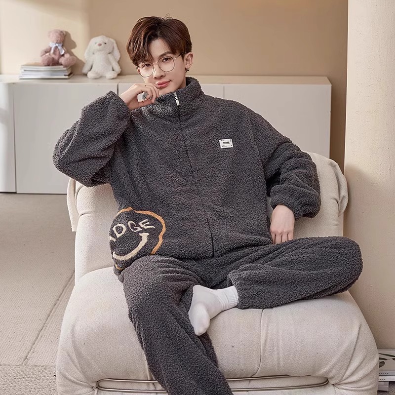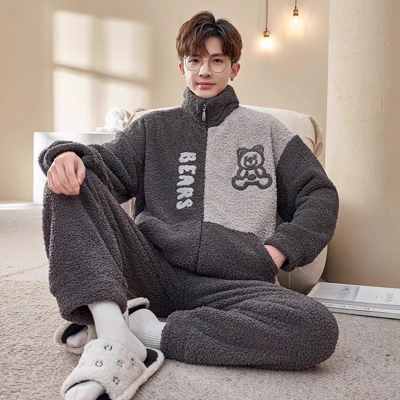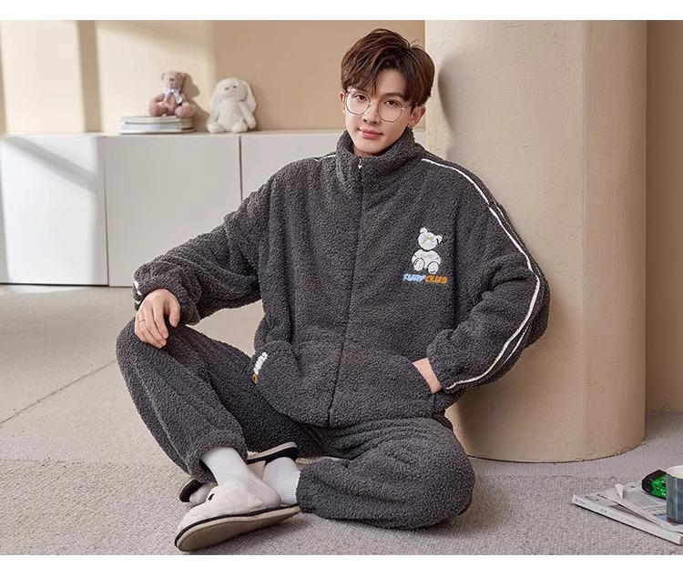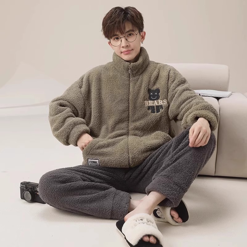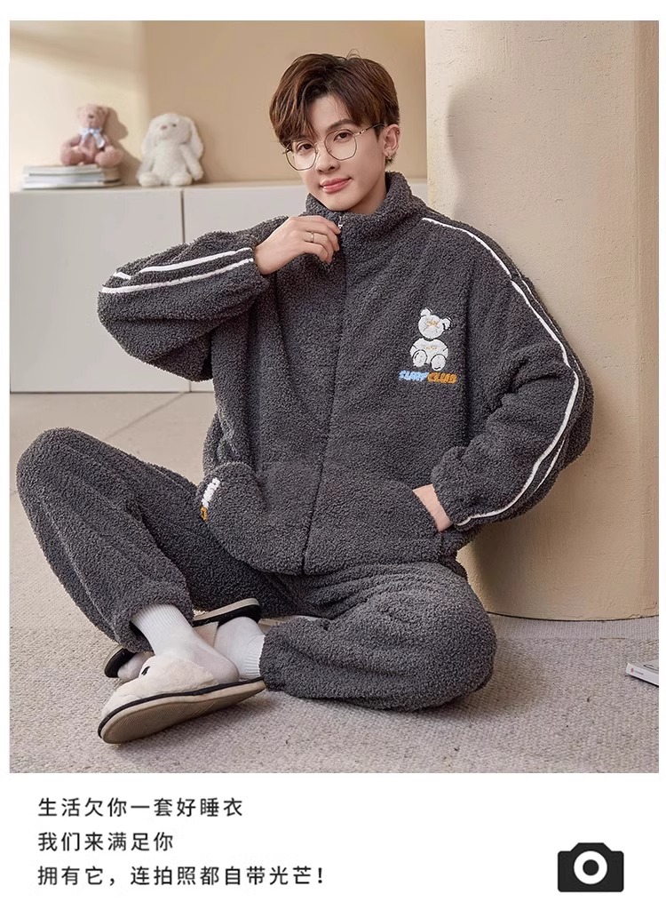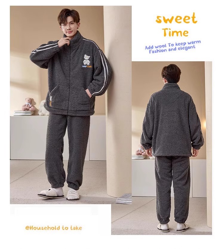 가을과 겨울 남성 양고기 양털은 겨울 세트 기모 두꺼운 잠옷 지퍼 밖에서 착용 할 수 있습니다.
