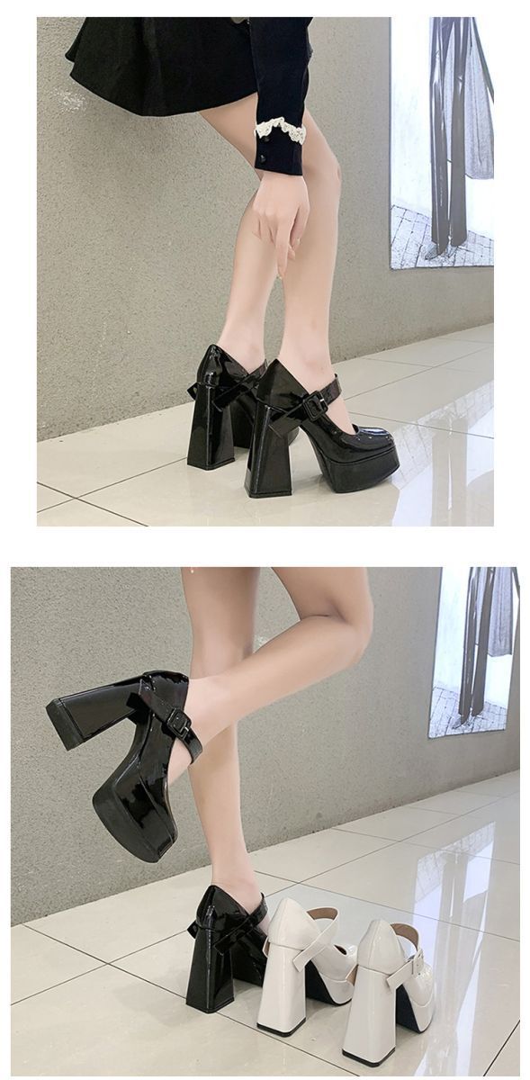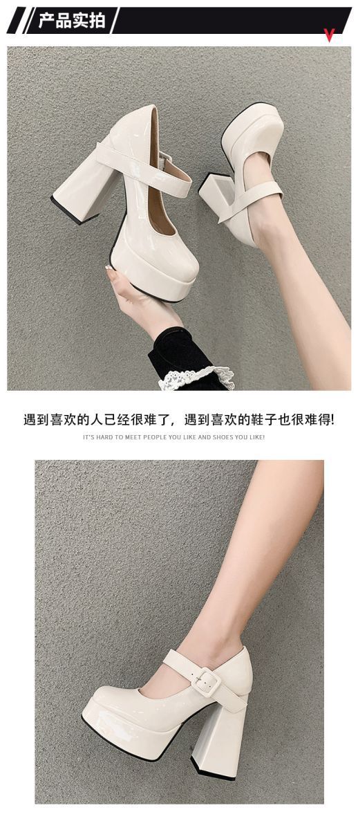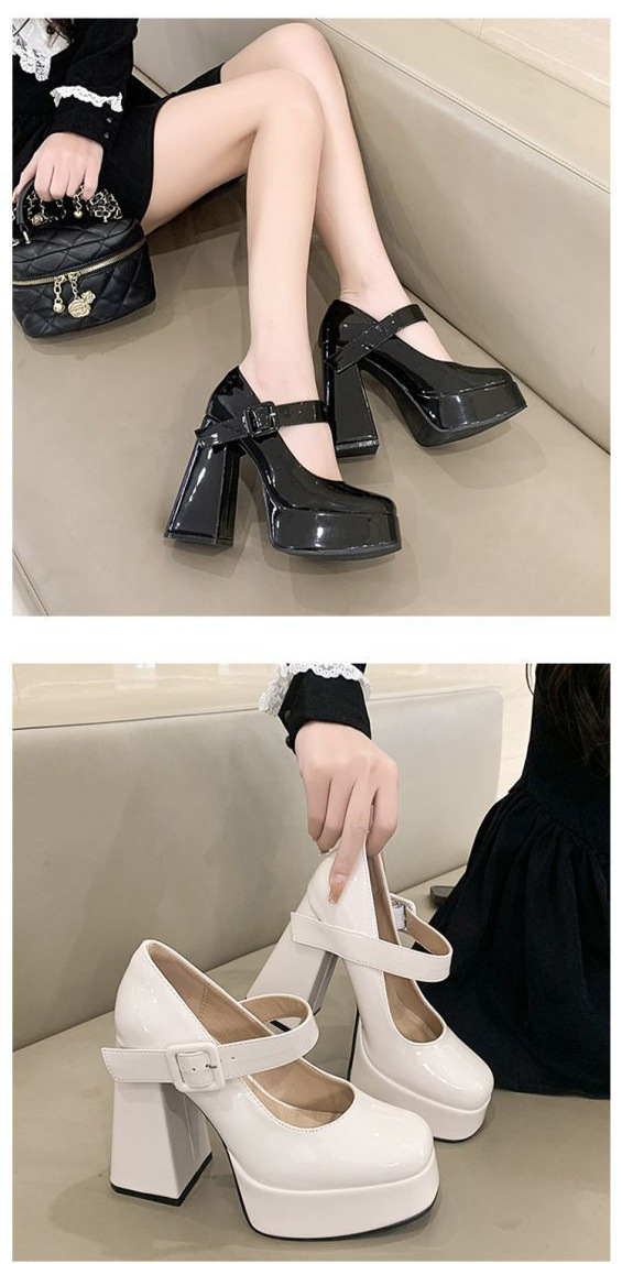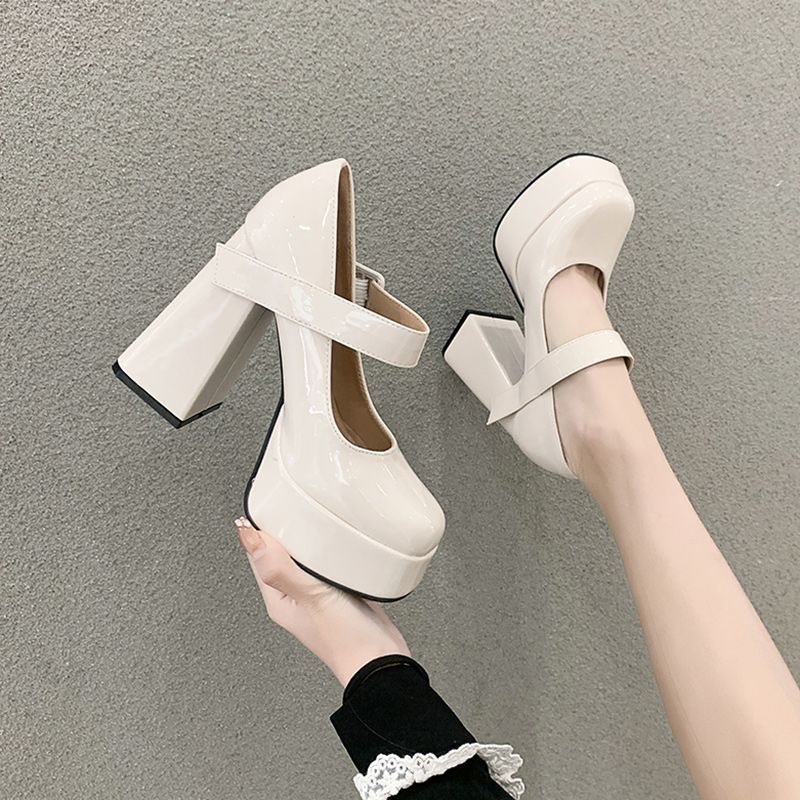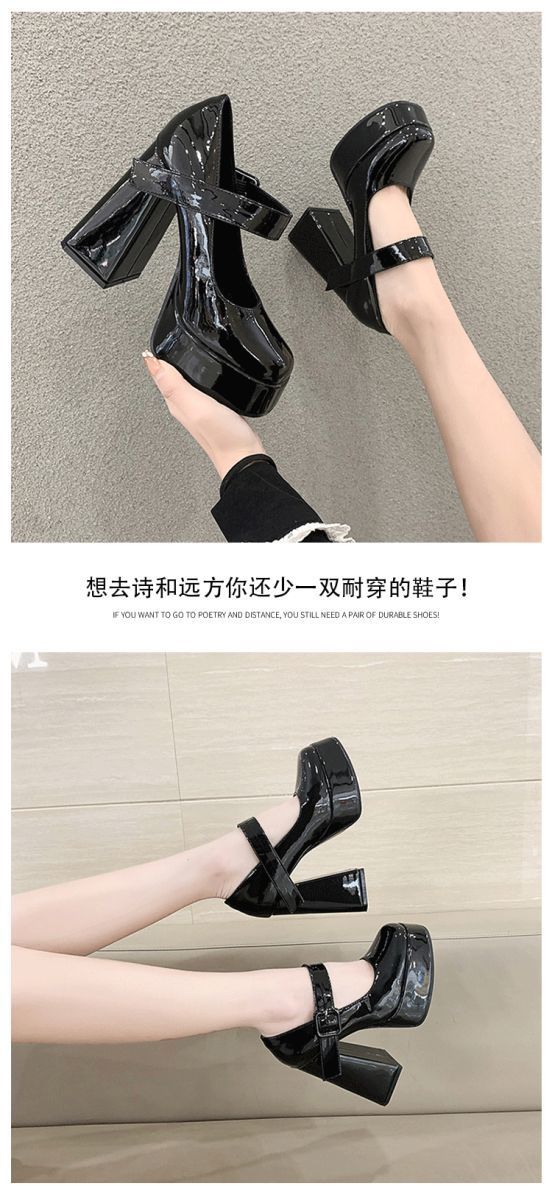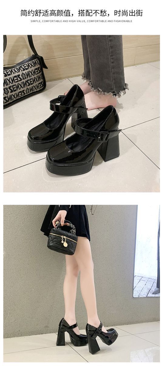 발이 피곤하지 않은 여성용 하이힐, 두꺼운 굽, 프렌치 메리제인 작은 가죽신, 방수 플랫폼 힐, 페이턴트 가죽 슈즈스토어 가기